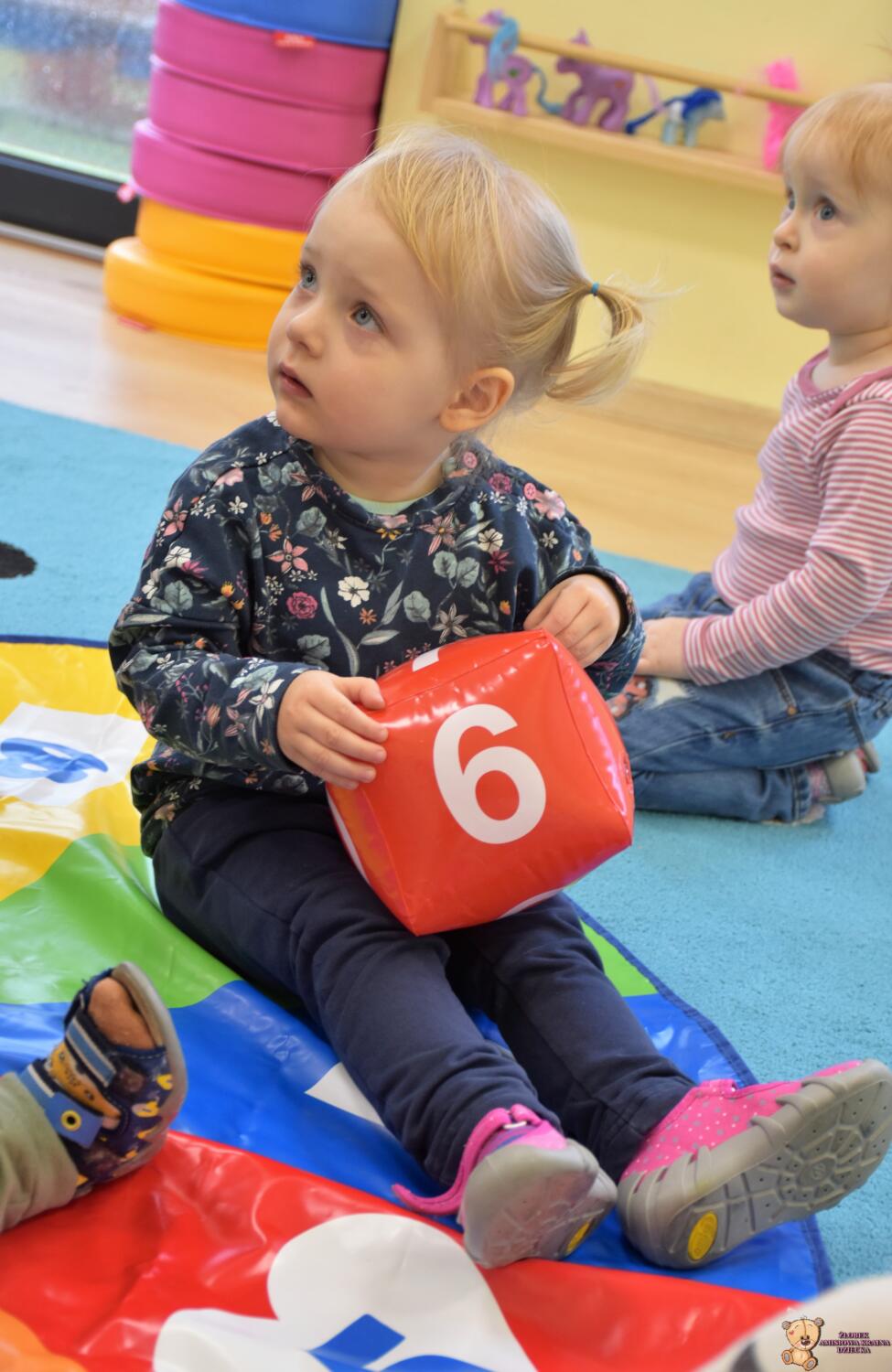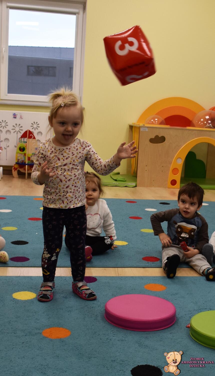 . Ciocia przygotowała pola a my byliśmy pionkami i przemieszczaliśmy się po nich. Najpierw liczyliśmy a później zmienialiśmy się kolorami. Maluszki również grały ich zadaniem było znaleźć pole które wskazywała kostka. Wszystkim podobał się taka formą zabawy.