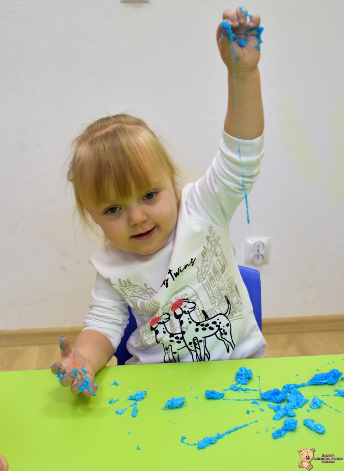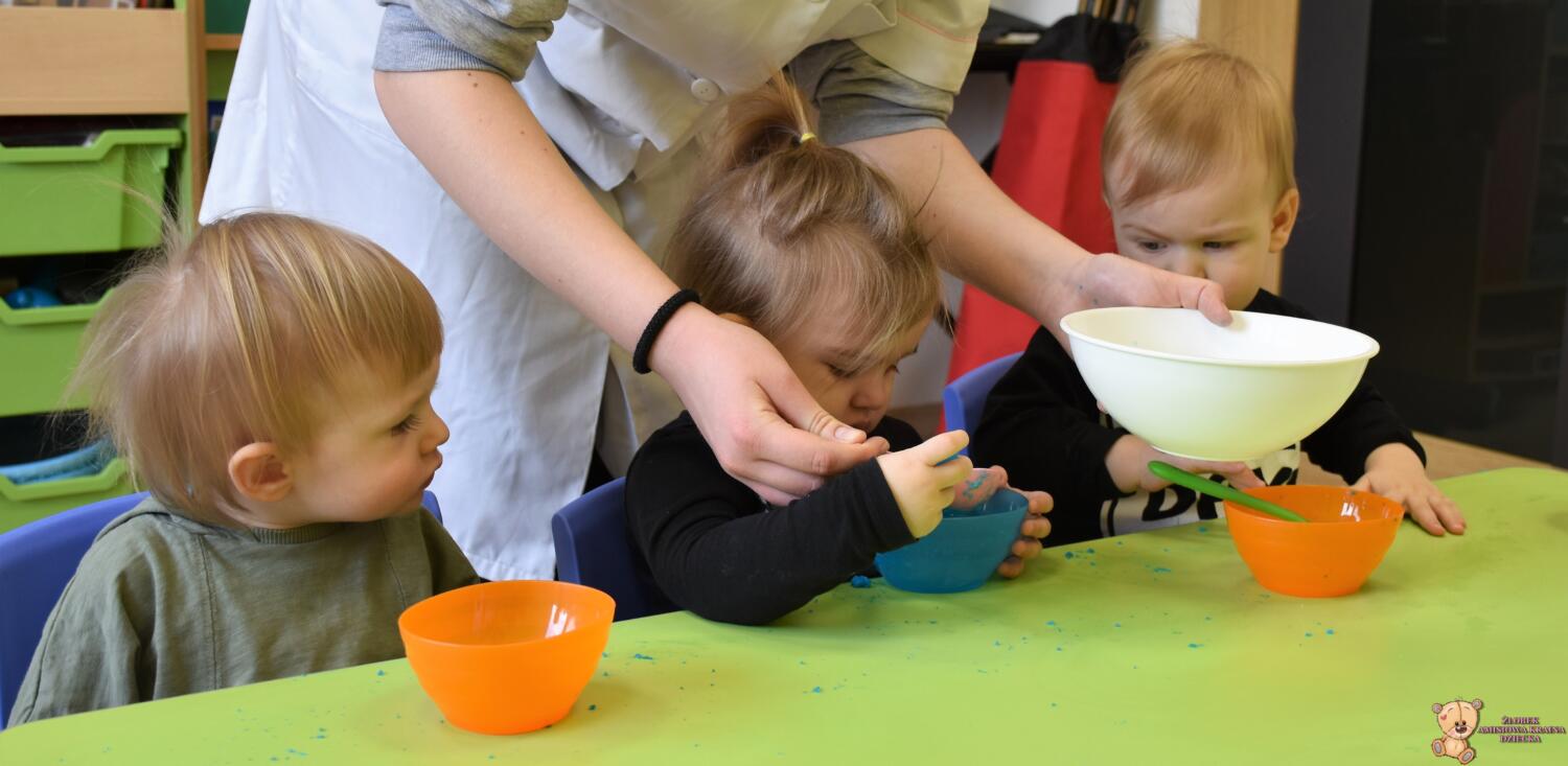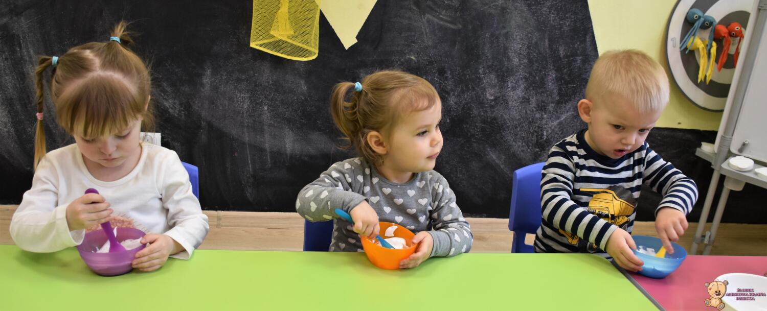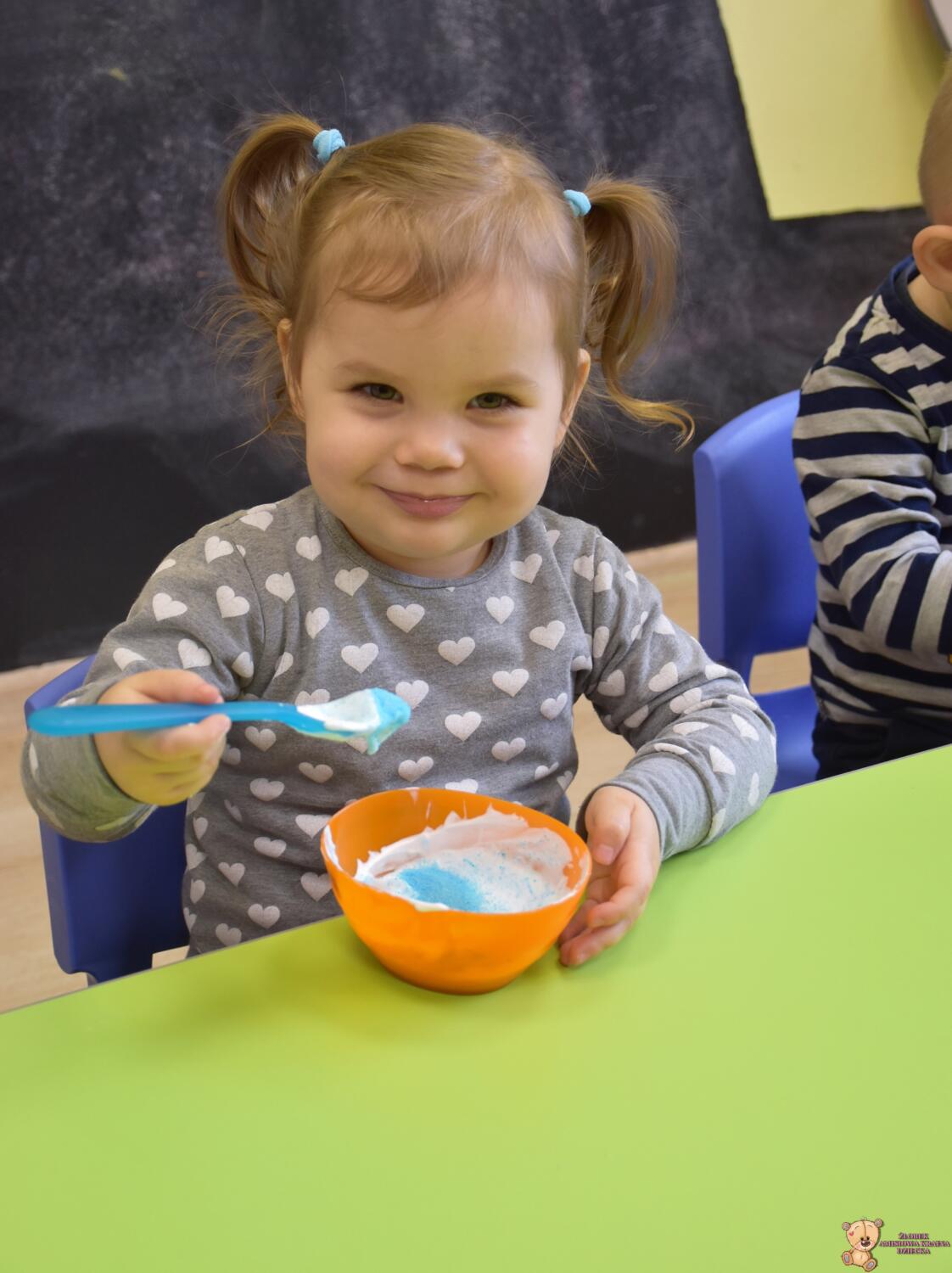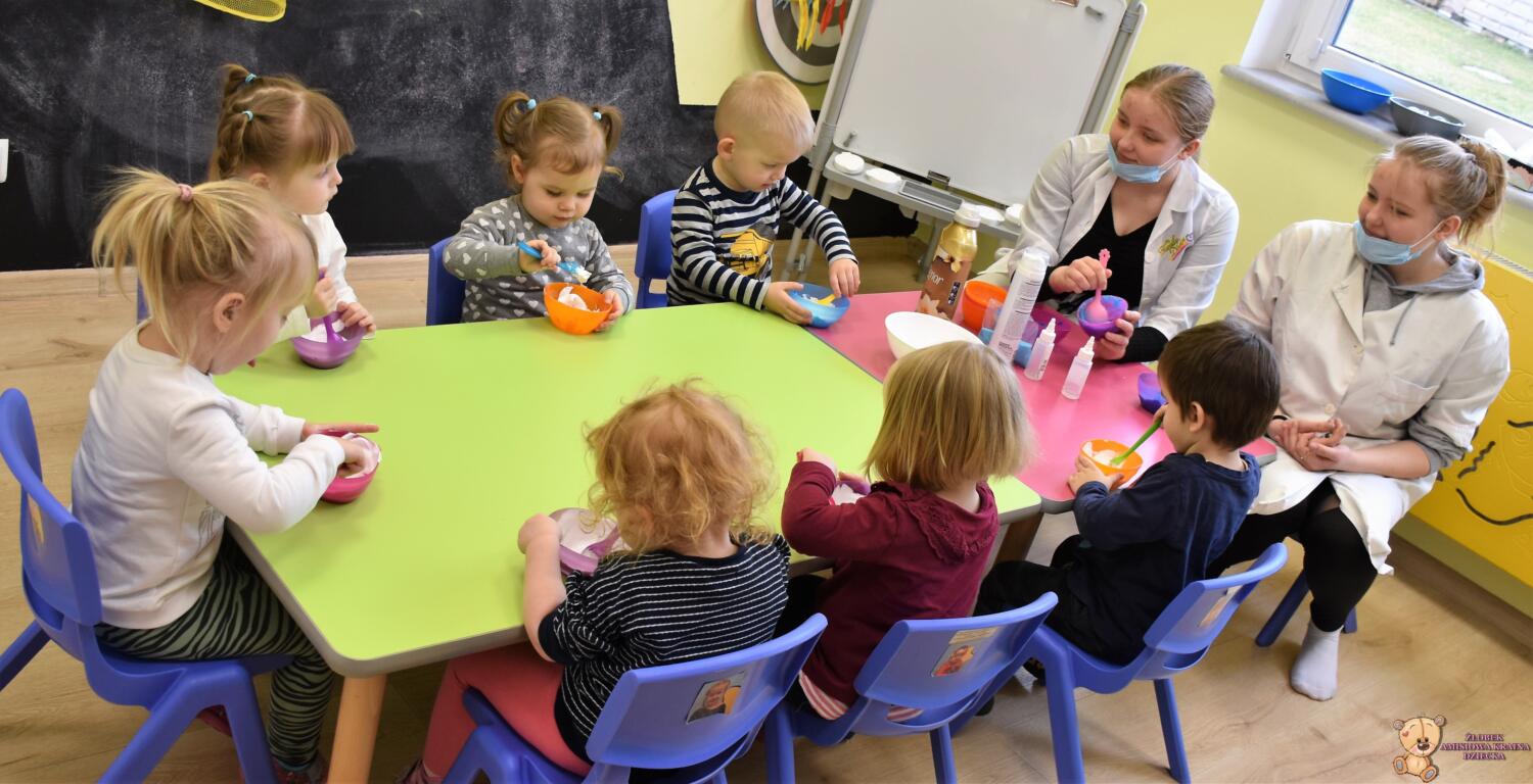 Dzisiaj w naszym żłobku wykonywaliśmy higienę w eksperymentach. Nasz nos ma wiele funkcji m.in : odpowiada za odczuwanie zapachów i ogrzewa powietrze zanim trafi do płuc. Występujące w nim włoski i śluz pomagają również wyłapać zanieczyszczenia, które znajdują się w powietrzu. Poprzez wykonanie eksperymentu dowiedzieliśmy się jak działa śluz. Wolontariuszki Daria i Wiktoria przygotowały z Nami „ gluta” z kleju, wody , płynu do płukania i brokatu. Opowiedziały Nam, że katar i zatkany, utrudnia przepływ powietrza przez co np. potrawy nie mają takiego smaku i aromatu jak na co dzień. Zarazki , które gromadzą się w nosie mogą również sprawić, że nie czujemy zapachów. Na koniec otrzymaliśmy oznaki z akademii czyściocha, które zabierzemy do domu.