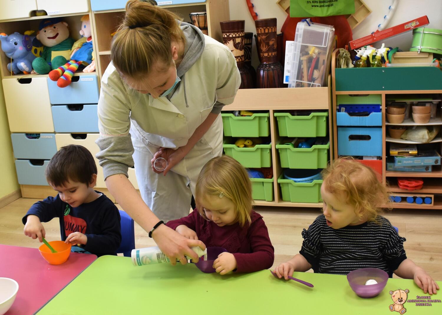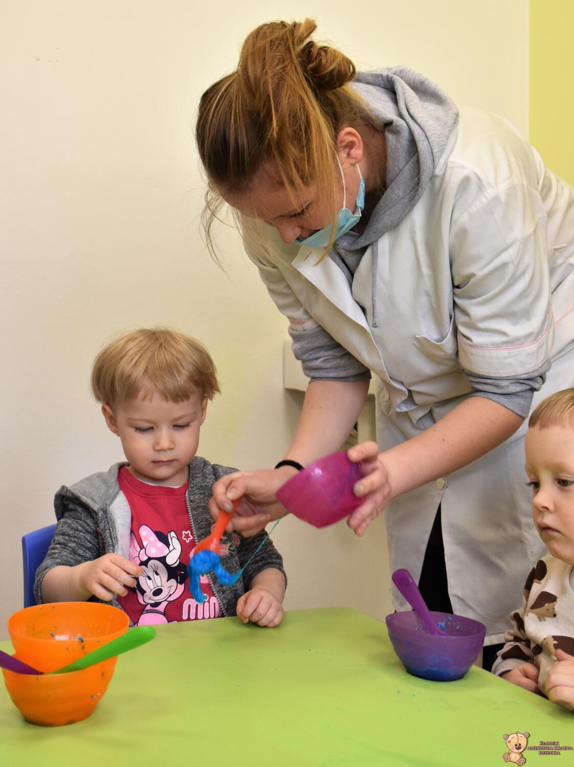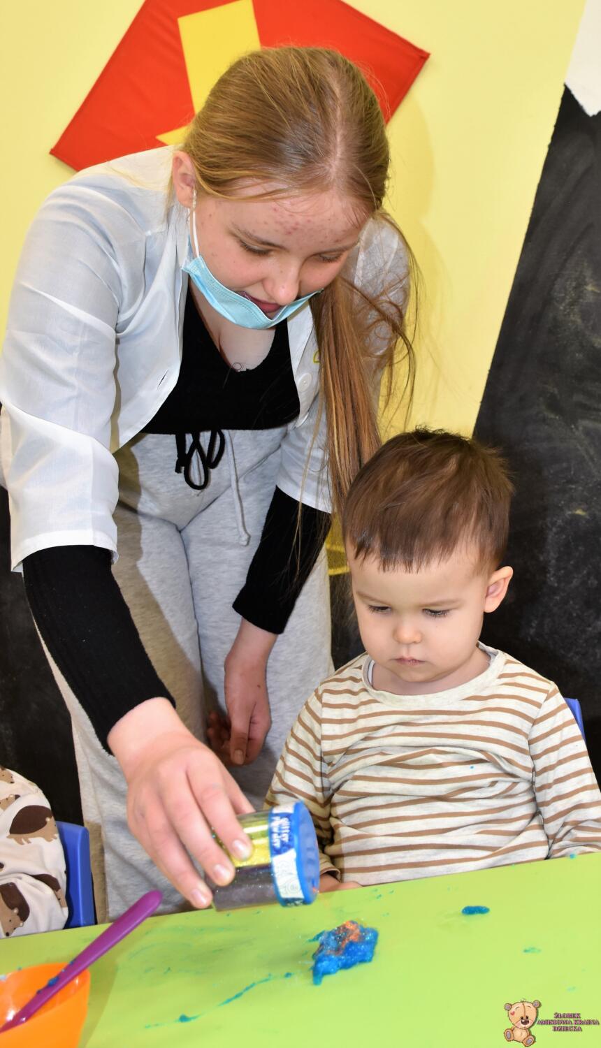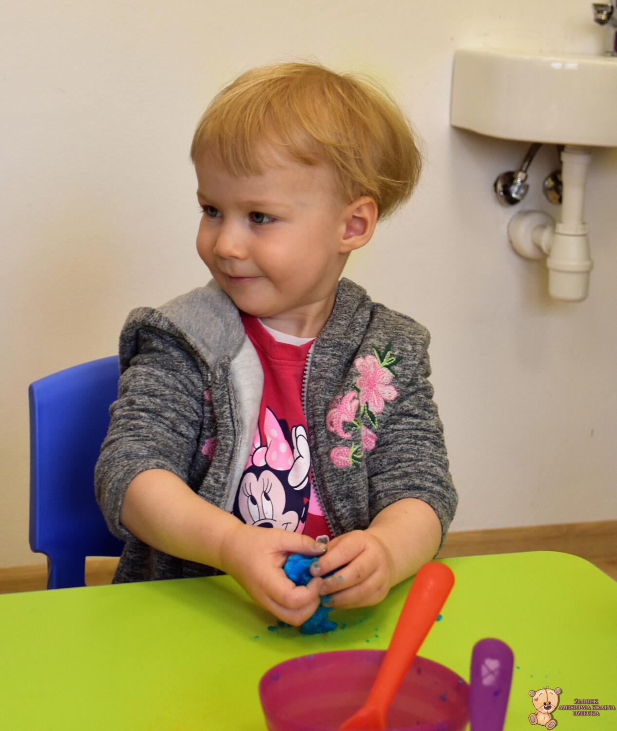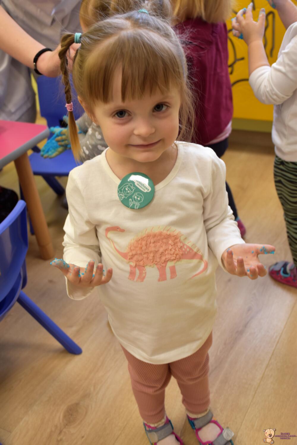 Dzisiaj w naszym żłobku wykonywaliśmy higienę w eksperymentach. Nasz nos ma wiele funkcji m.in : odpowiada za odczuwanie zapachów i ogrzewa powietrze zanim trafi do płuc. Występujące w nim włoski i śluz pomagają również wyłapać zanieczyszczenia, które znajdują się w powietrzu. Poprzez wykonanie eksperymentu dowiedzieliśmy się jak działa śluz. Wolontariuszki Daria i Wiktoria przygotowały z Nami „ gluta” z kleju, wody , płynu do płukania i brokatu. Opowiedziały Nam, że katar i zatkany, utrudnia przepływ powietrza przez co np. potrawy nie mają takiego smaku i aromatu jak na co dzień. Zarazki , które gromadzą się w nosie mogą również sprawić, że nie czujemy zapachów. Na koniec otrzymaliśmy oznaki z akademii czyściocha, które zabierzemy do domu.