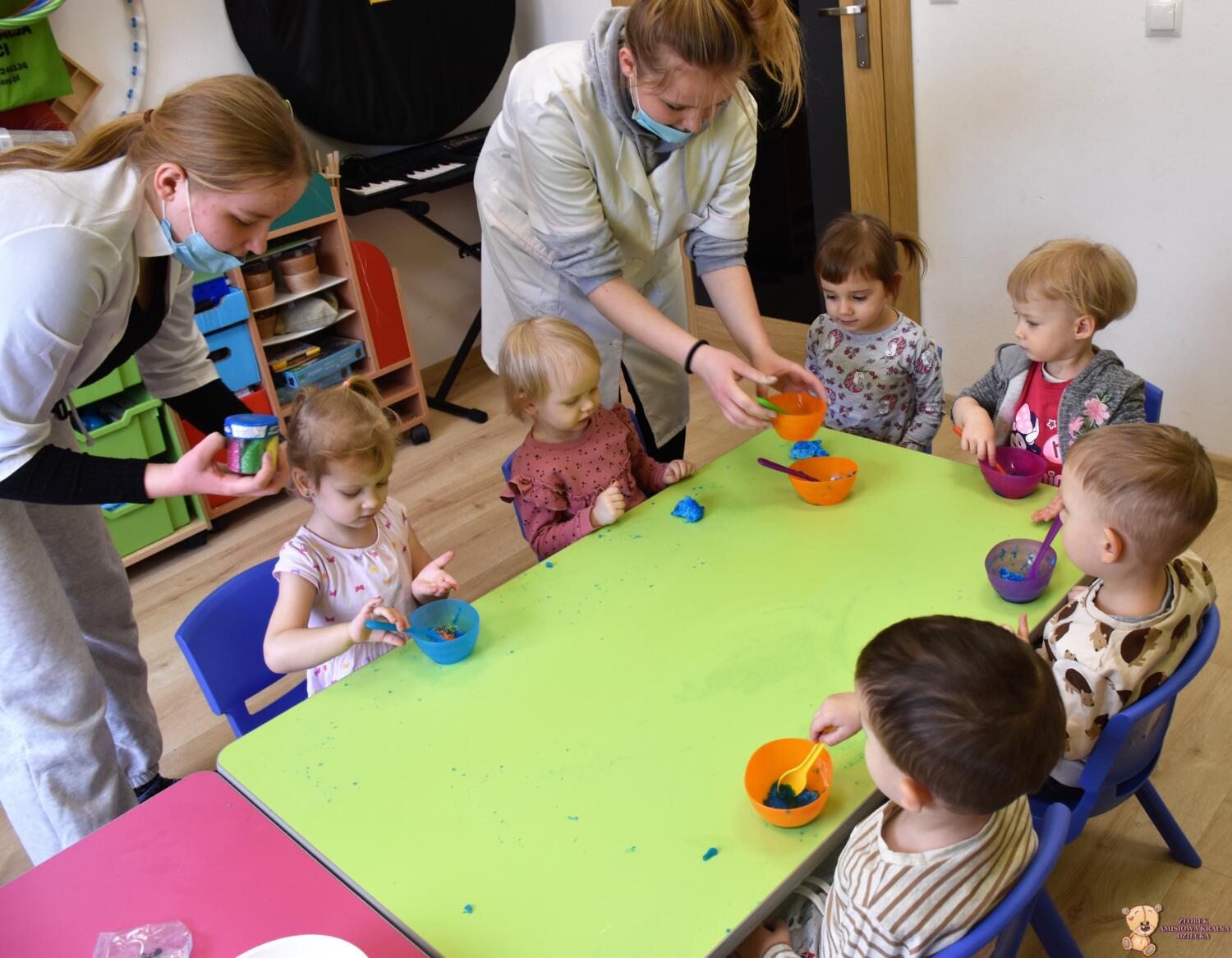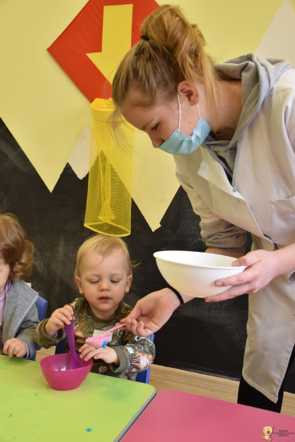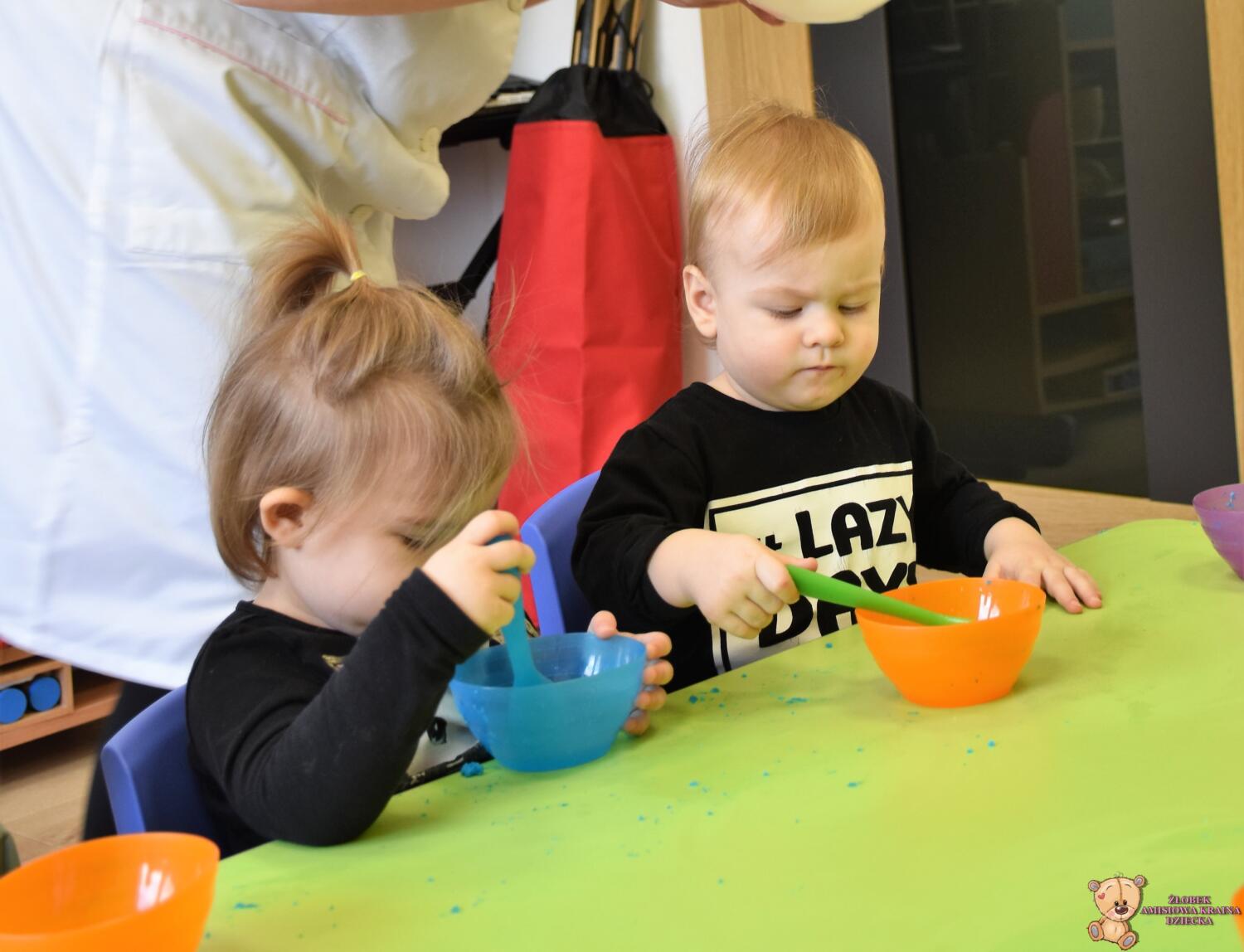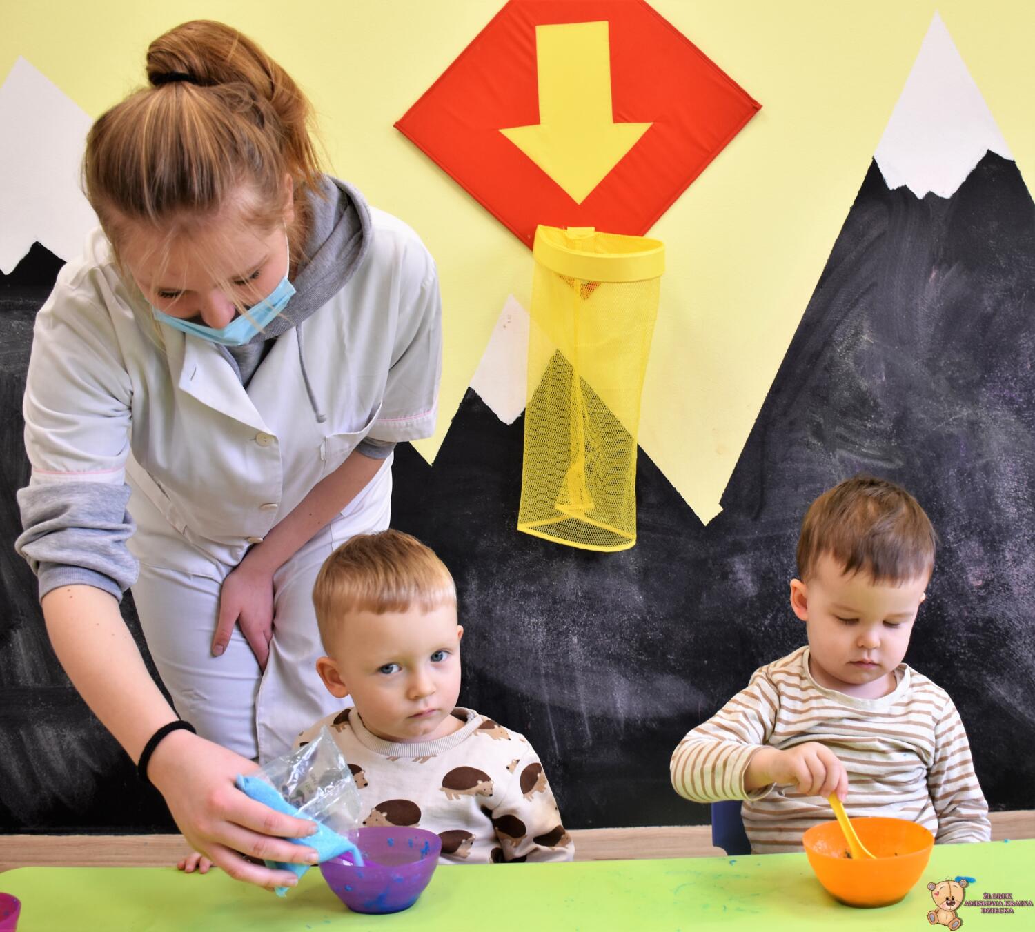 Dzisiaj w naszym żłobku wykonywaliśmy higienę w eksperymentach. Nasz nos ma wiele funkcji m.in : odpowiada za odczuwanie zapachów i ogrzewa powietrze zanim trafi do płuc. Występujące w nim włoski i śluz pomagają również wyłapać zanieczyszczenia, które znajdują się w powietrzu. Poprzez wykonanie eksperymentu dowiedzieliśmy się jak działa śluz. Wolontariuszki Daria i Wiktoria przygotowały z Nami „ gluta” z kleju, wody , płynu do płukania i brokatu. Opowiedziały Nam, że katar i zatkany, utrudnia przepływ powietrza przez co np. potrawy nie mają takiego smaku i aromatu jak na co dzień. Zarazki , które gromadzą się w nosie mogą również sprawić, że nie czujemy zapachów. Na koniec otrzymaliśmy oznaki z akademii czyściocha, które zabierzemy do domu.