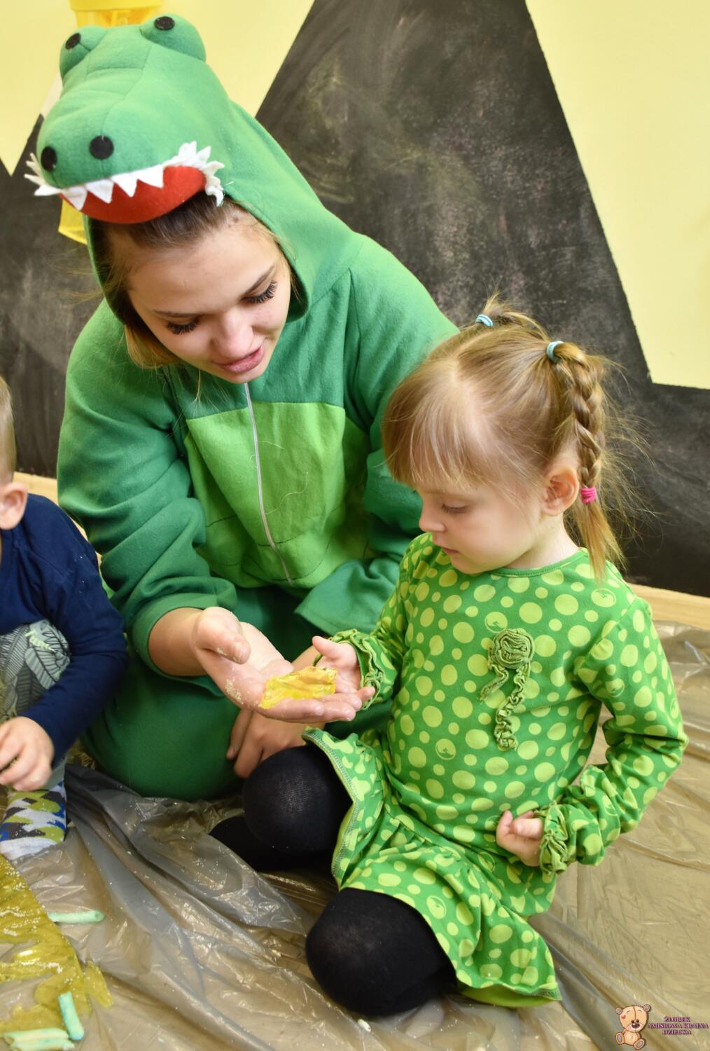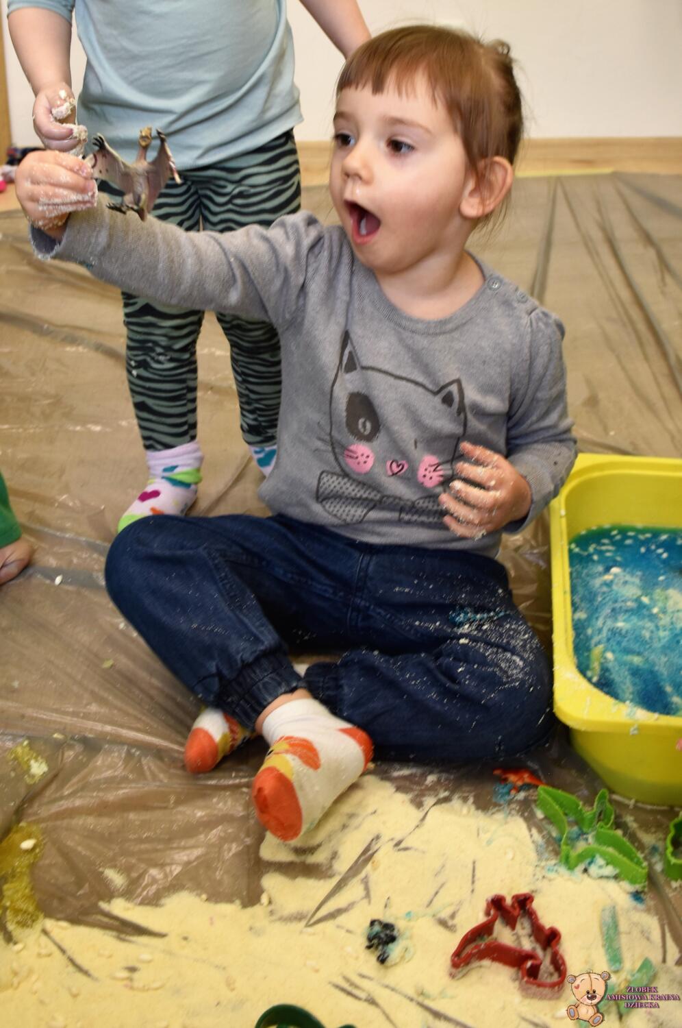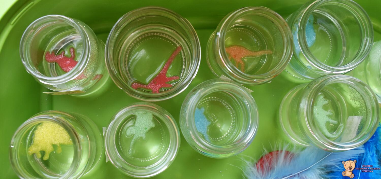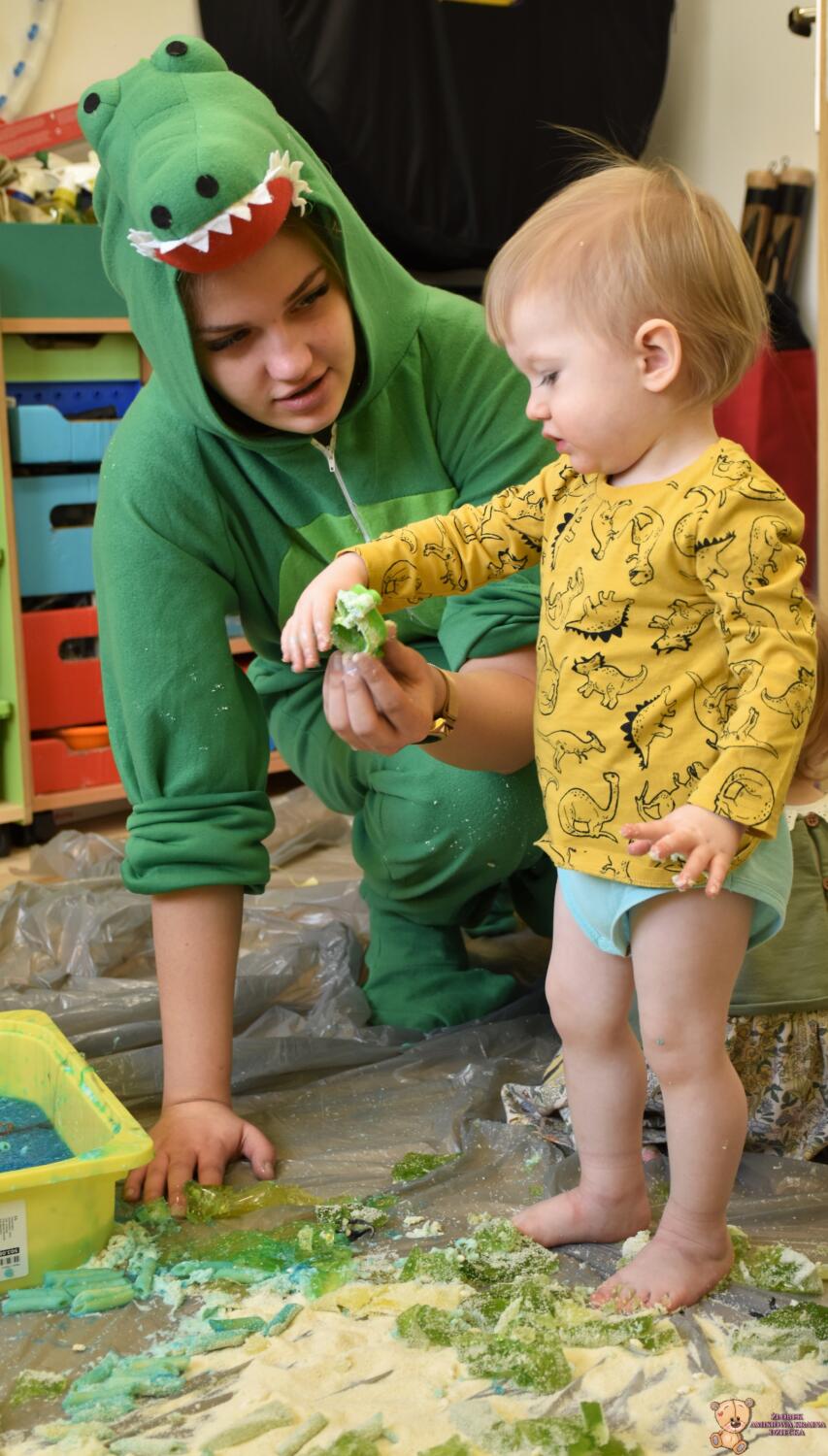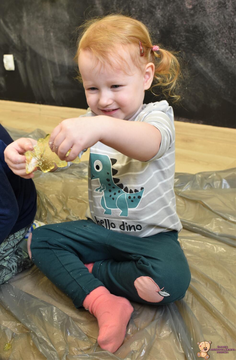 Dziś obchodzimy dzień Dinozaura, odwiedził nas magiczny stworek, który pokazał nam jak z malutkiego jajka pod wpływem wody wyrasta malutki dinozaur, odbijaliśmy figurki dinozaurów w galaretce a także szukaliśmy ich w gęstej masie. To była super zabawa![]()