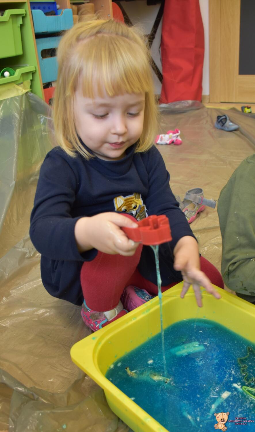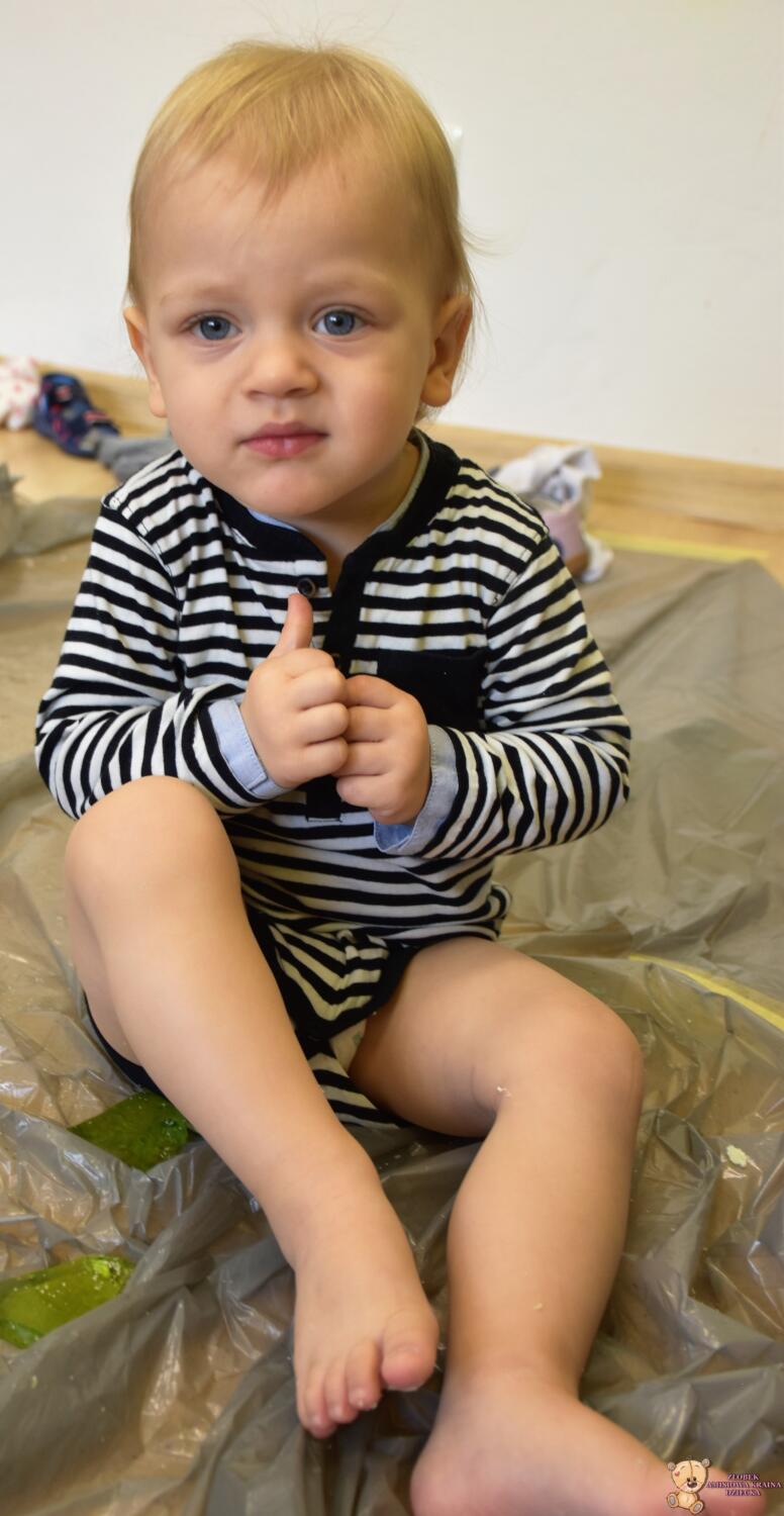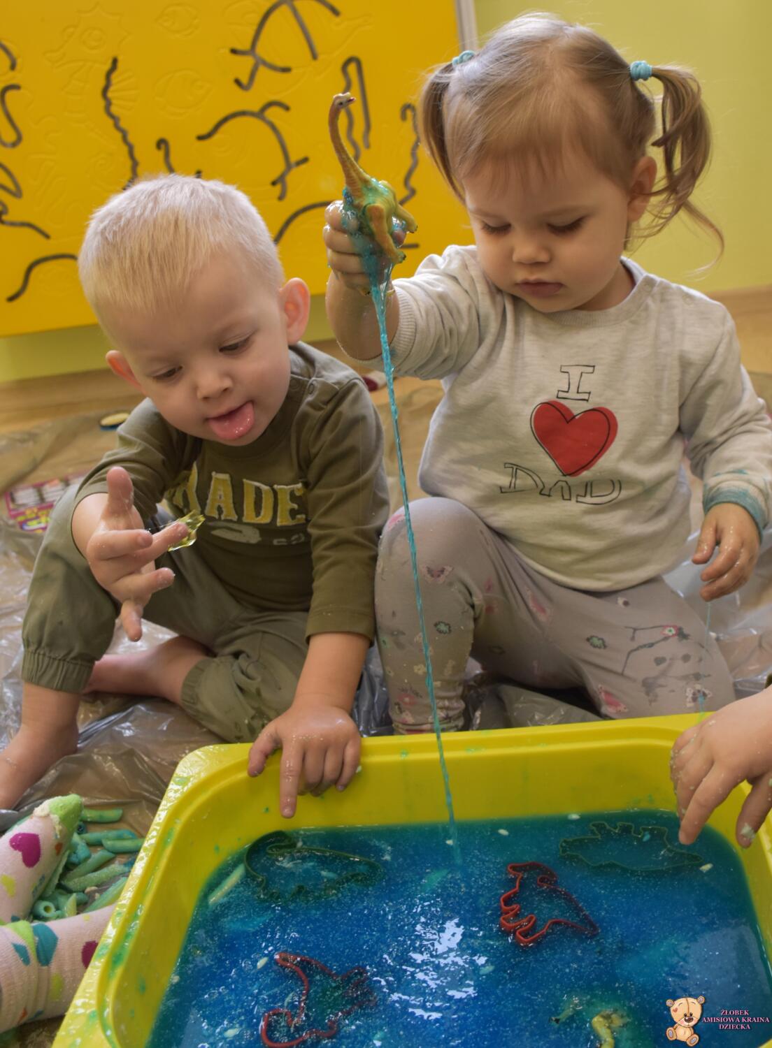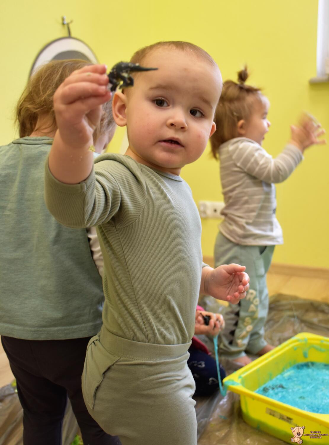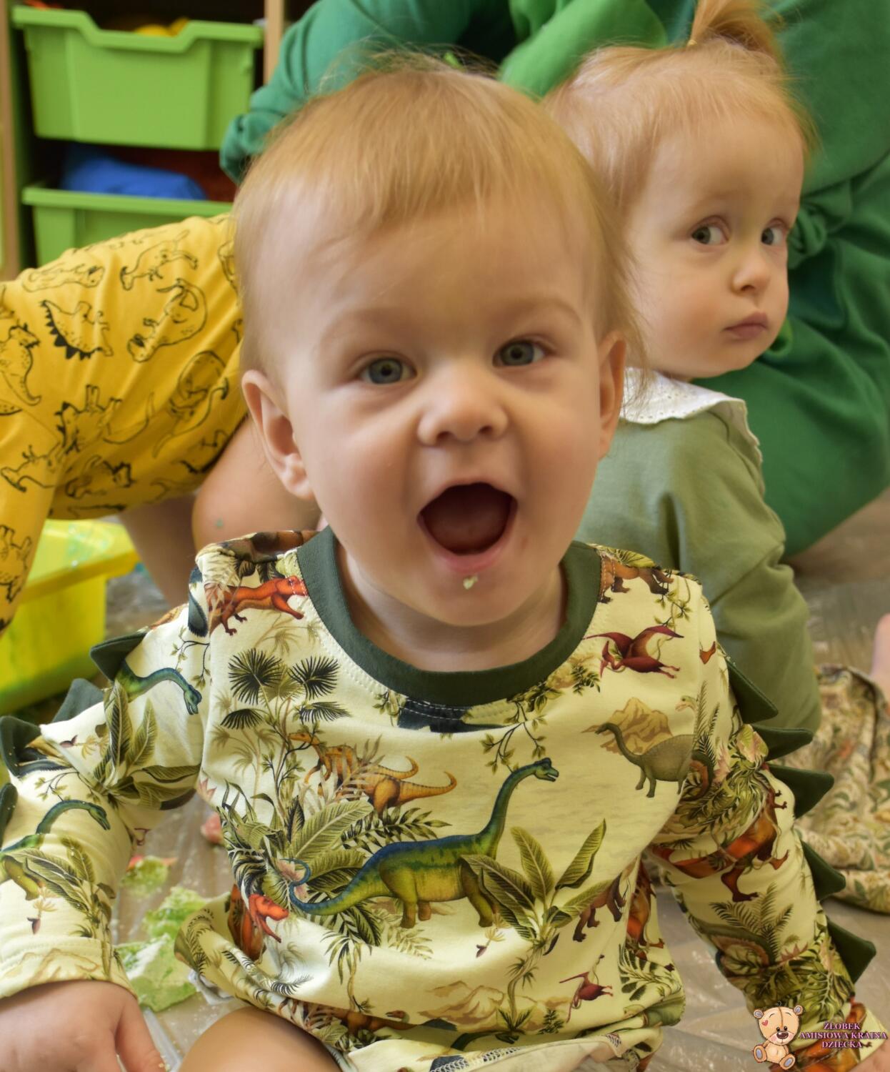Dziś obchodzimy dzień Dinozaura, odwiedził nas magiczny stworek, który pokazał nam jak z malutkiego jajka pod wpływem wody wyrasta malutki dinozaur, odbijaliśmy figurki dinozaurów w galaretce a także szukaliśmy ich w gęstej masie. To była super zabawa![]()