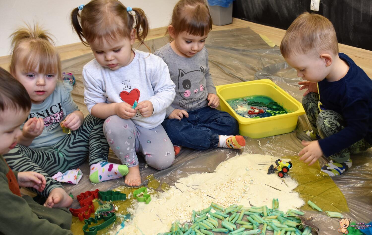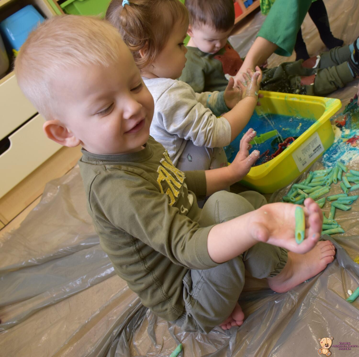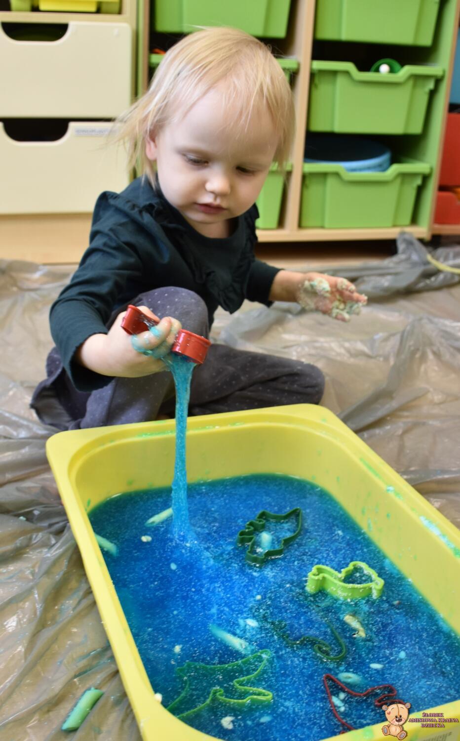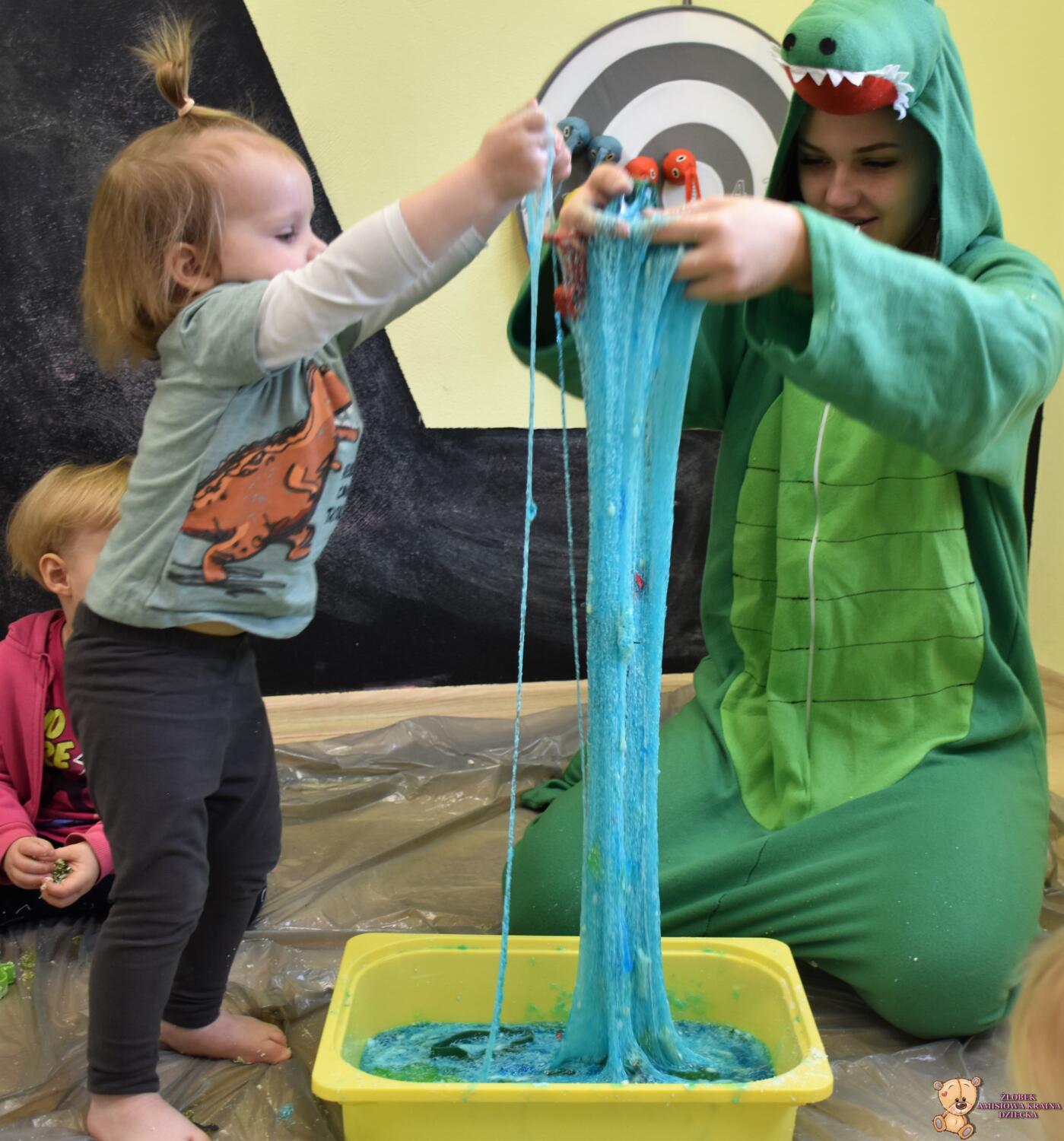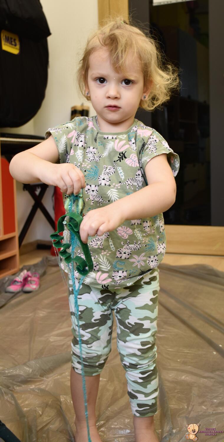 Dziś obchodzimy dzień Dinozaura, odwiedził nas magiczny stworek, który pokazał nam jak z malutkiego jajka pod wpływem wody wyrasta malutki dinozaur, odbijaliśmy figurki dinozaurów w galaretce a także szukaliśmy ich w gęstej masie. To była super zabawa![]()