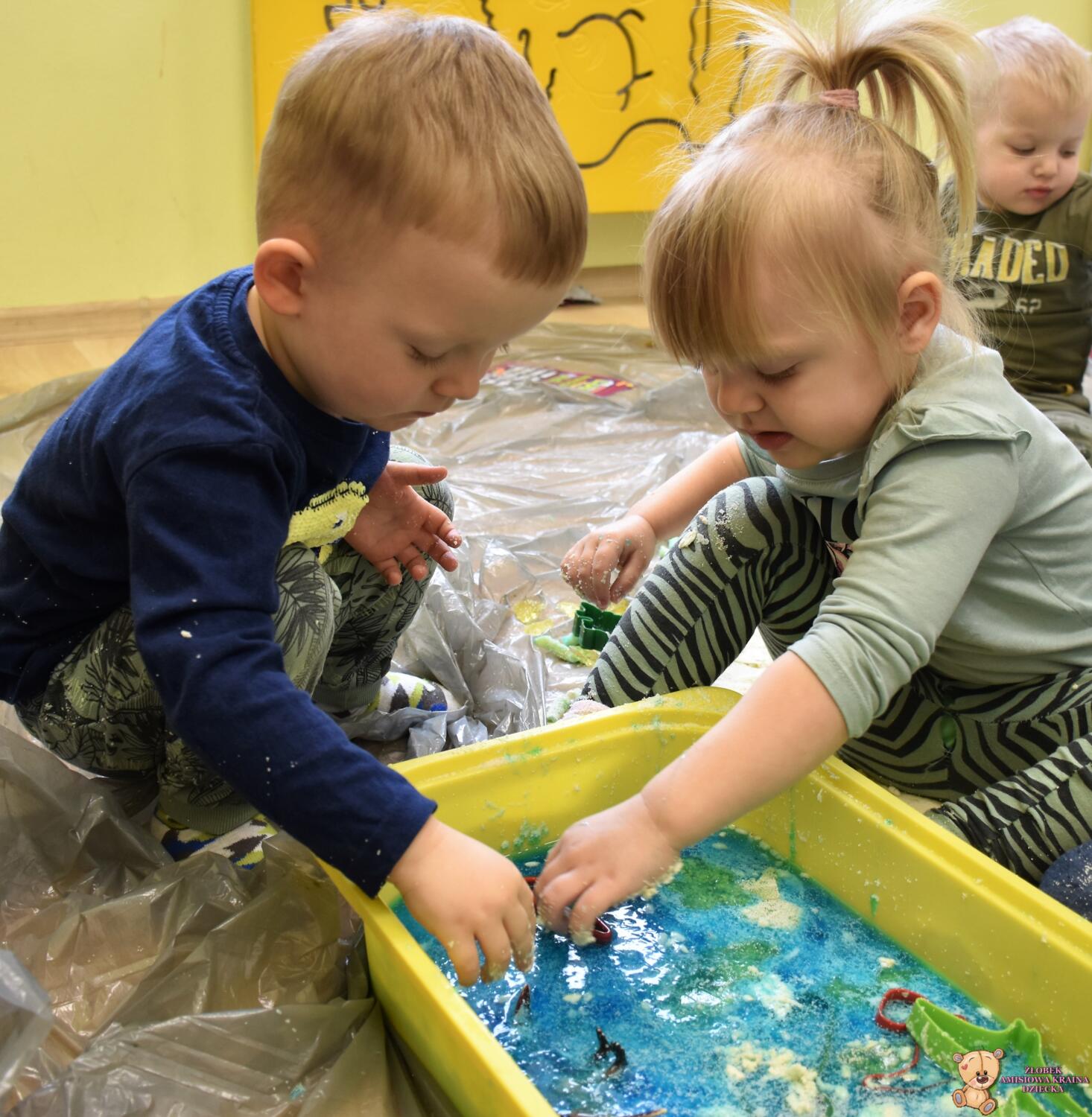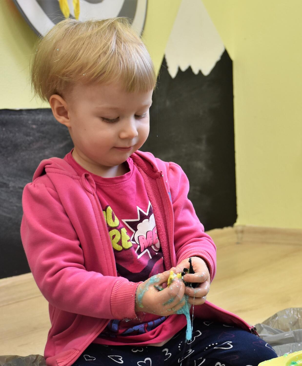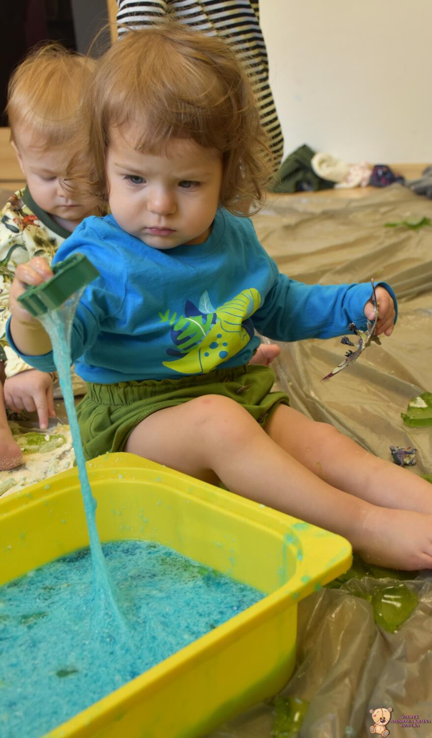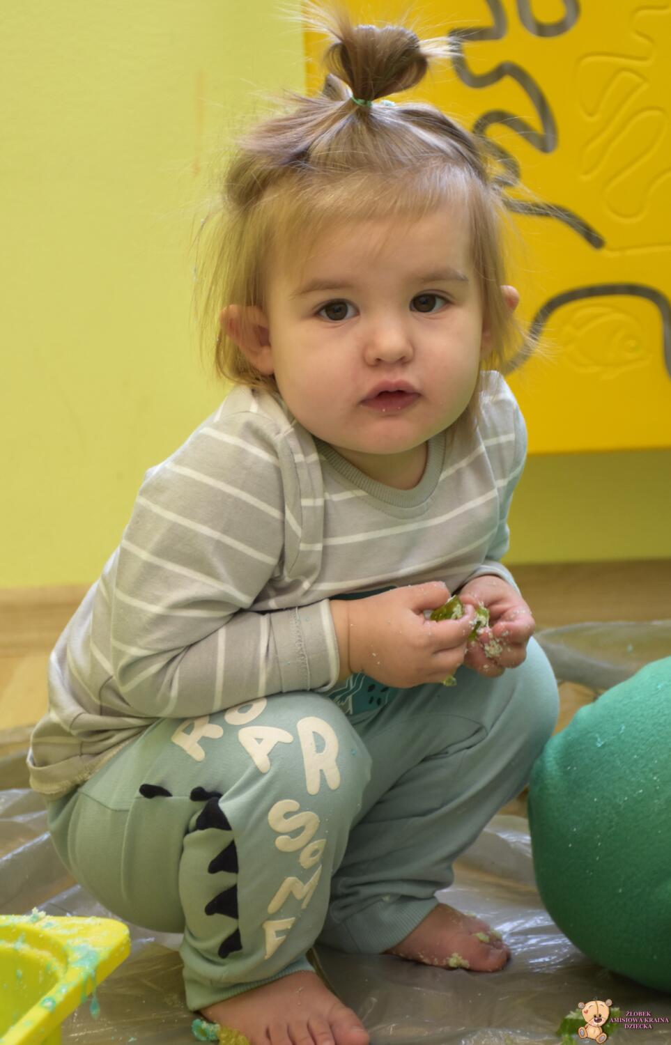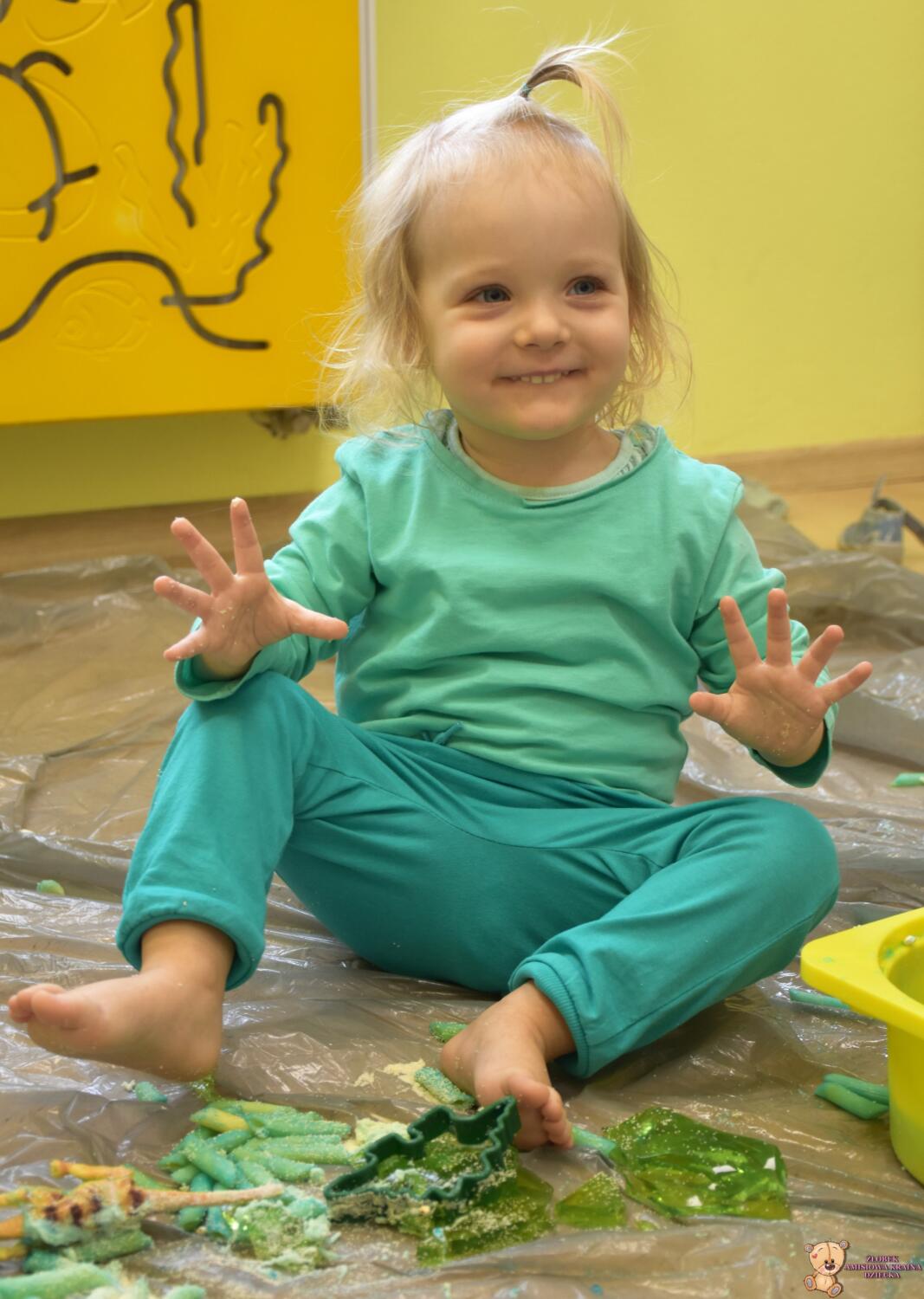 Dziś obchodzimy dzień Dinozaura, odwiedził nas magiczny stworek, który pokazał nam jak z malutkiego jajka pod wpływem wody wyrasta malutki dinozaur, odbijaliśmy figurki dinozaurów w galaretce a także szukaliśmy ich w gęstej masie. To była super zabawa![]()