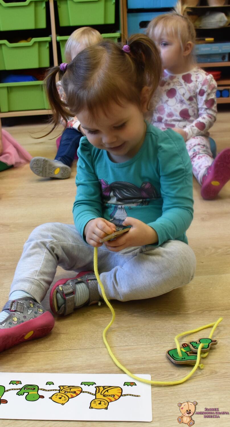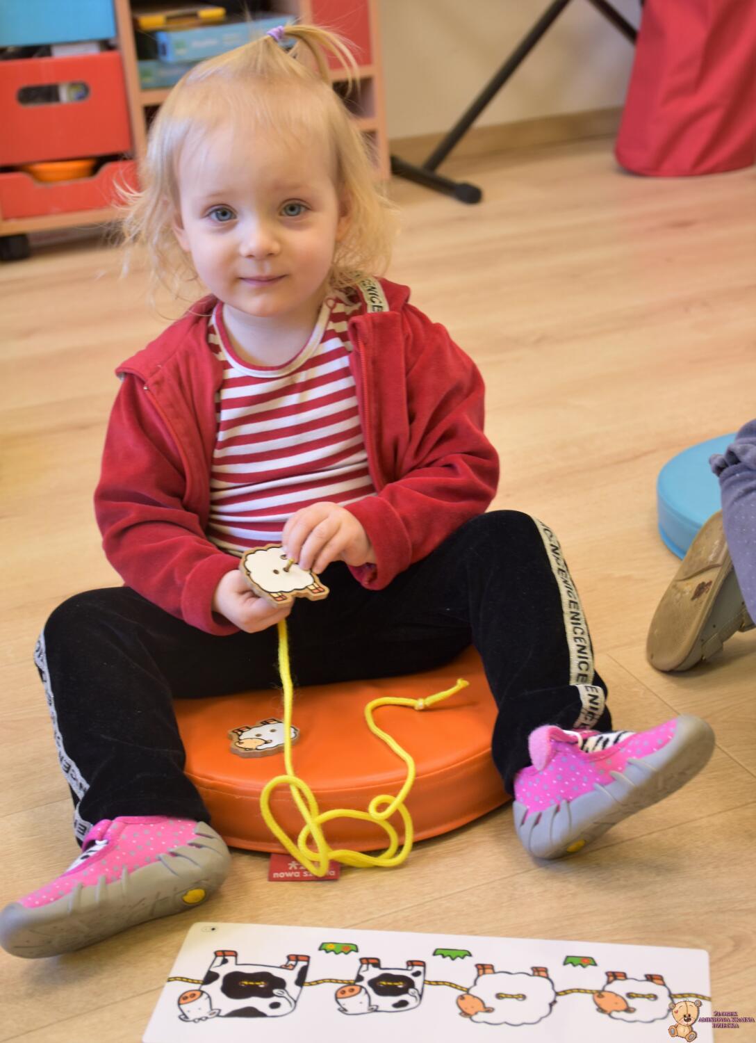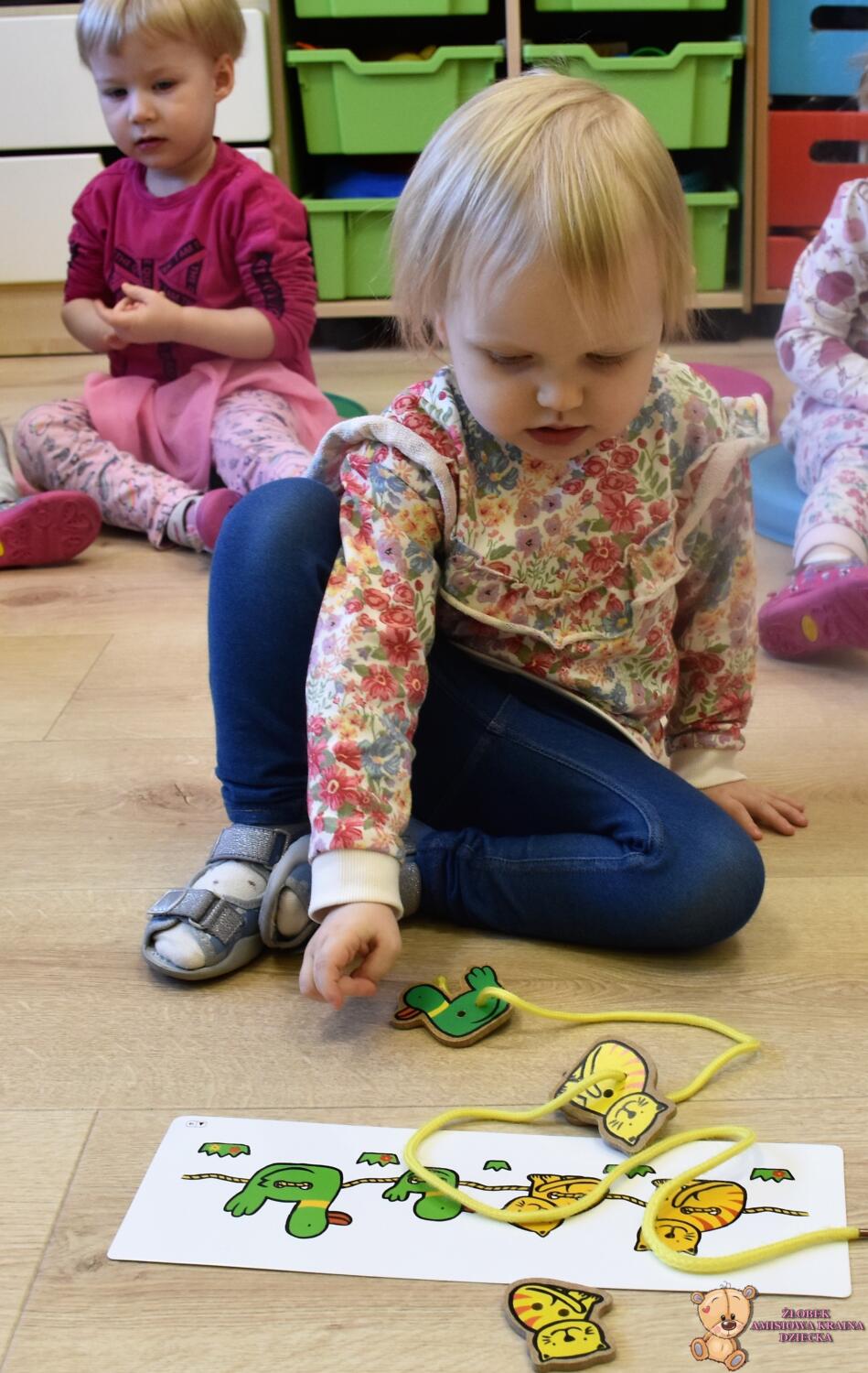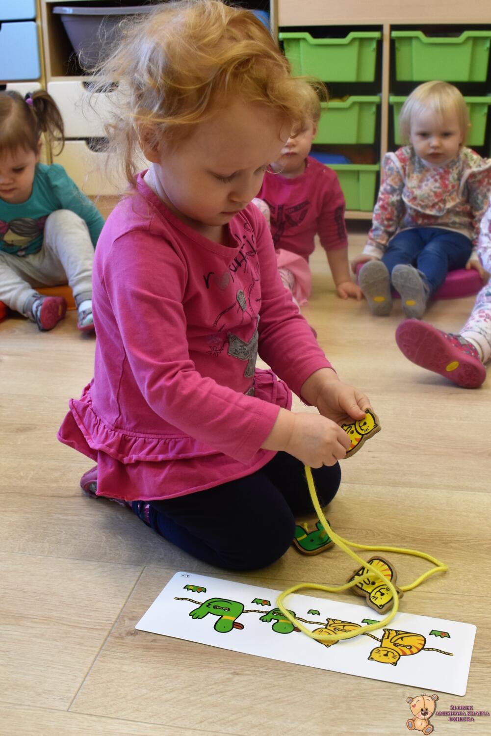 Dzisiaj na logorytmice odwzorowywanie !!! Dzieciaczki nawlekały na sznurek przygotowany wzór jednocześnie ćwicząc motorykę małą….. Następnie nasze starszaki poznawały podstawowe czasowniki i emocje ! To była super zabawa !!!