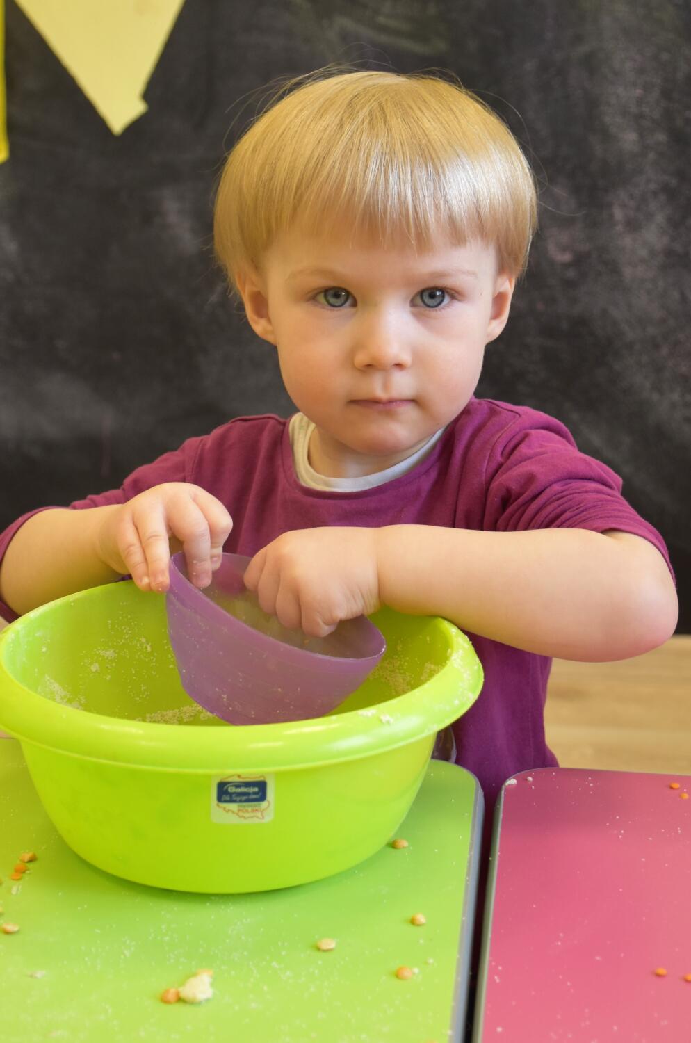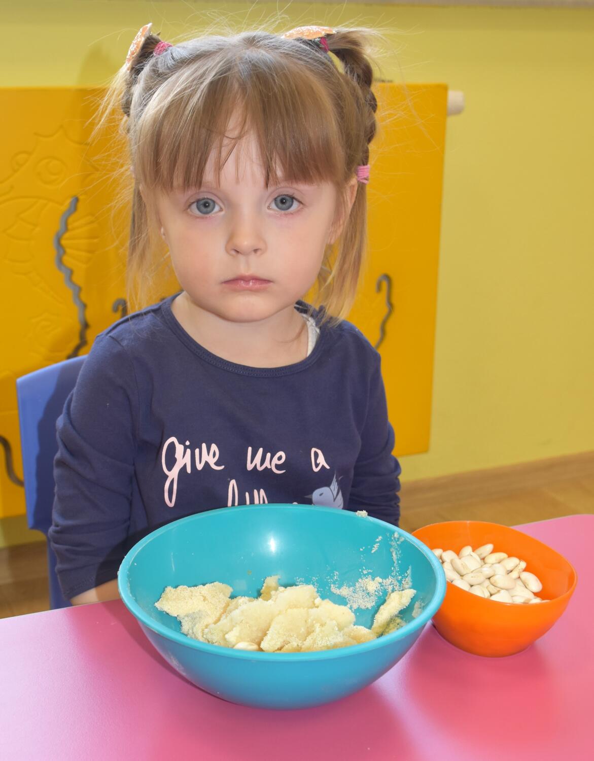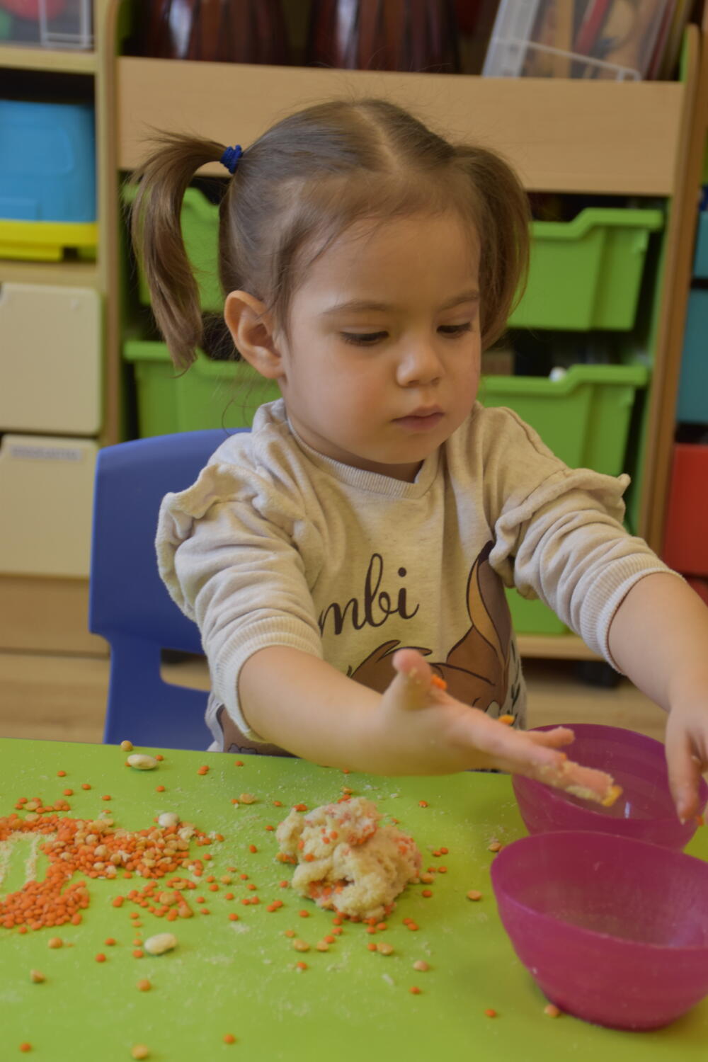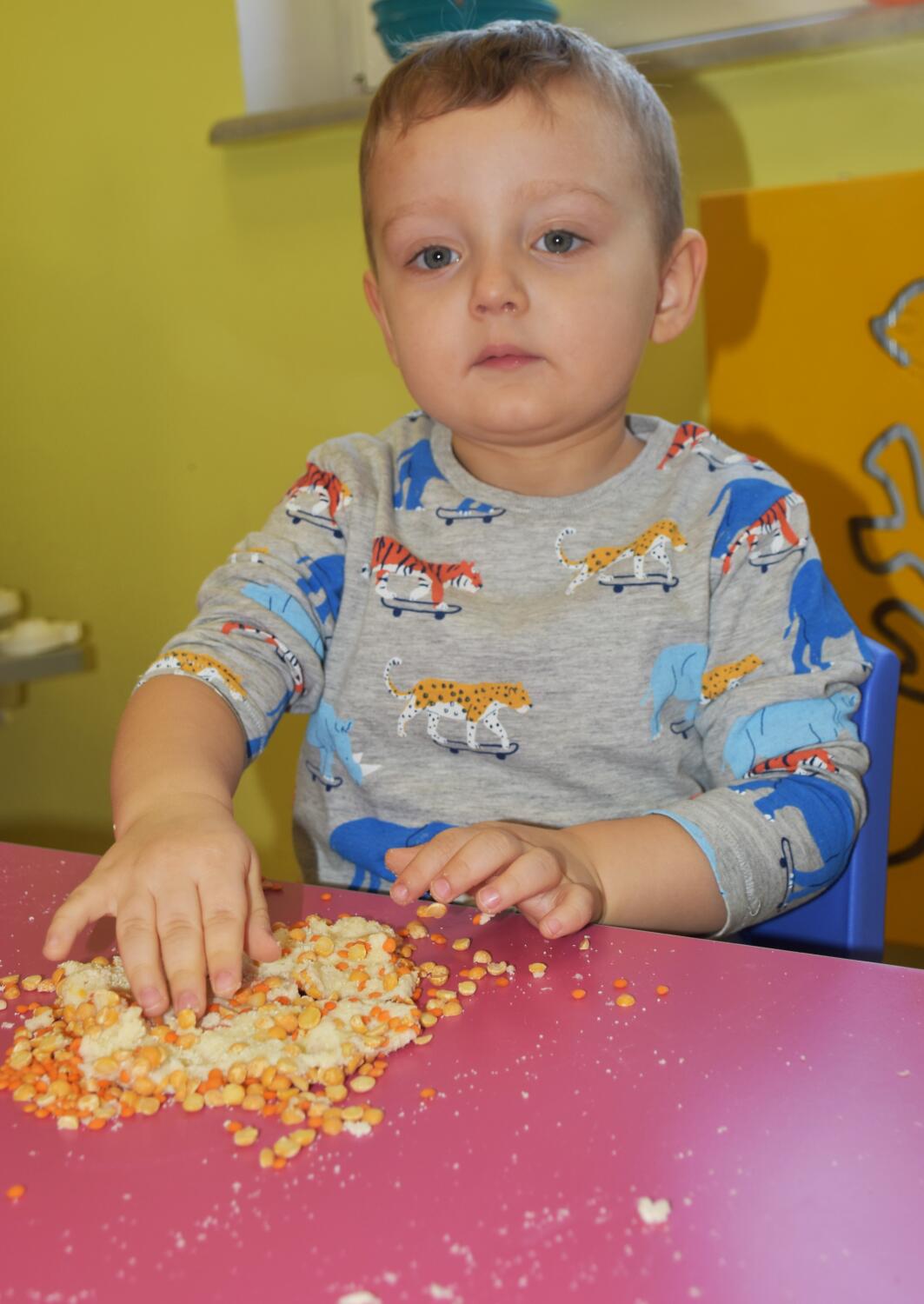 tworząc mięciutka i przyjemna w dotyku masę z wykorzystaniem kaszy manny i wody. Dodatkowo gdy masa była gotowa dzieci dodały do niej suche składniki takie jak ciecierzyca, groch czy fasola co dostarczyło im jeszcze więcej bodźców