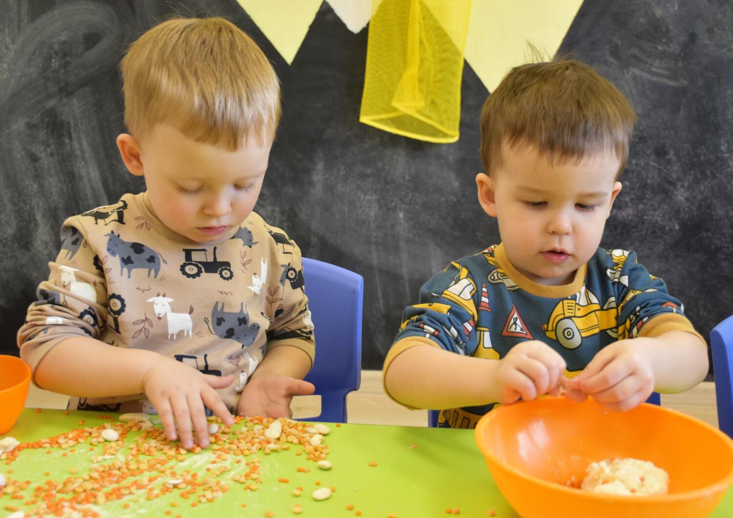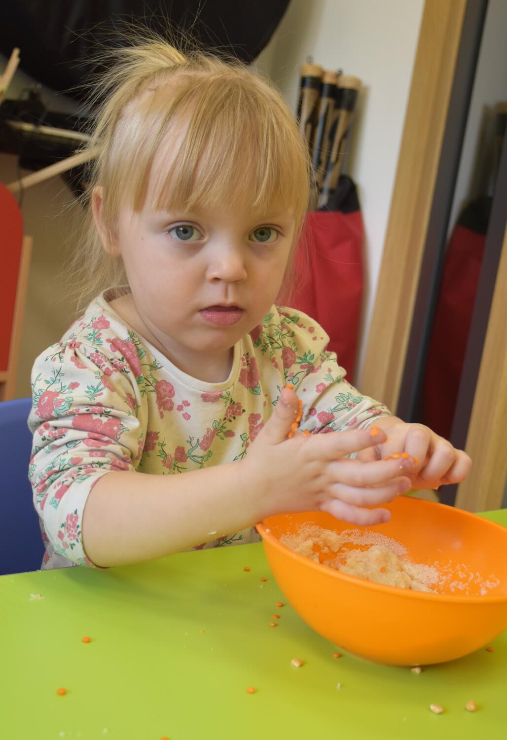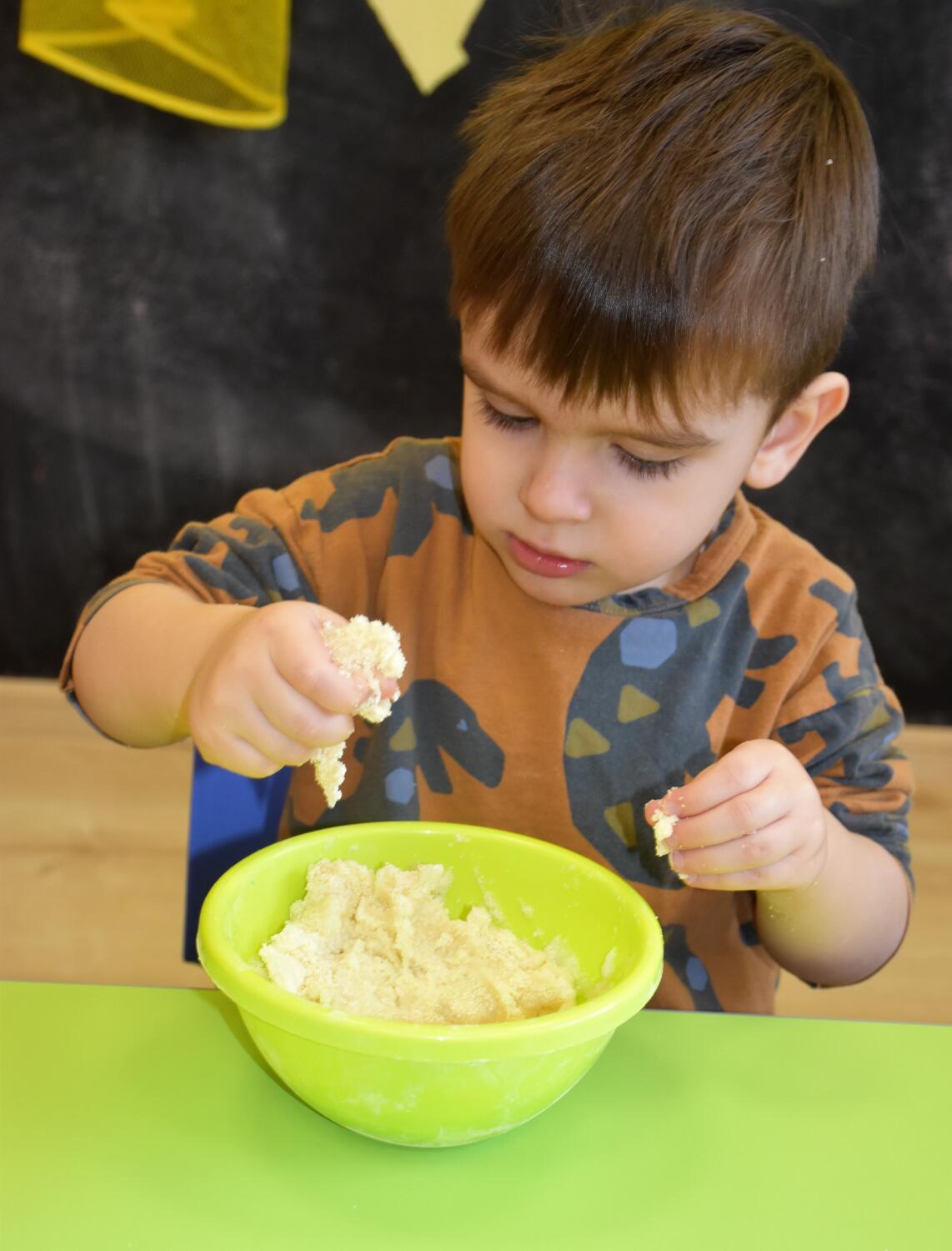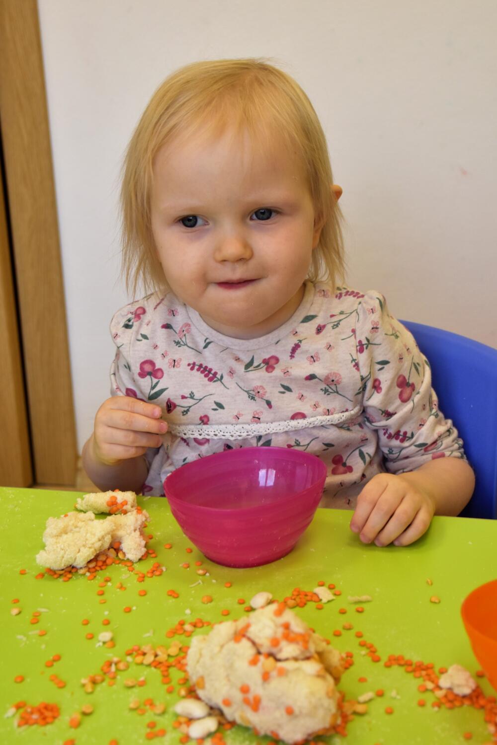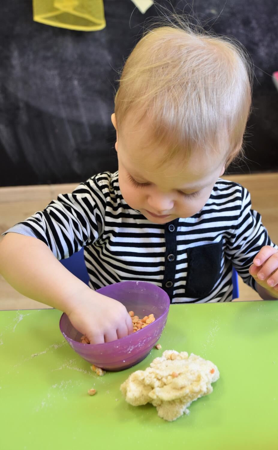 tworząc mięciutka i przyjemna w dotyku masę z wykorzystaniem kaszy manny i wody. Dodatkowo gdy masa była gotowa dzieci dodały do niej suche składniki takie jak ciecierzyca, groch czy fasola co dostarczyło im jeszcze więcej bodźców