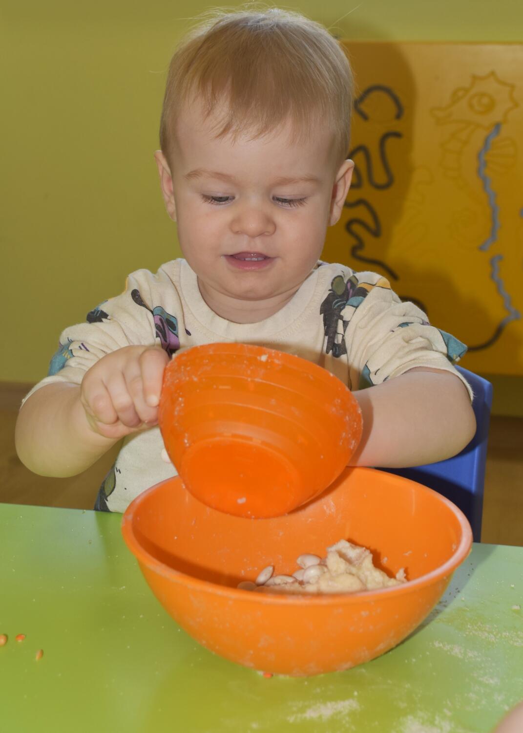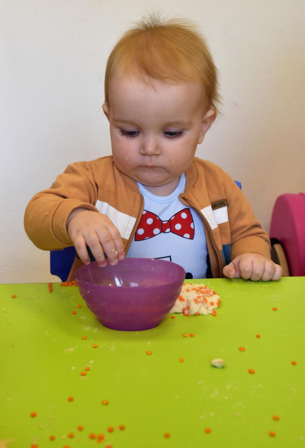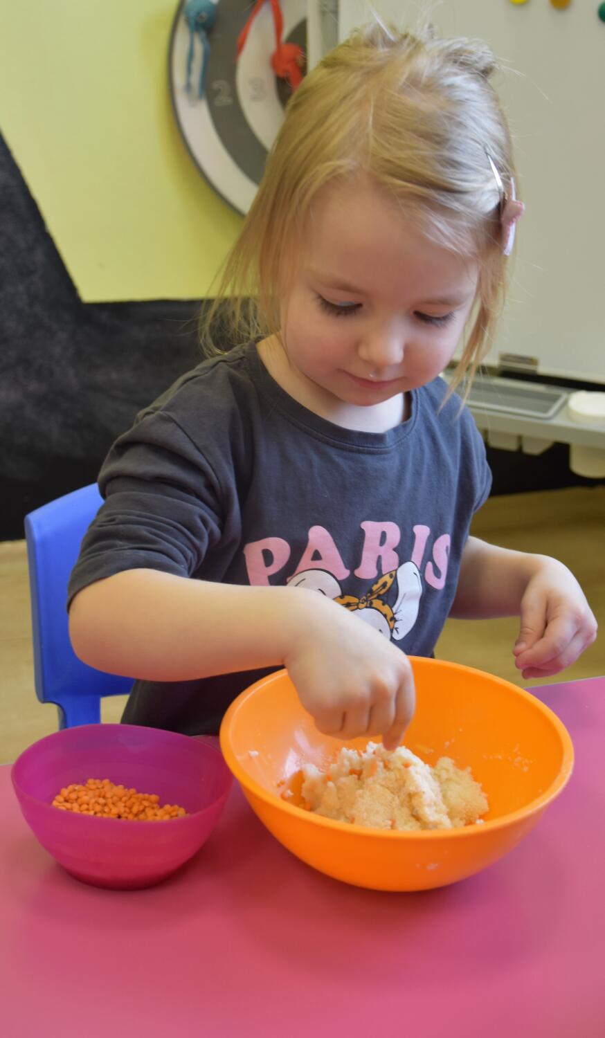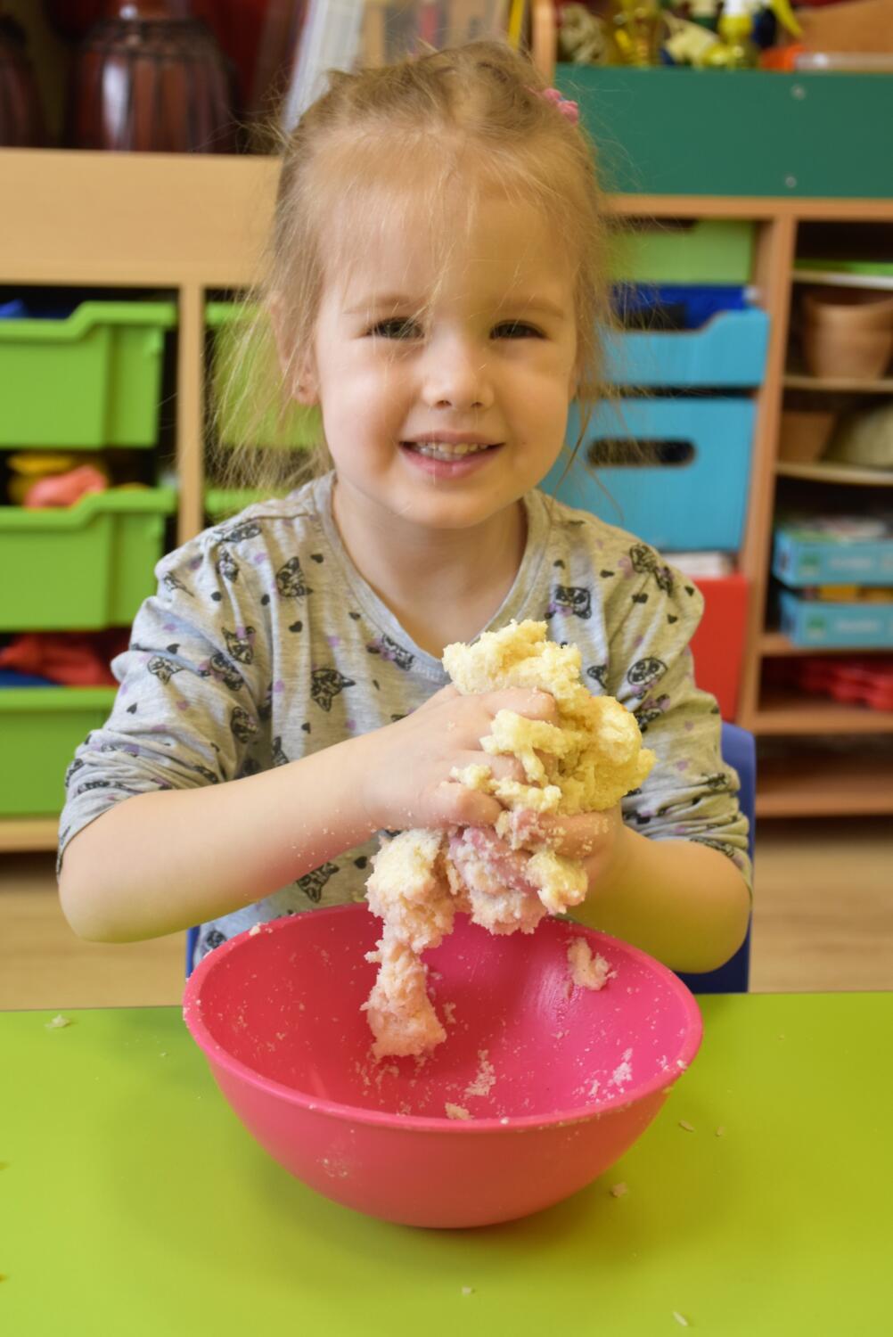 tworząc mięciutka i przyjemna w dotyku masę z wykorzystaniem kaszy manny i wody. Dodatkowo gdy masa była gotowa dzieci dodały do niej suche składniki takie jak ciecierzyca, groch czy fasola co dostarczyło im jeszcze więcej bodźców