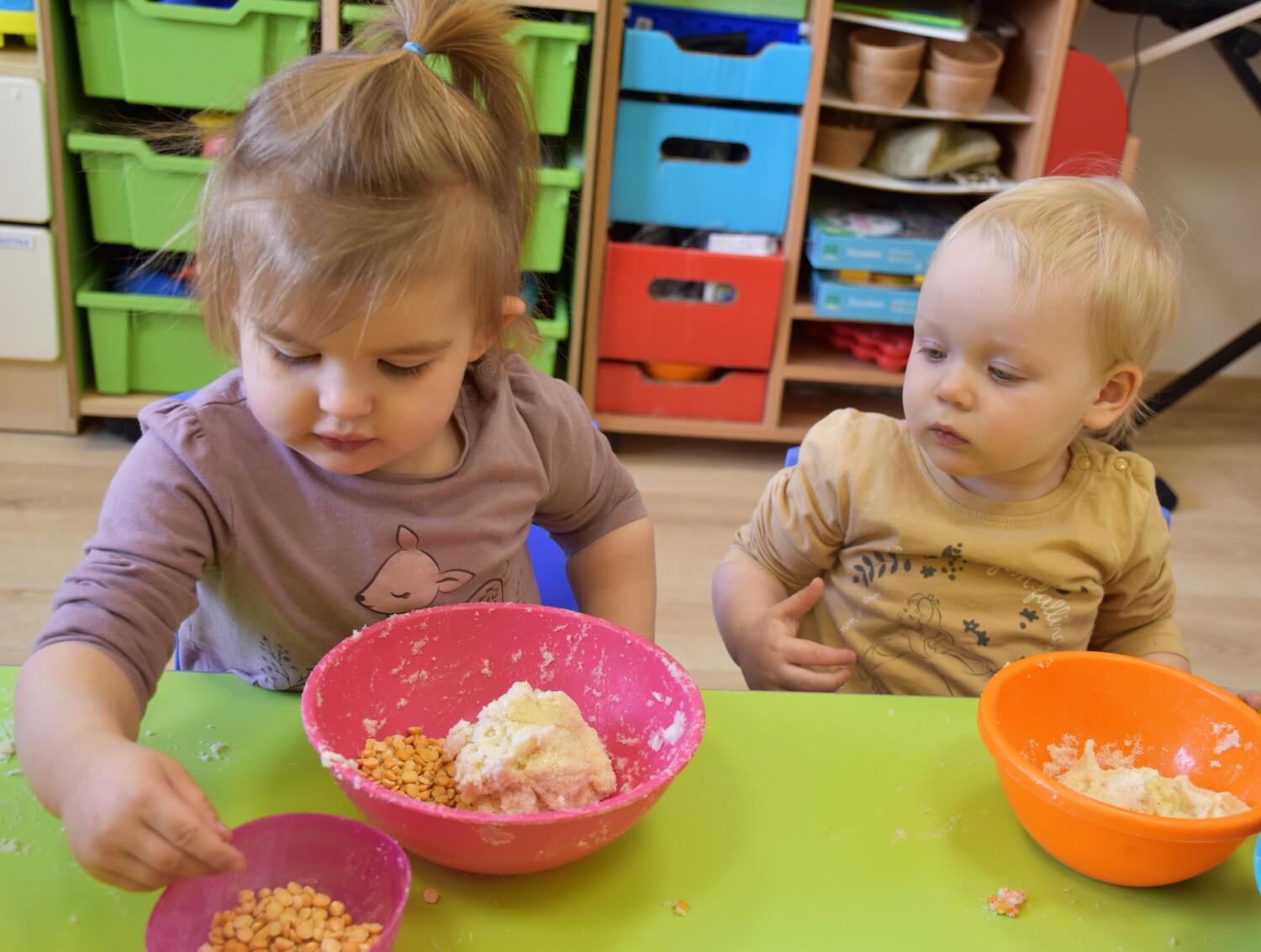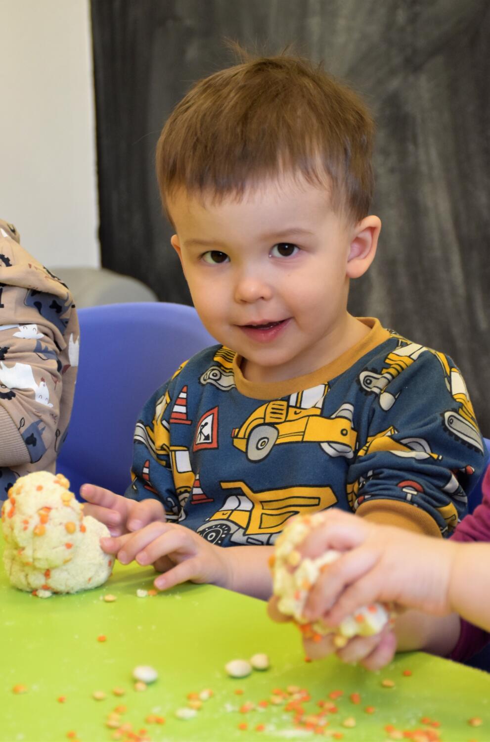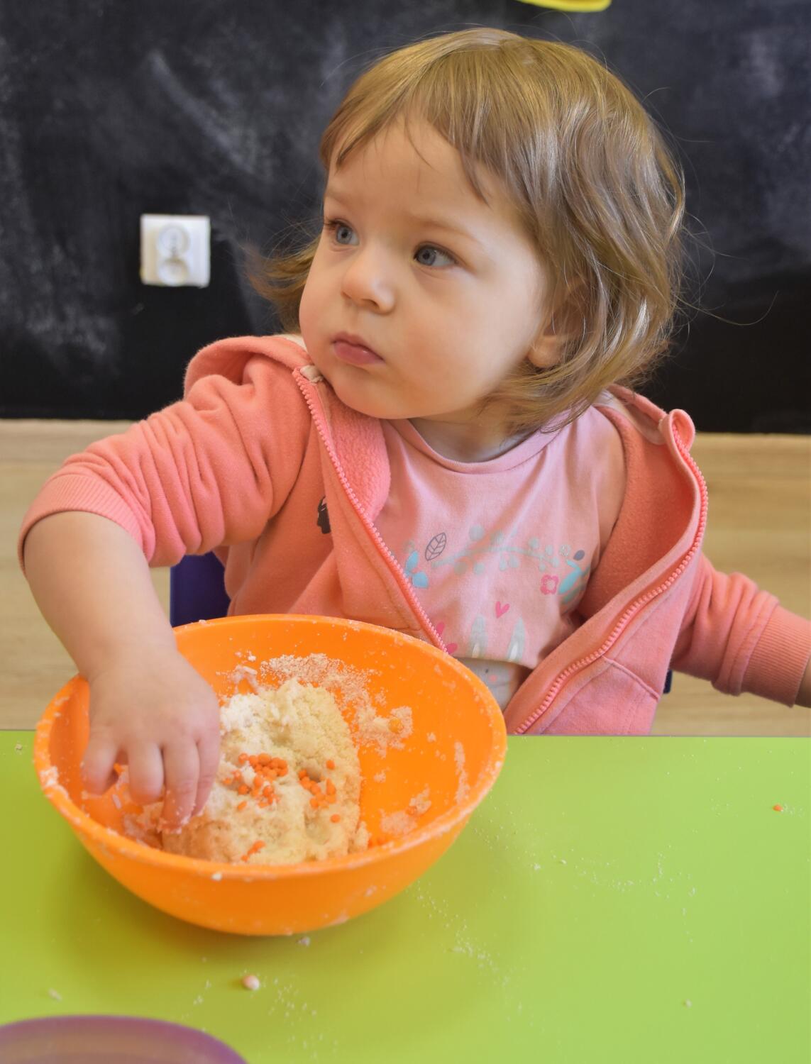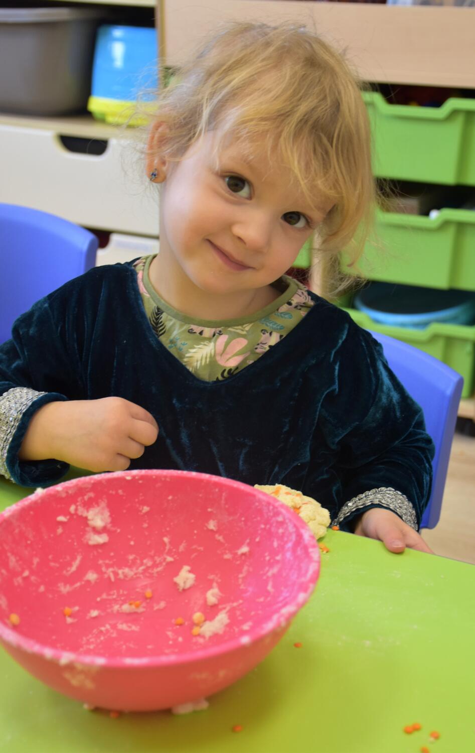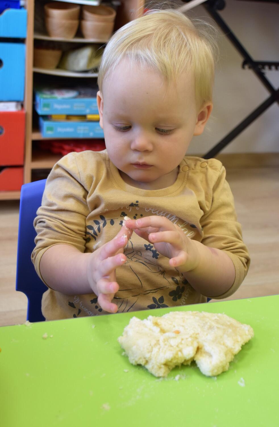 tworząc mięciutka i przyjemna w dotyku masę z wykorzystaniem kaszy manny i wody. Dodatkowo gdy masa była gotowa dzieci dodały do niej suche składniki takie jak ciecierzyca, groch czy fasola co dostarczyło im jeszcze więcej bodźców