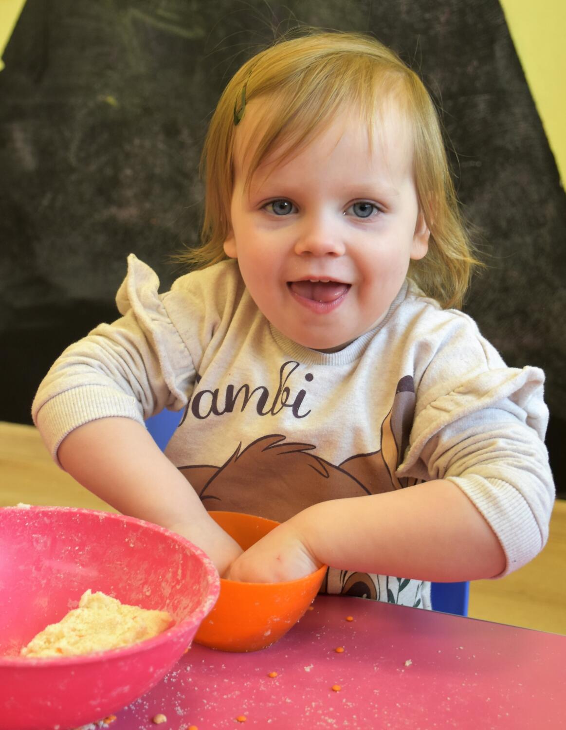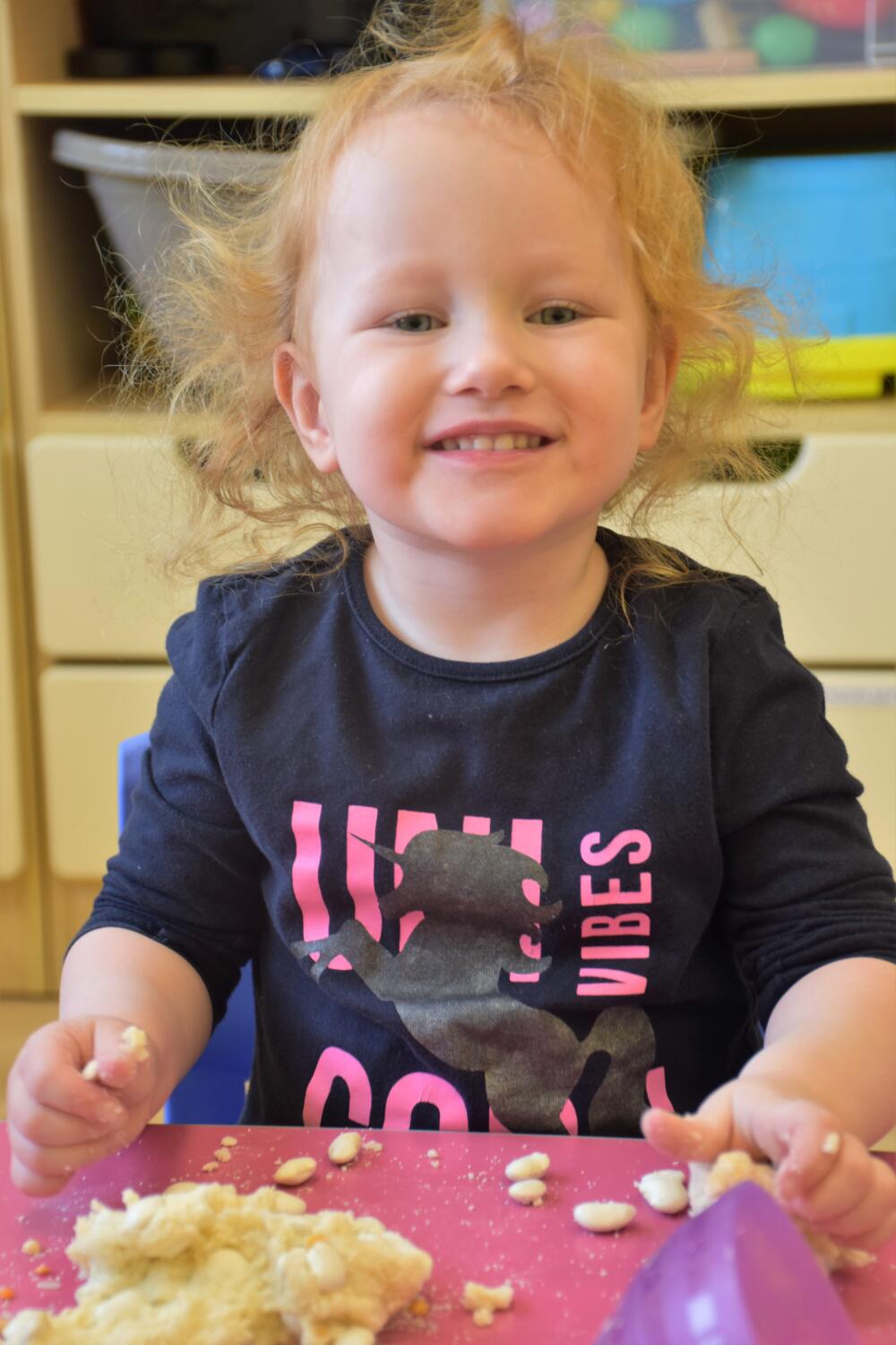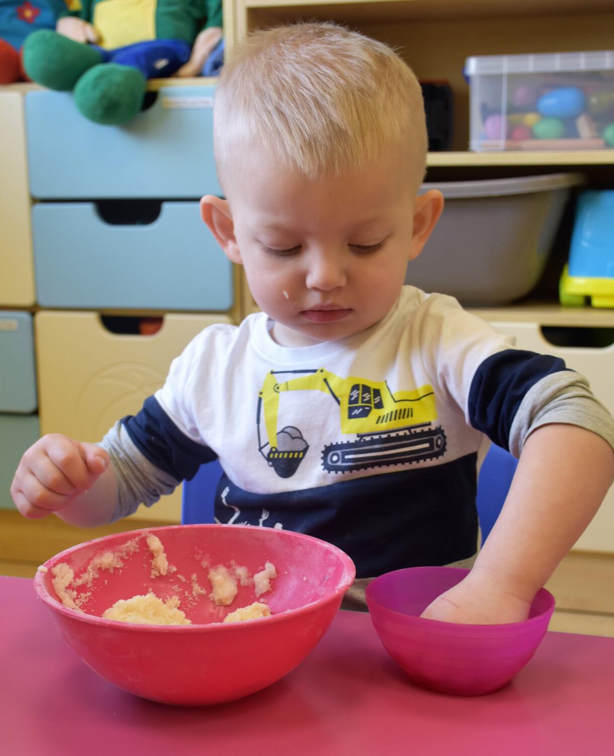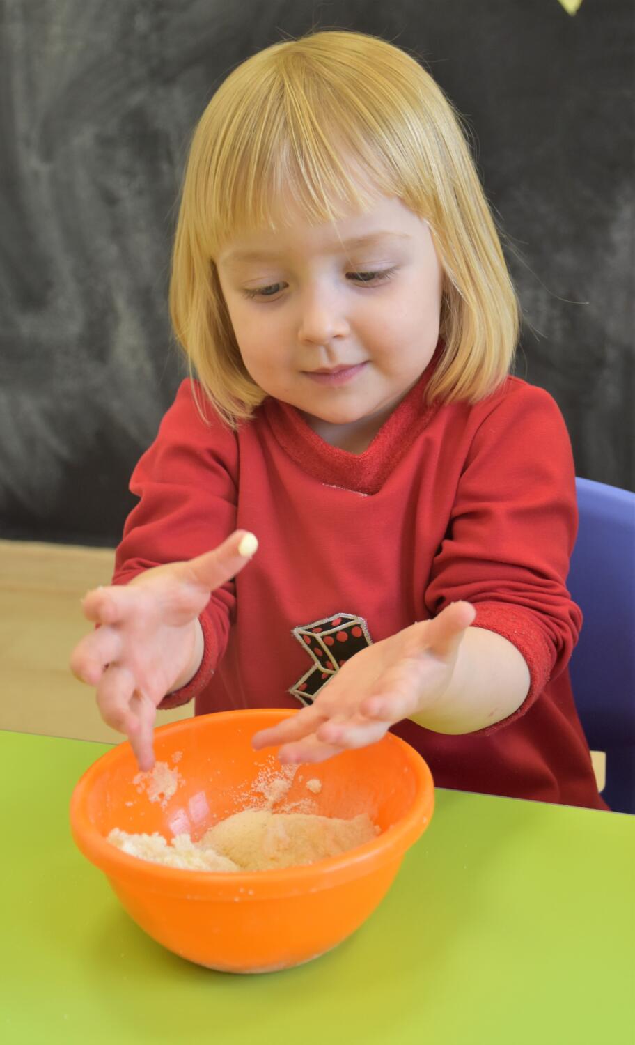 tworząc mięciutka i przyjemna w dotyku masę z wykorzystaniem kaszy manny i wody. Dodatkowo gdy masa była gotowa dzieci dodały do niej suche składniki takie jak ciecierzyca, groch czy fasola co dostarczyło im jeszcze więcej bodźców