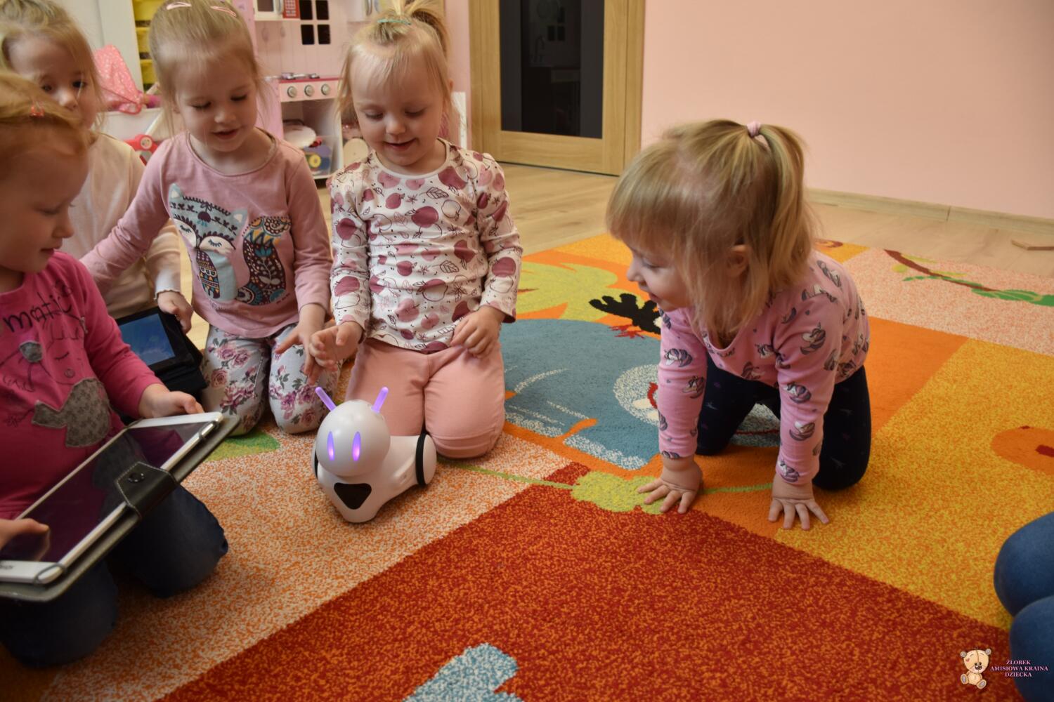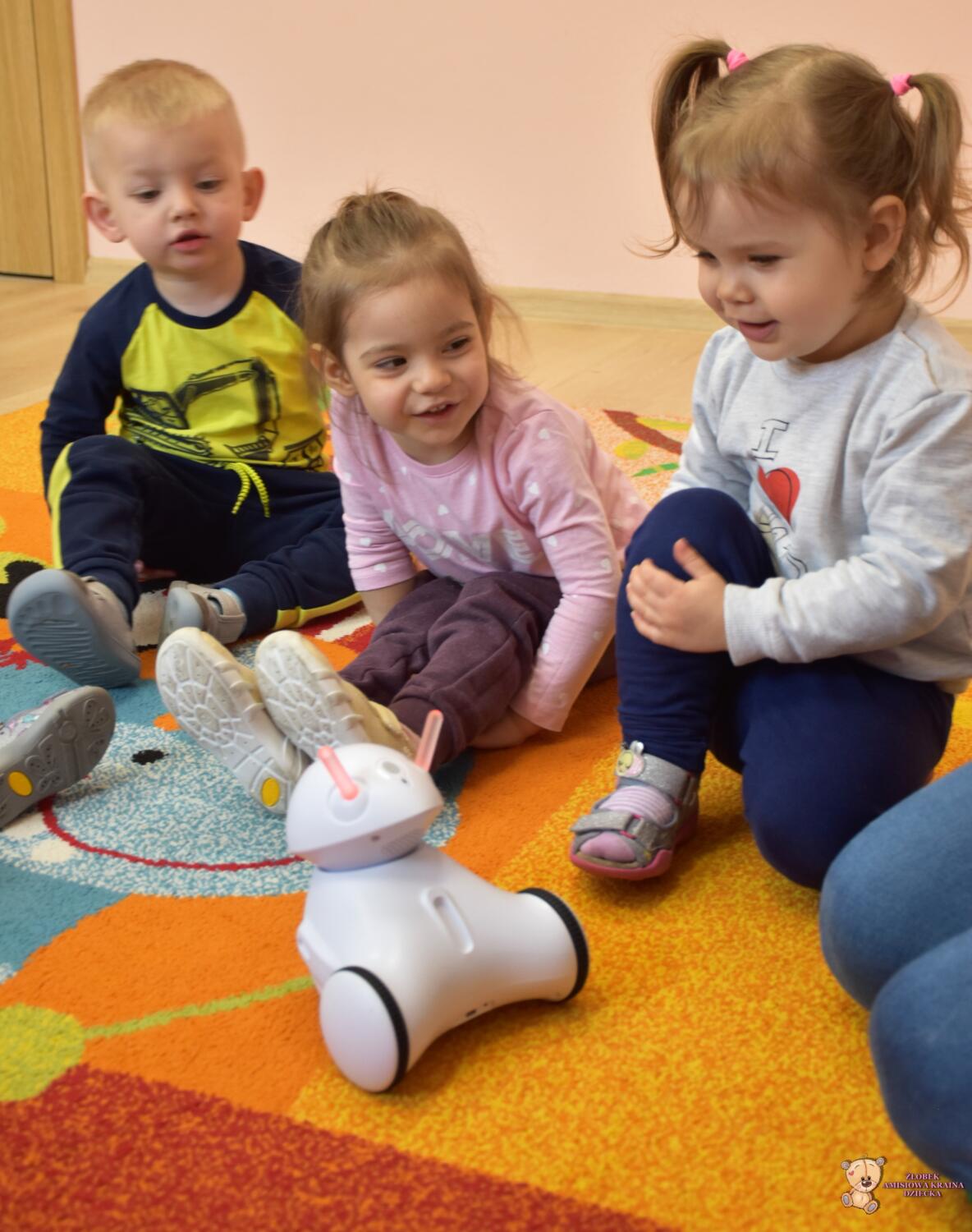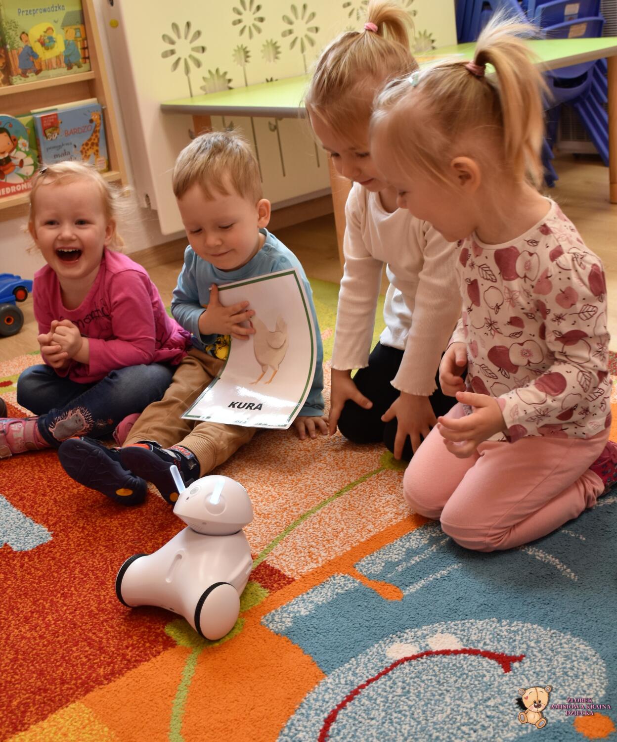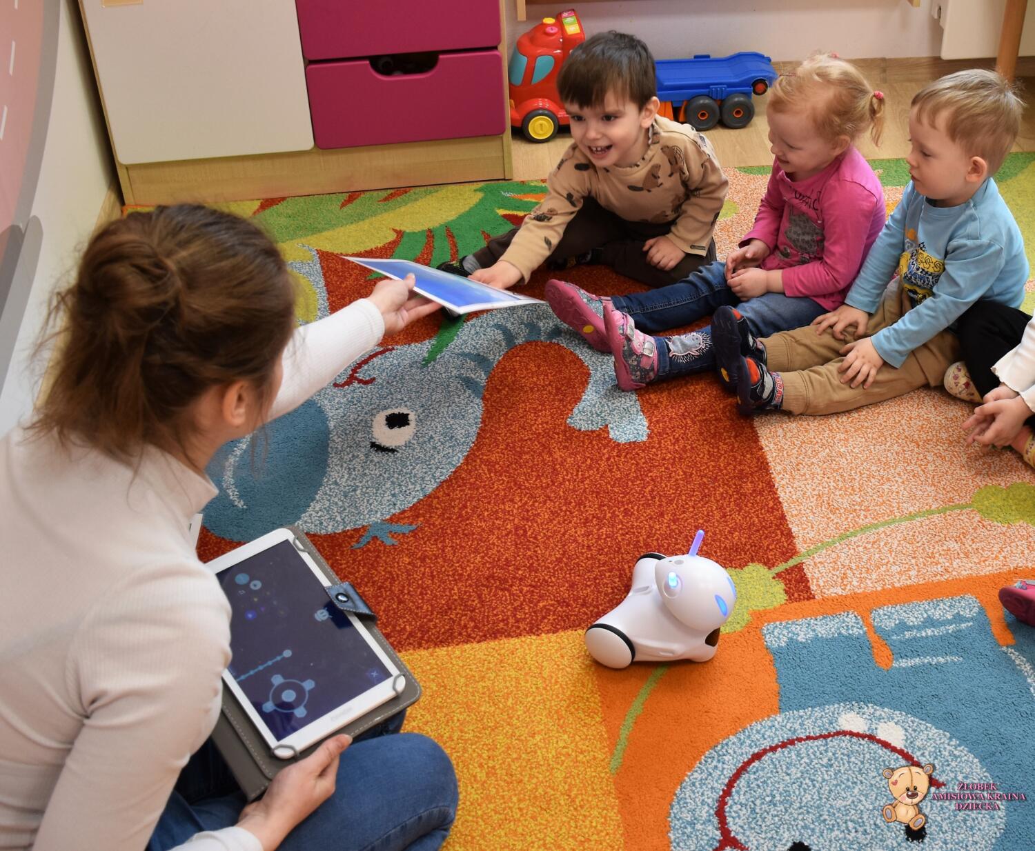 Dziś odwiedziła nas ciocia Natalia, która poprowadziła zajęcia z podstaw robotyki. Dzieci zapoznały się z przyniesionymi robotami, które z początku wyglądały dość dziwnie. Wspólnie odgadywaliśmy wydawane przez nie dźwięki zwierząt oraz kolory, które zmieniały się na jego czułkach. Na koniec zajęć dzieciaki same sterowały robotami świetnie się przy tym bawiąc.