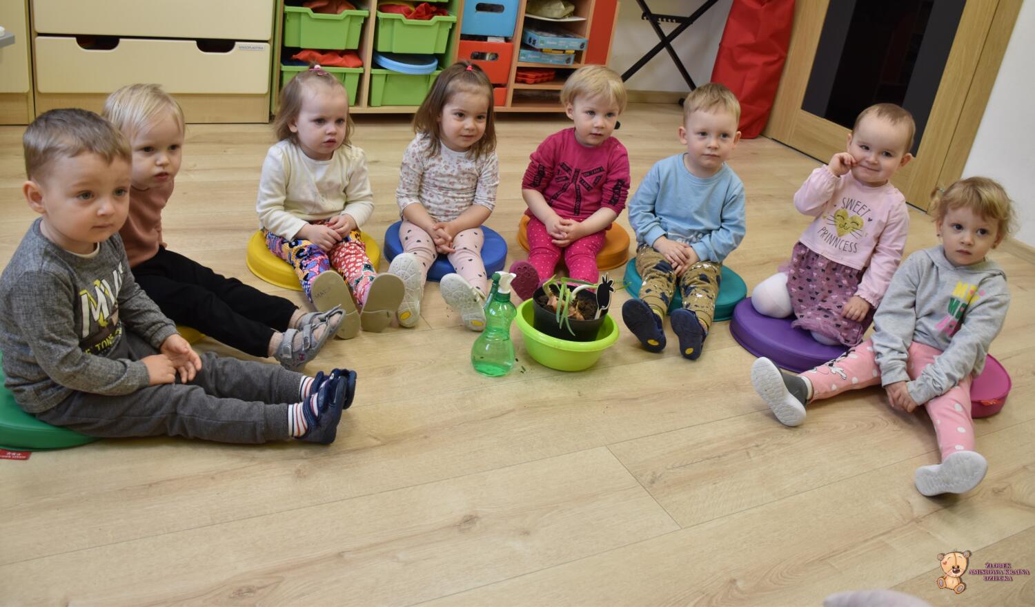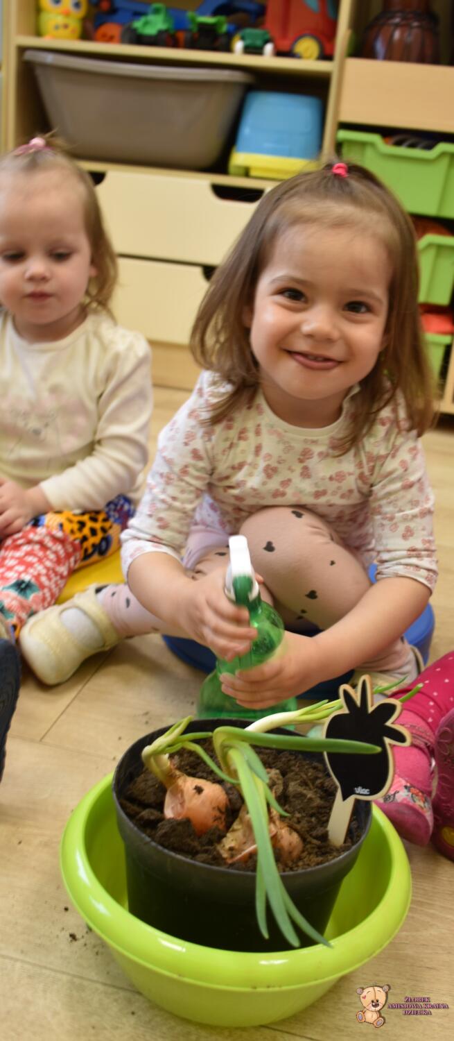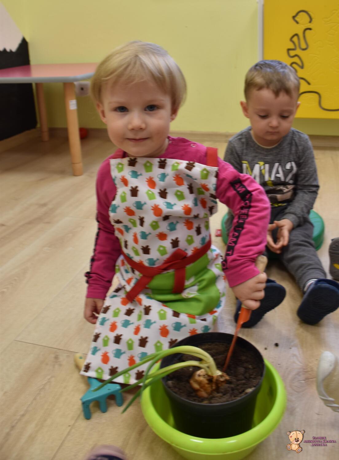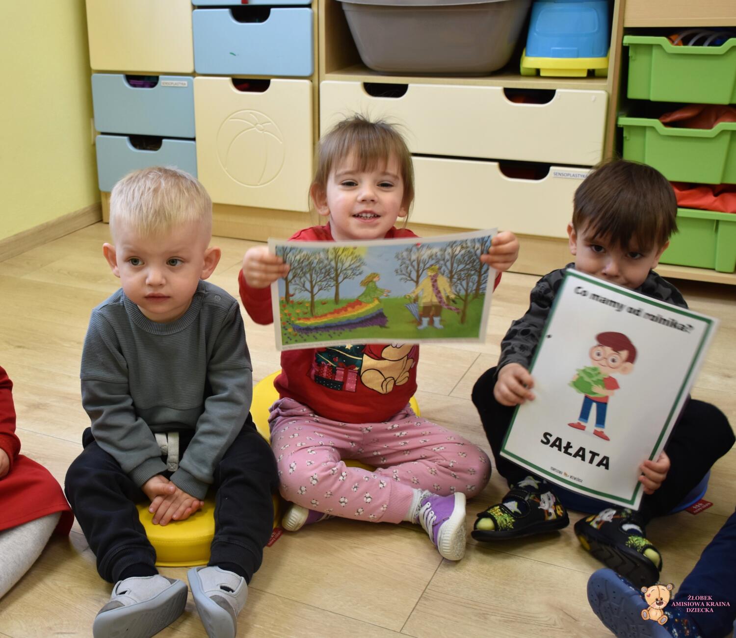 Dzisiaj na Bajkoterapii AMIsiaki poznały bajkę „Zielony ogródek”. Opowiadaliśmy o pracach w ogródku,jak pomagają .Na koniec zasadziliśmy cebulkę i pietruszkę