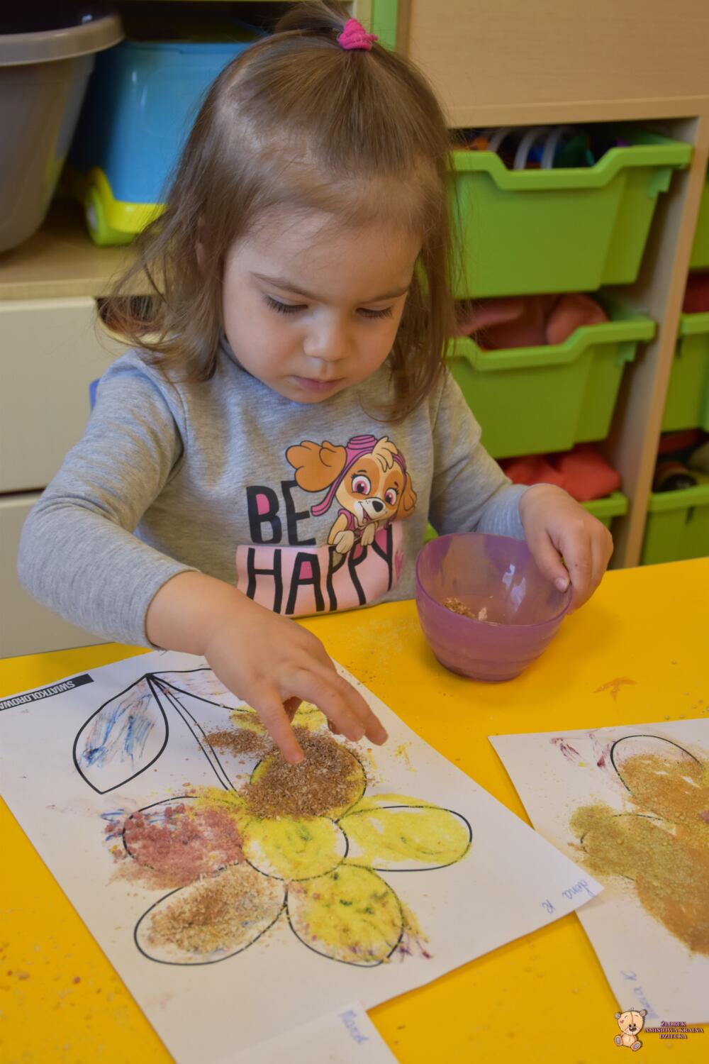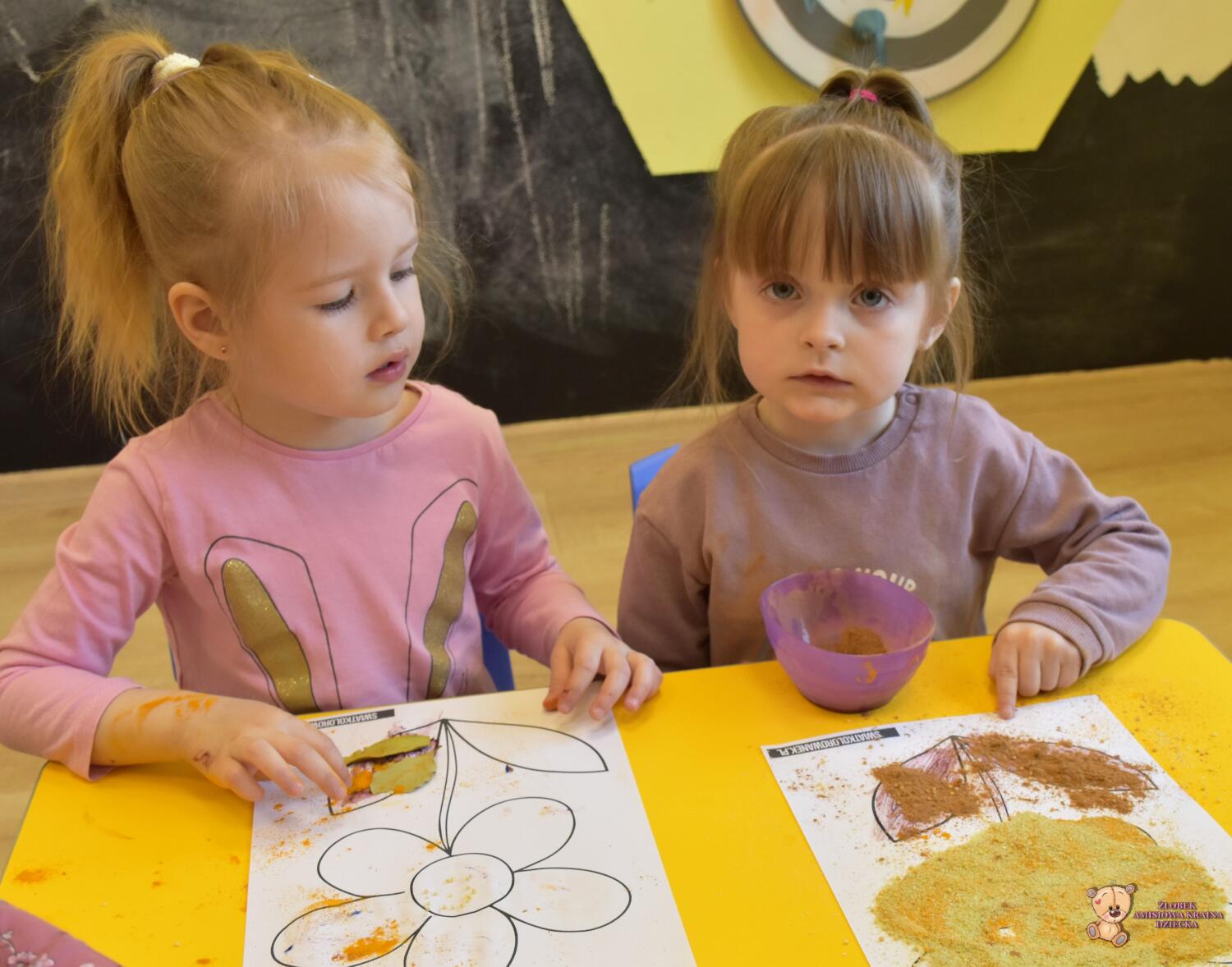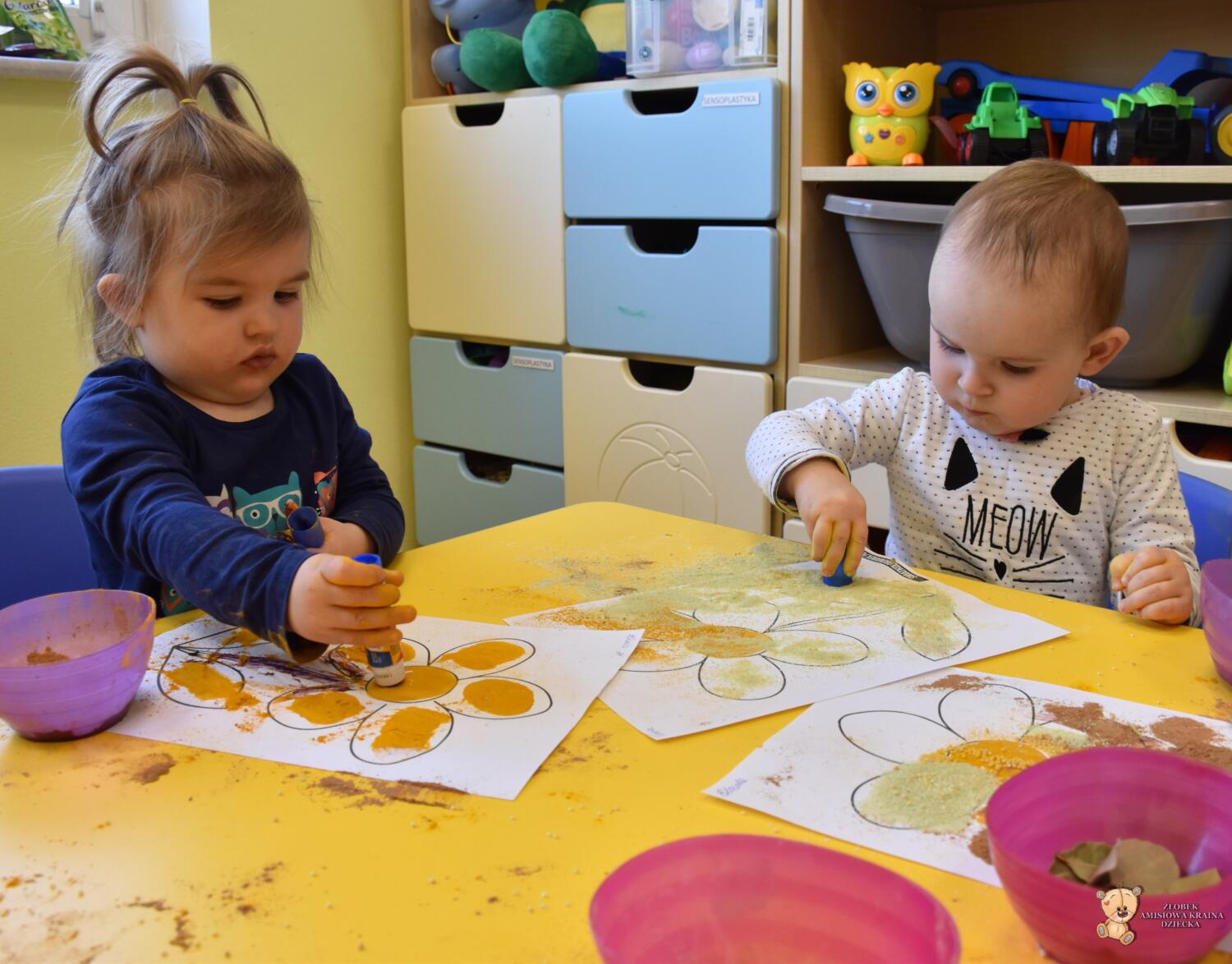 Dziś na zajęciach Montessori Amisiaki wykonywały kolorowe obrazki, z wykorzystaniem przypraw. Dzieci rozwijały swoją motorykę małą, koordynację wzrokowo-przestrzenną, a także super się przy tym bawiły, w wyniku czego powstały barwę kwiaty![]()