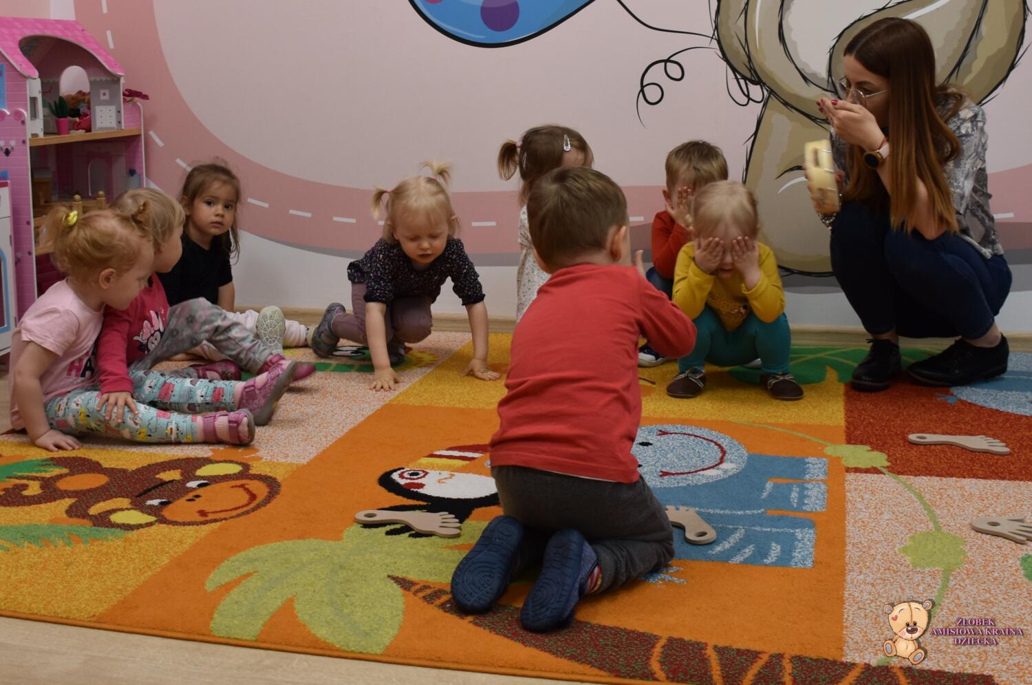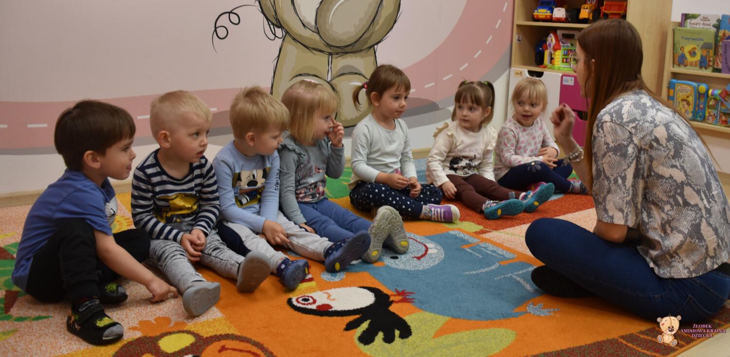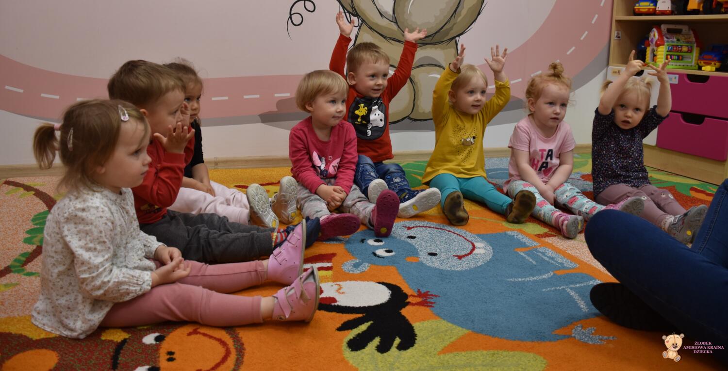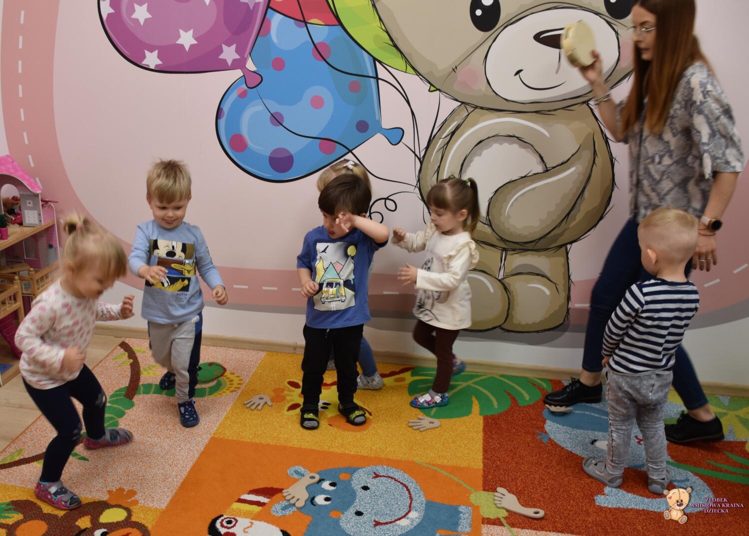 Dziś na zajęciach logorytmiki dzieci poznawały oraz nazywały instrumenty muzyczne, naśladowaly dźwięki przez nie wydawane oraz imitowały grę na nich. Dzieci pięknie śpiewały piosenkę oraz współpracowały podczas zabaw ruchowych z dźwiękiem. Dzięki tego typu zajęciom dzieci wzbogacają swój słownik, usprawniają motorykę małą, doskonalą funkcje słuchowo-ruchowe oraz pobudzają ośrodek mowy w mózgu