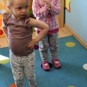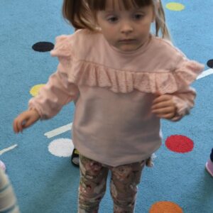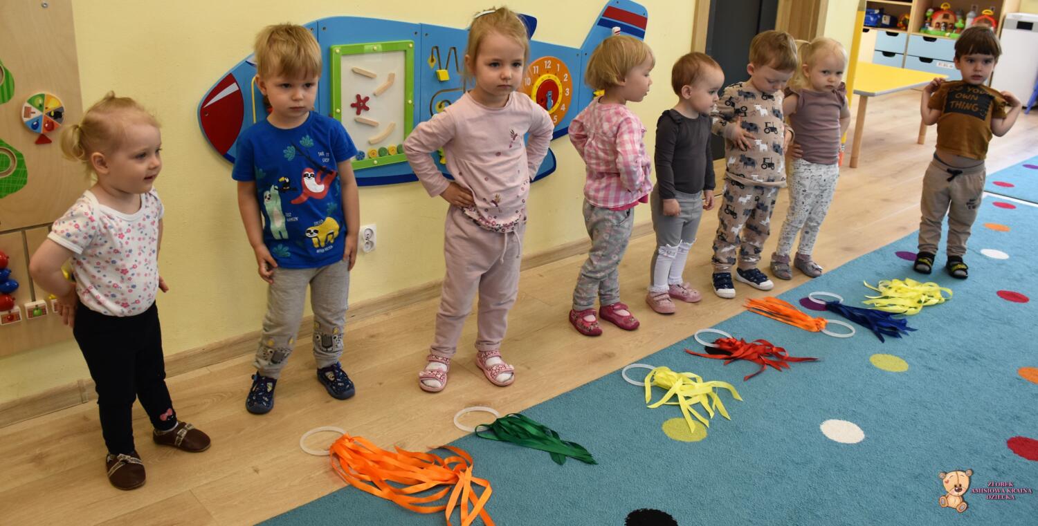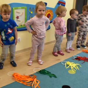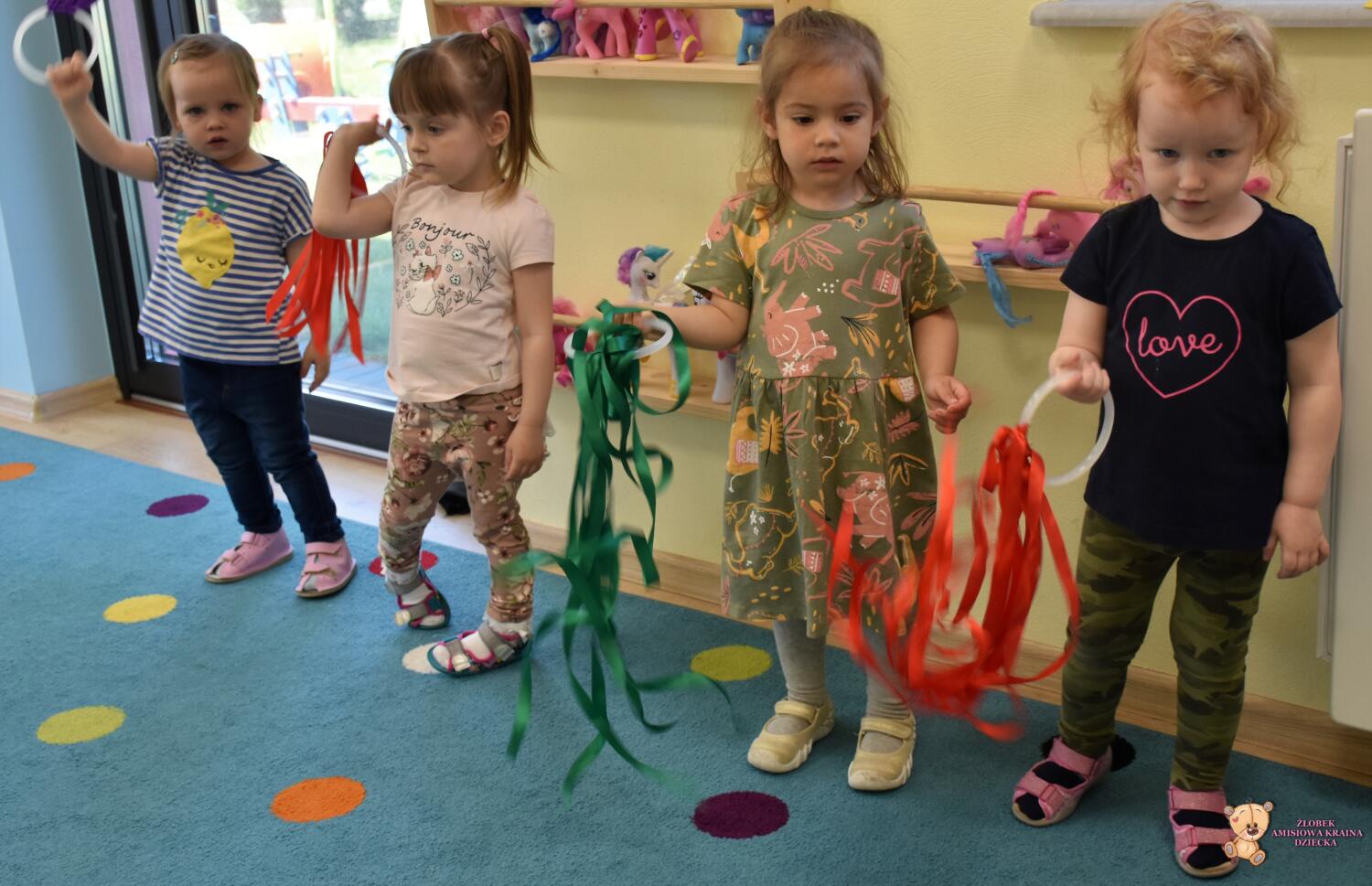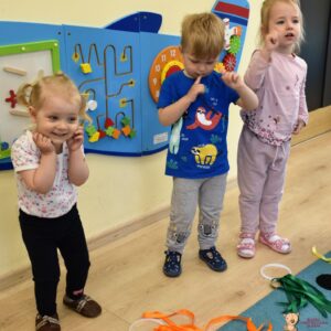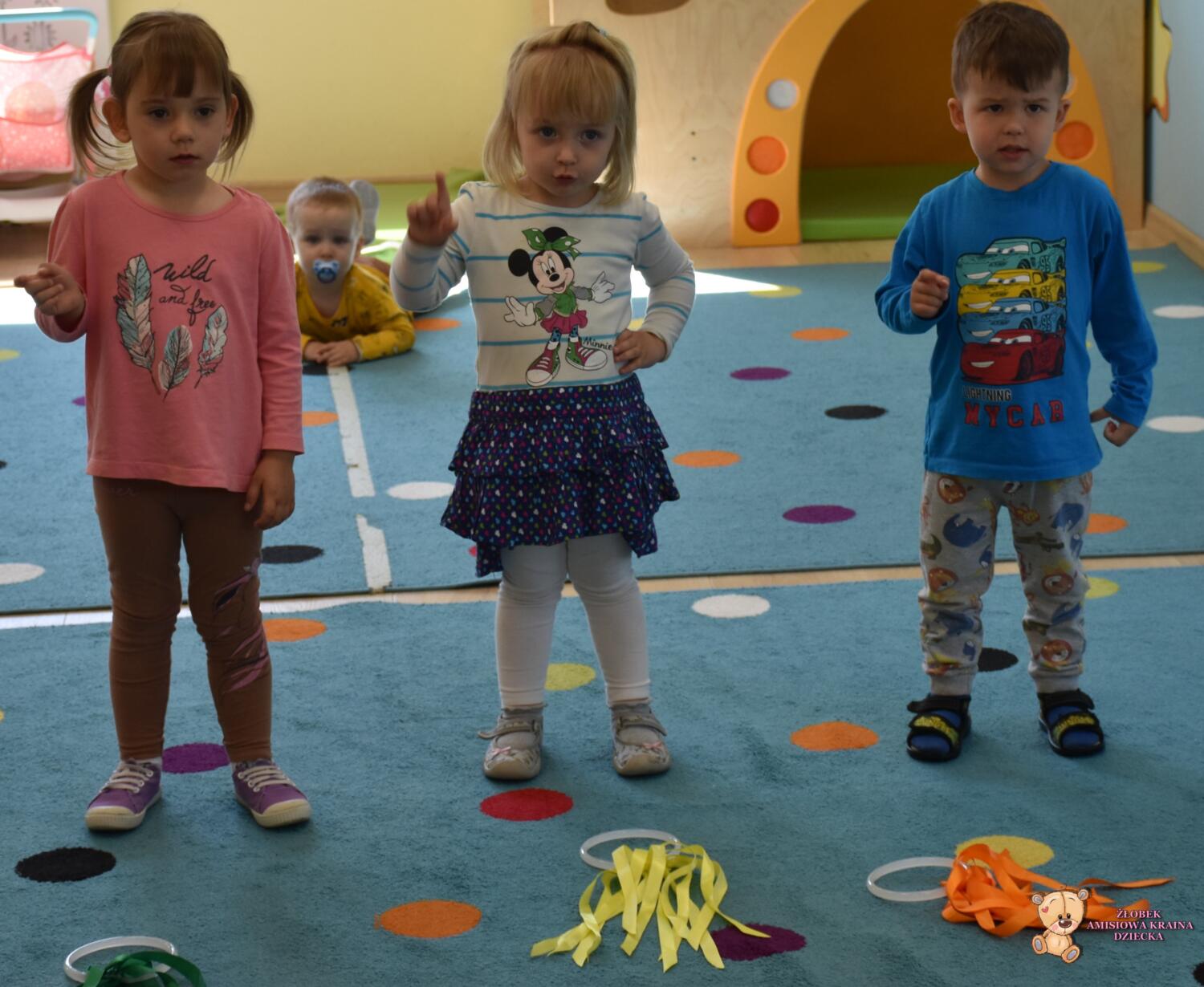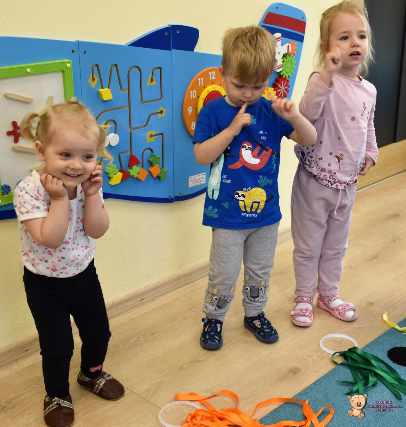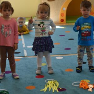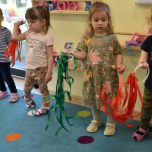 W dniu dzisiejszym nasze Niedźwiadki oraz Pszczółki zajmowały się zabawami tanecznymi przy wesołych piosenkach. Używaliśmy do tego instrumentów muzycznych oraz kolorowych szarf