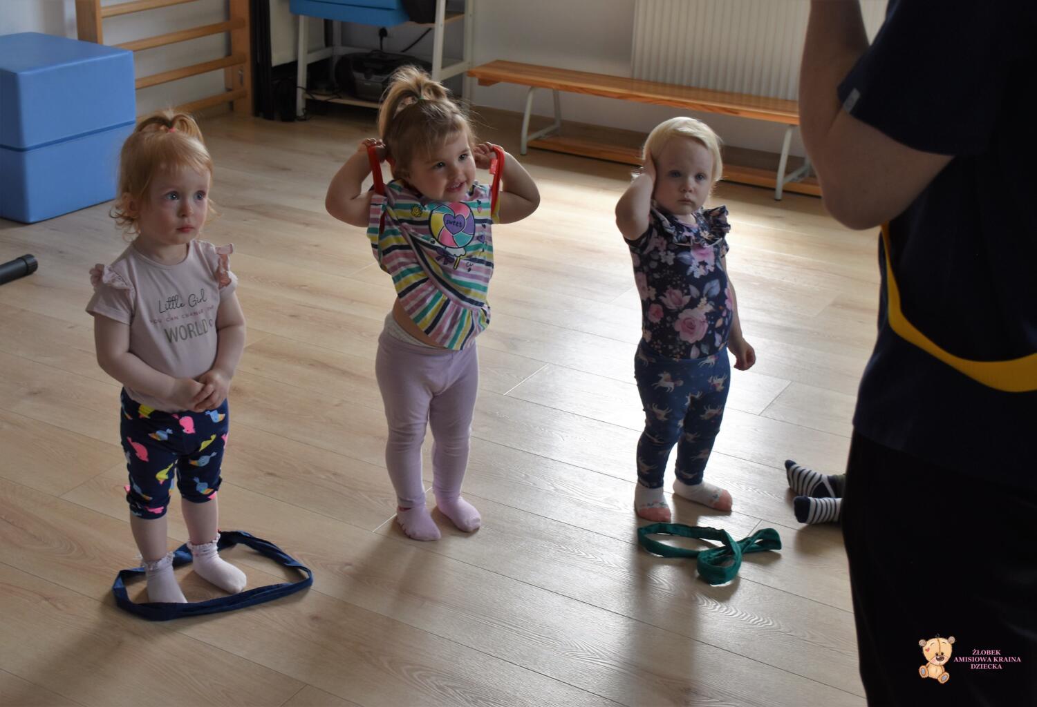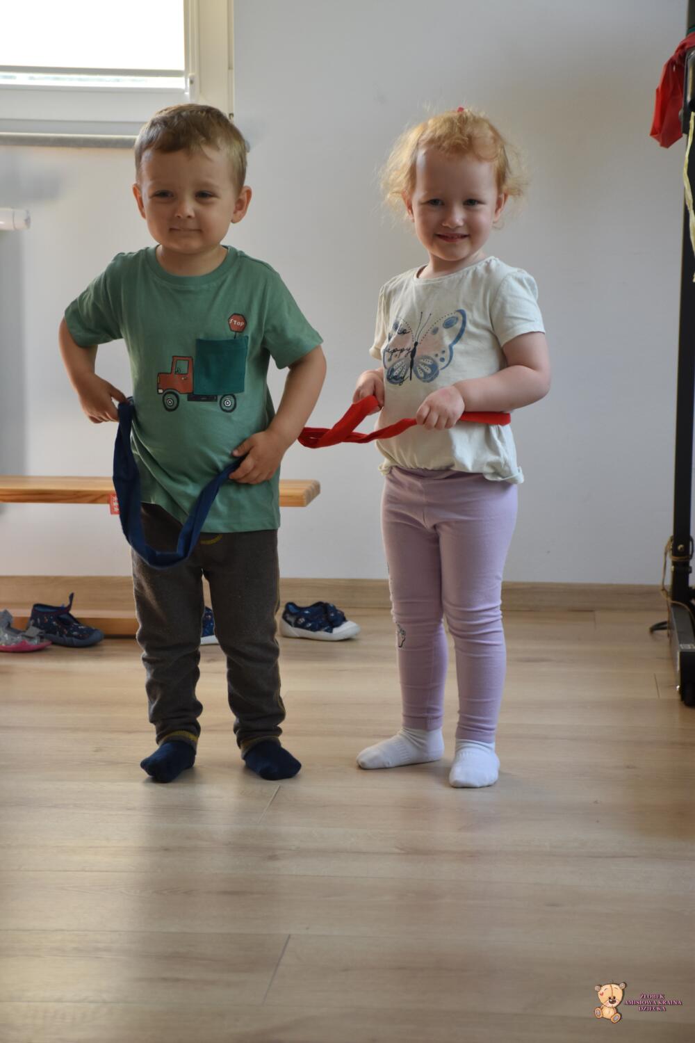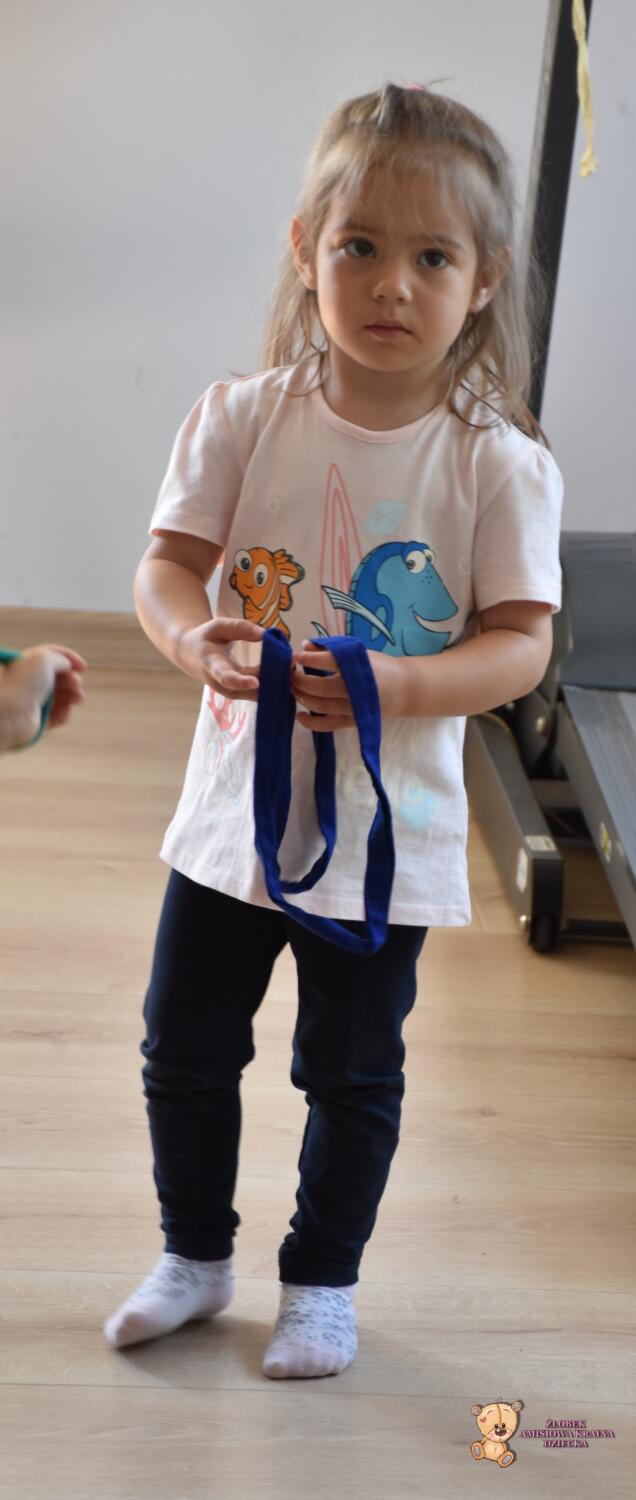 Dziś zabawy z szarfami rozwijające koordynację ruchową. Dzieci przekładały szarfy od góry do dołu przez głowę i całe ciało. Przeskakiwały do środka, przekładały szarfę za plecami z ręki do ręki. Później połączyliśmy się szarfami w pary i próbowaliśmy razem się poruszać
