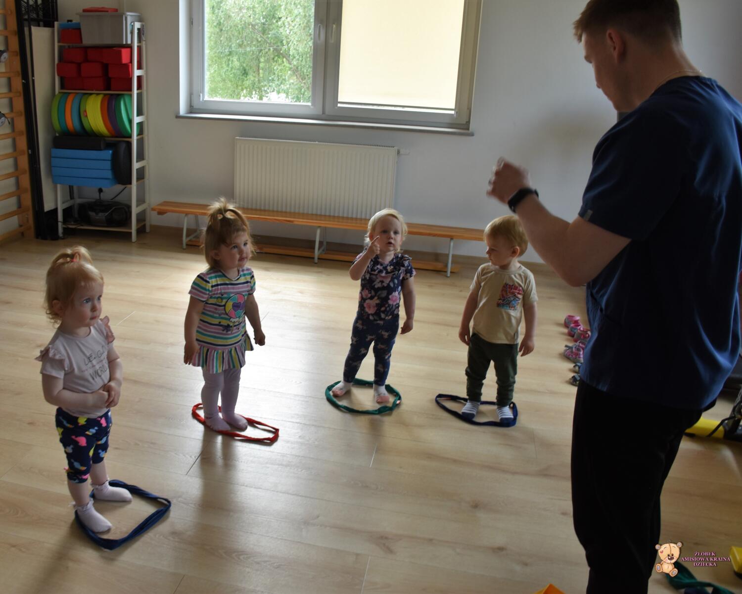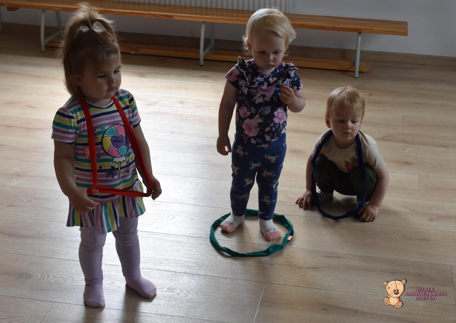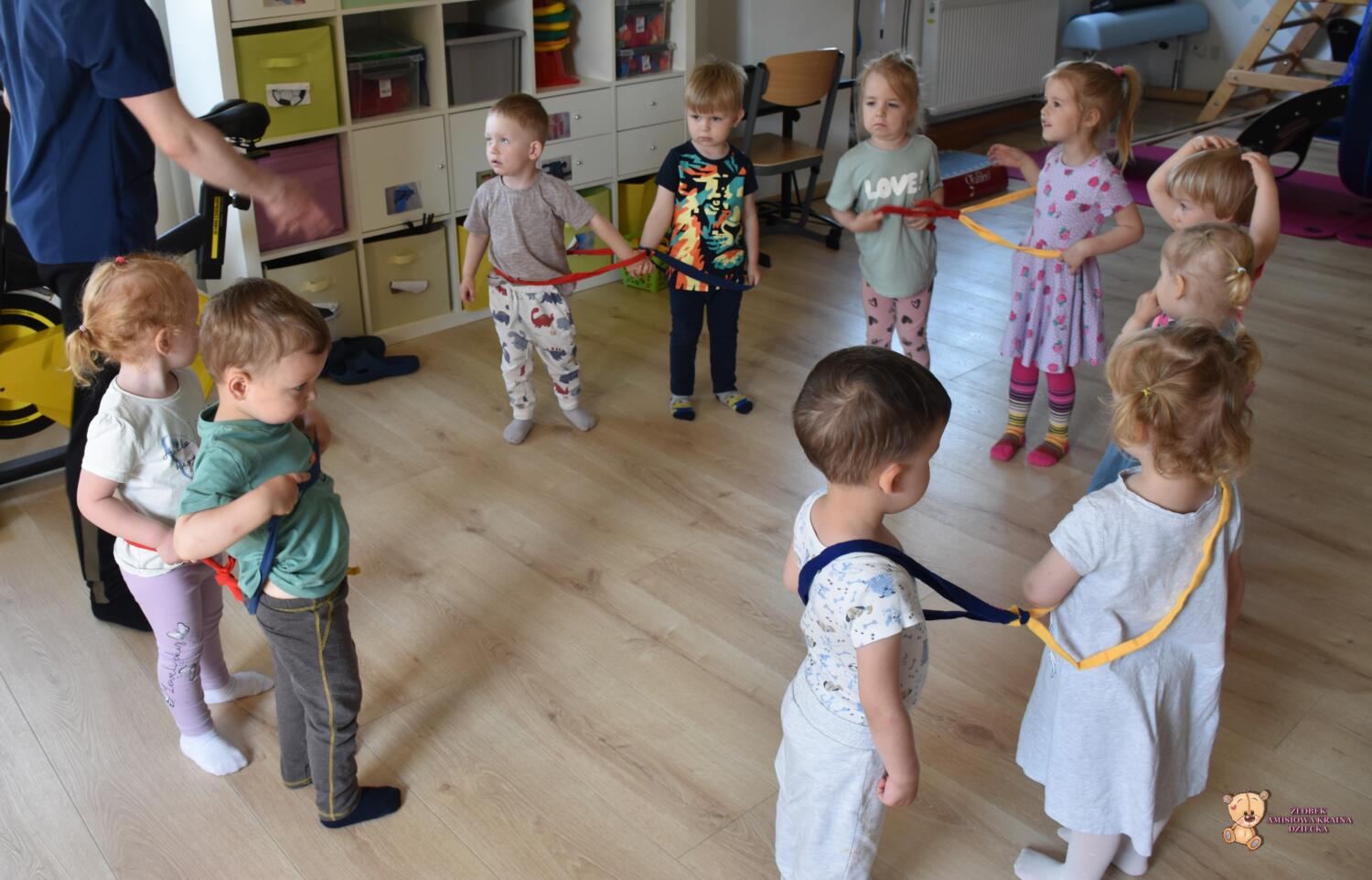 Dziś zabawy z szarfami rozwijające koordynację ruchową. Dzieci przekładały szarfy od góry do dołu przez głowę i całe ciało. Przeskakiwały do środka, przekładały szarfę za plecami z ręki do ręki. Później połączyliśmy się szarfami w pary i próbowaliśmy razem się poruszać