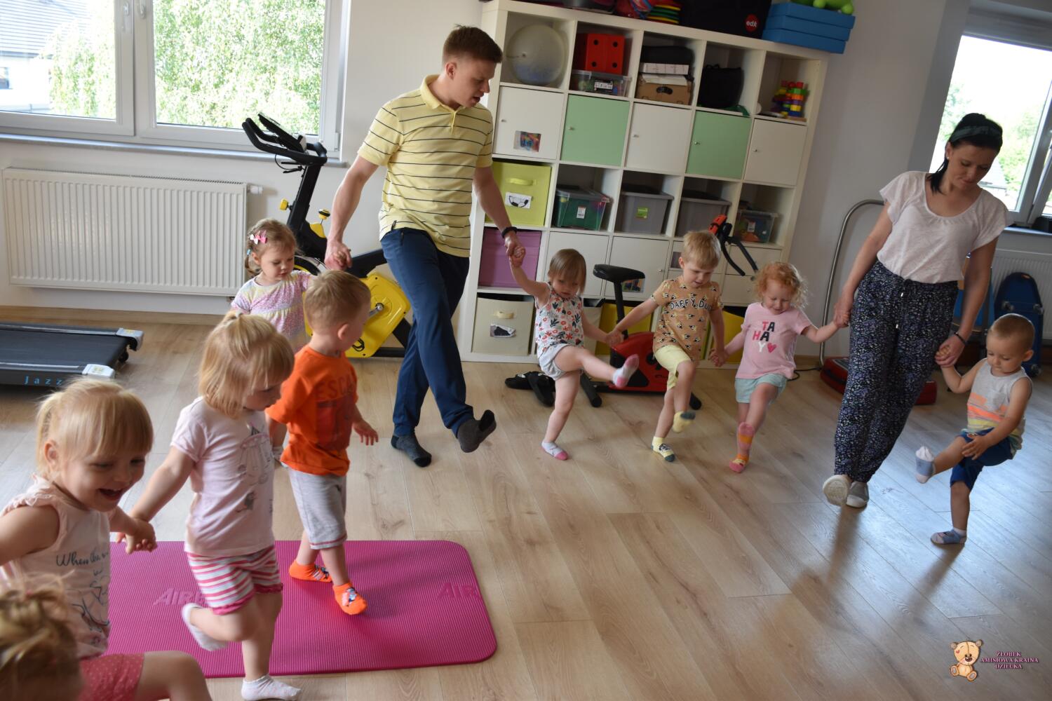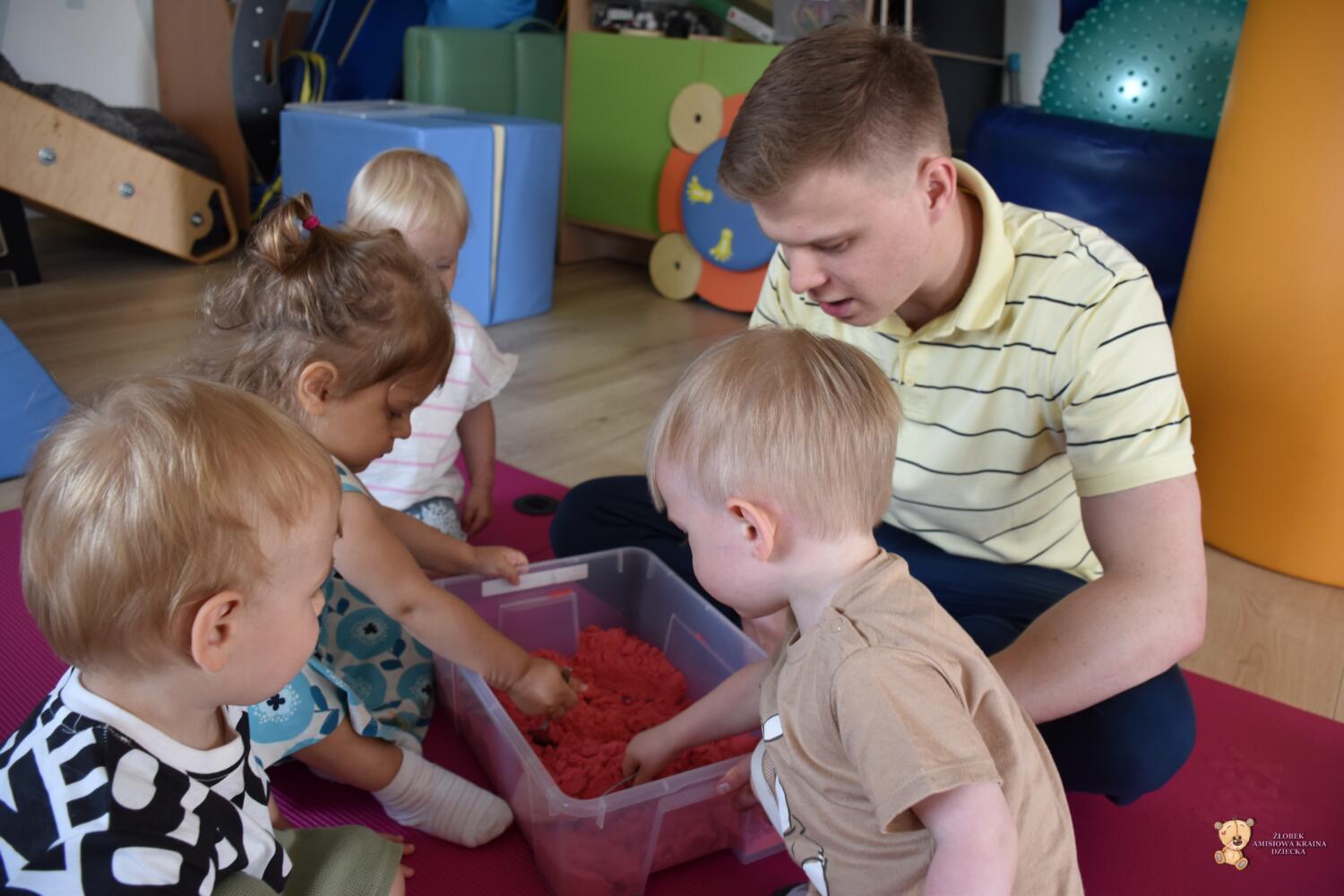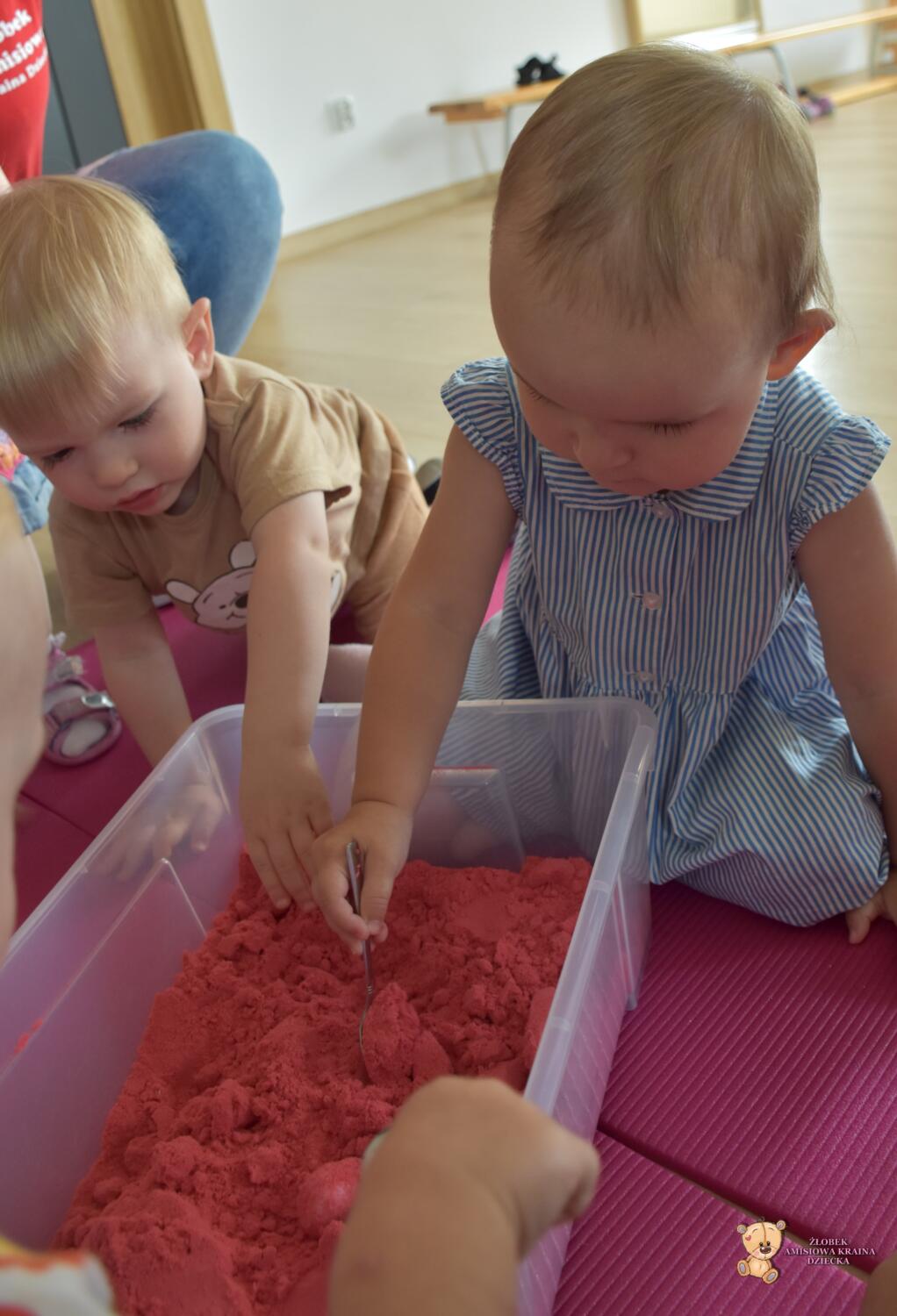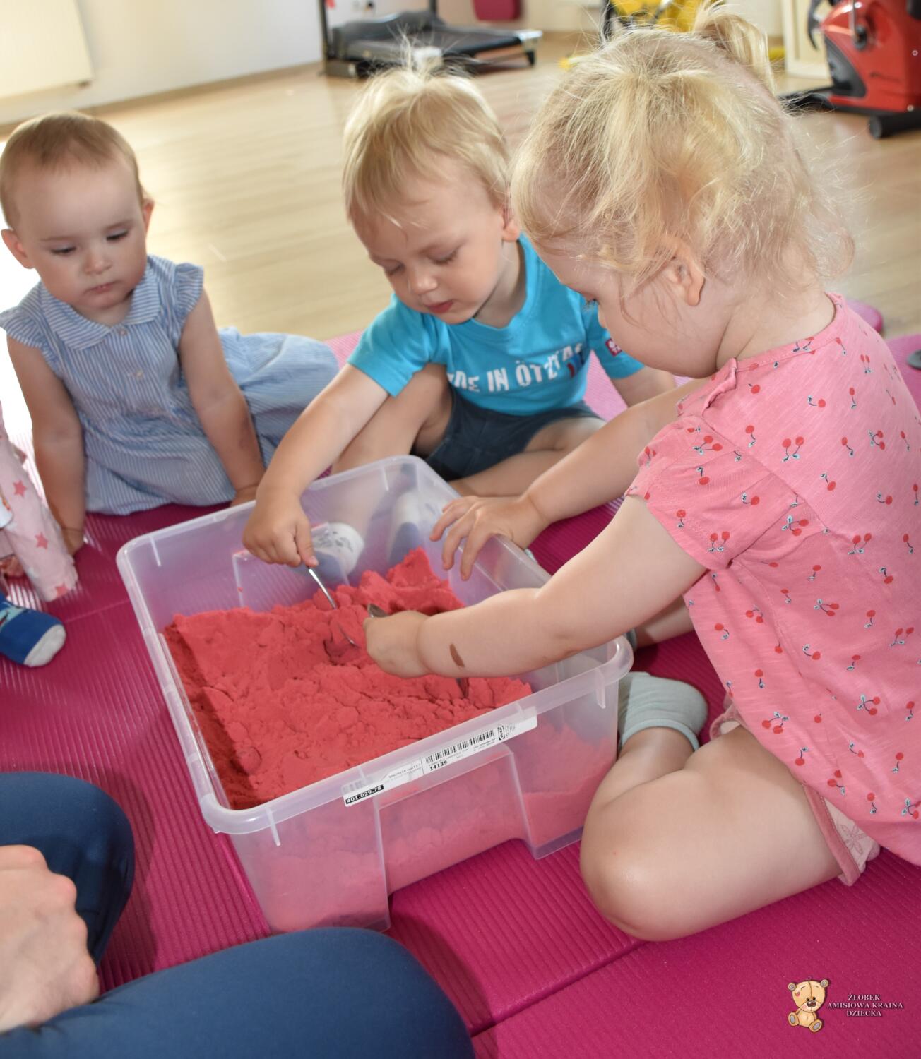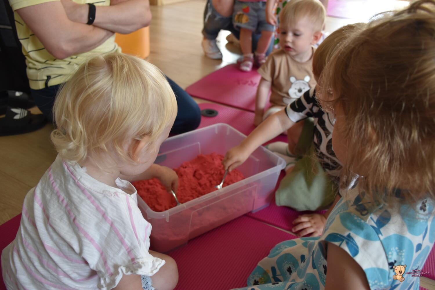 Dziś Starszaki ćwiczyły równowagę i koordynację we wspólnej zabawie w kole, a później przenosiły piłeczkę na łyżeczce. Na koniec dzieci zgadywały po słuchu co jest ukryte w drewnianych słoiczkach i dopasowywały w pary słoiki o tej samej zawartości. Młodsze dzieci dziś bawiły się w piasku kinetycznym, wyszukując ukrytych piłeczek najpierw łyżeczką, a później bezpośrednio rączka.