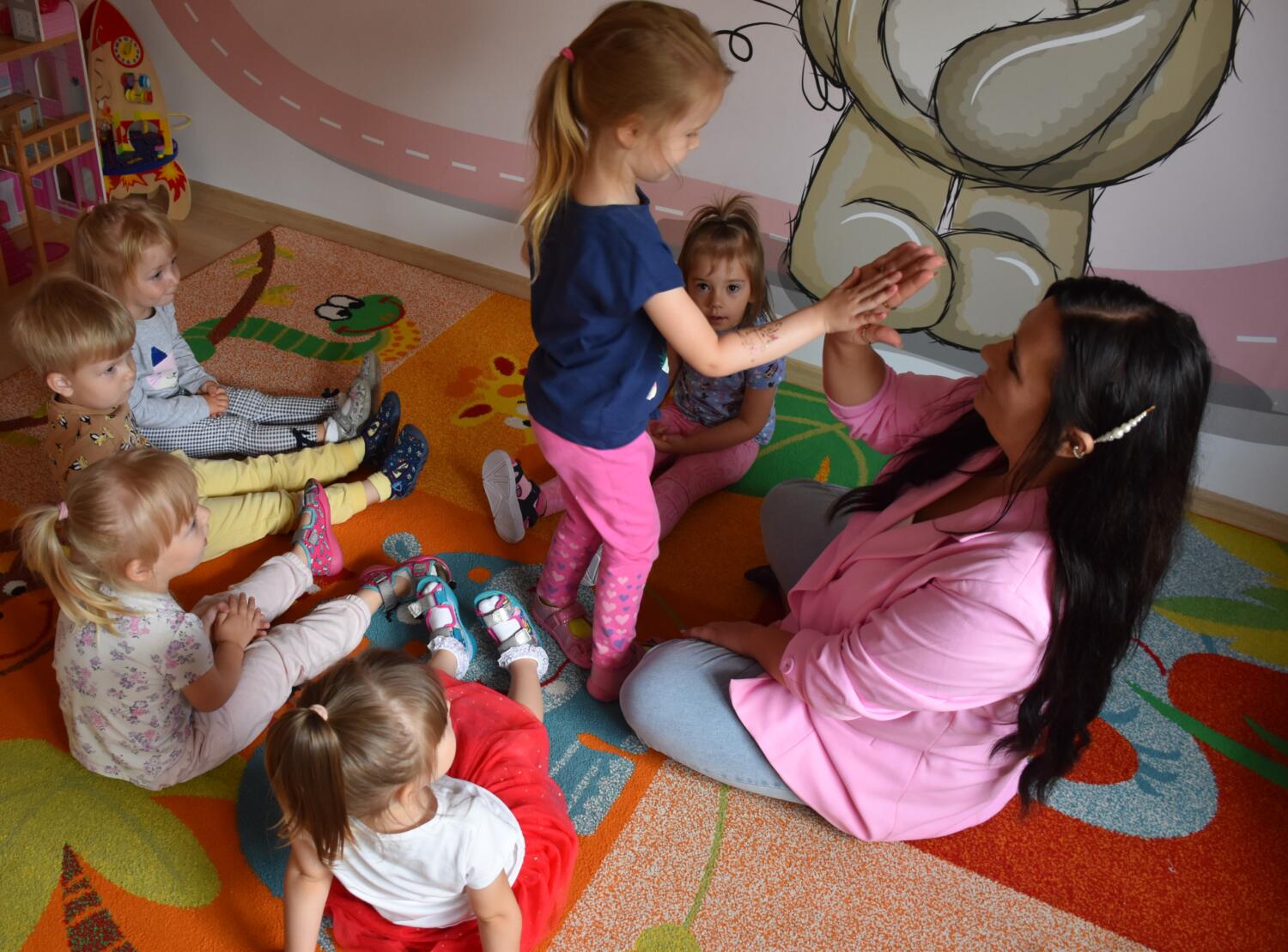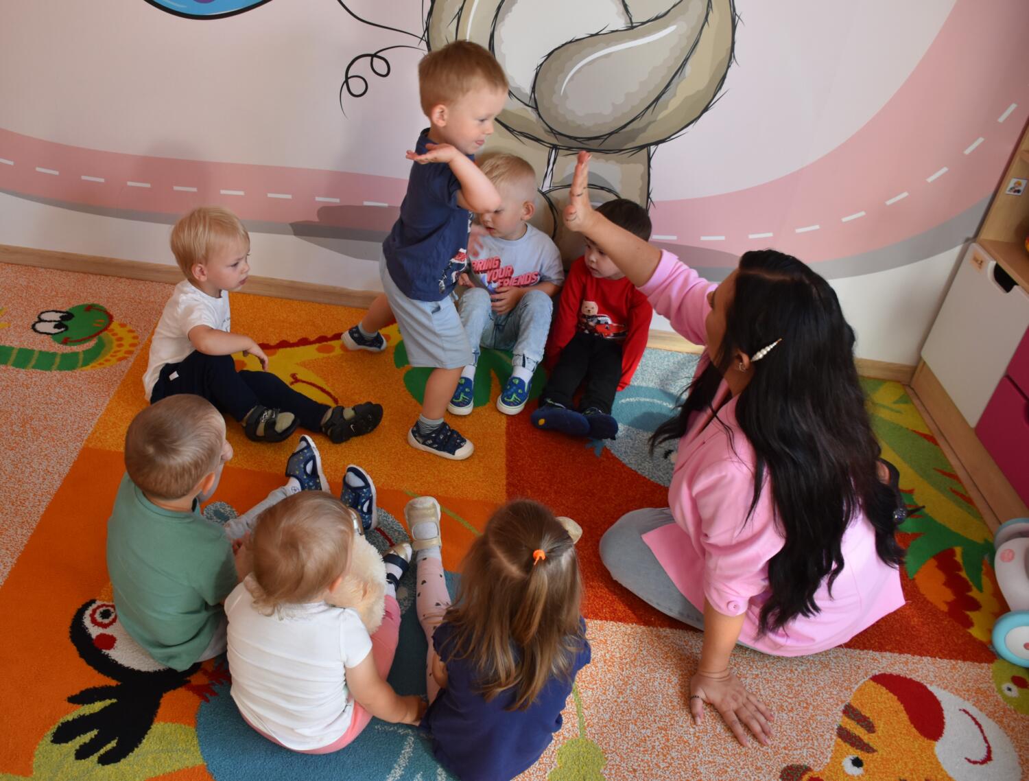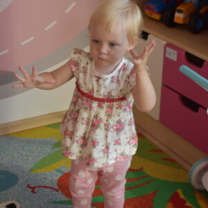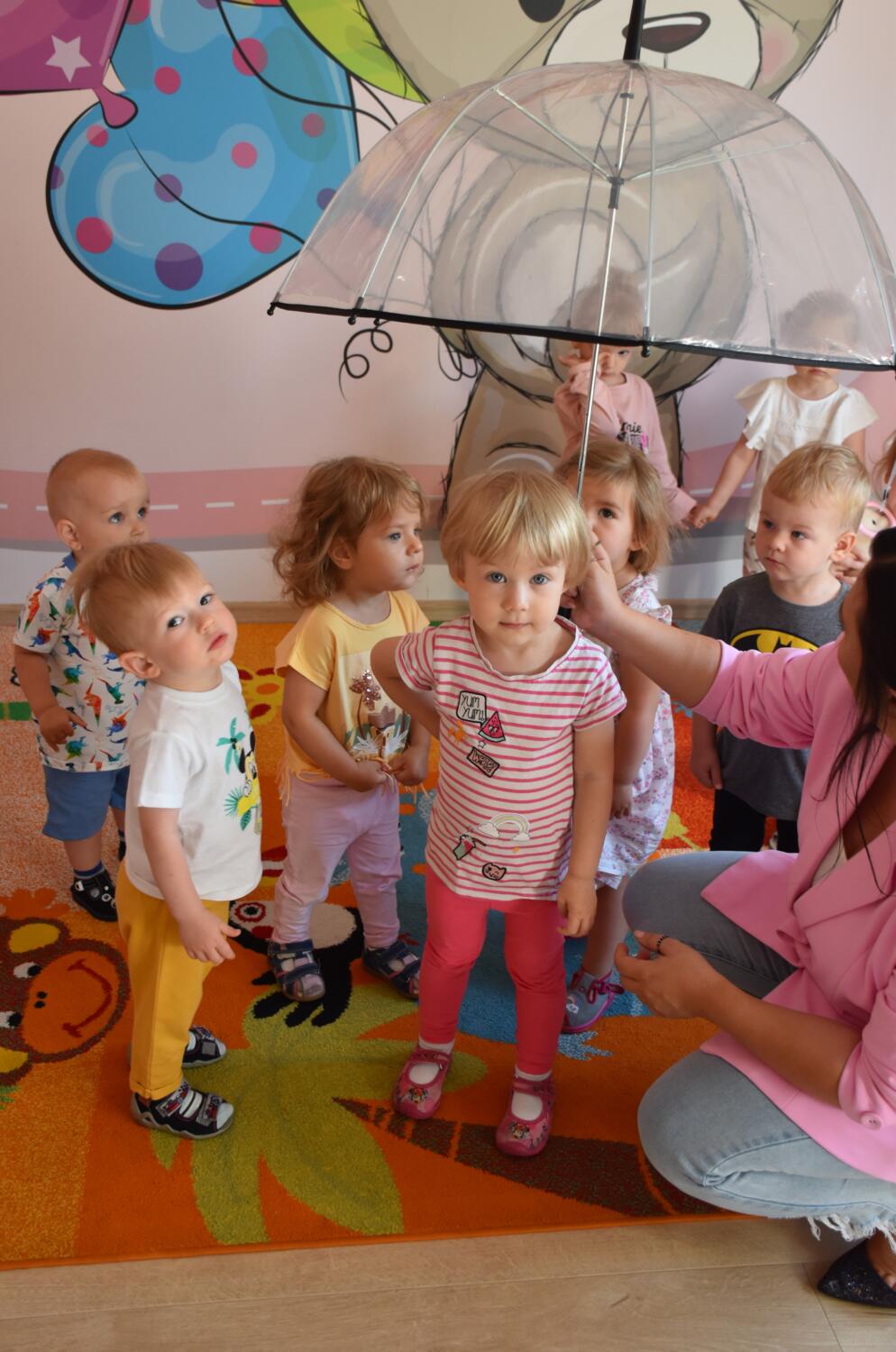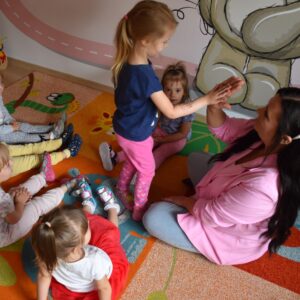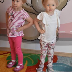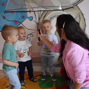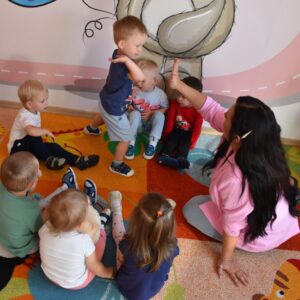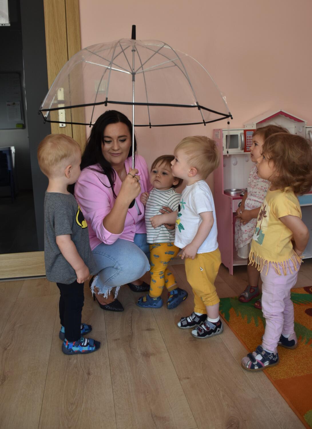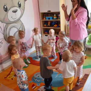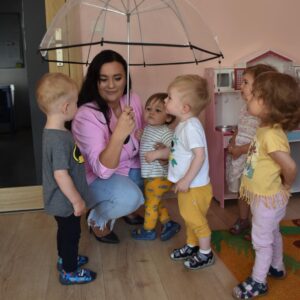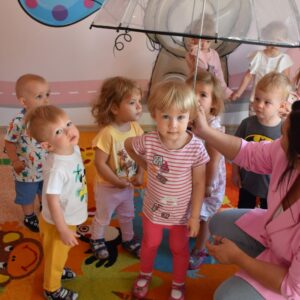 Dziś na logorytmice tańce z pokazywaniem ! Dziecko doskonale znają już swoje części ciała co udowodniły tańcząc i pkkazujac je w coraz szybszy rytm muzyki. Następnie ćwiczyliśmy uważności słuchowa chowając się pod parasolem przed dreszczykiem