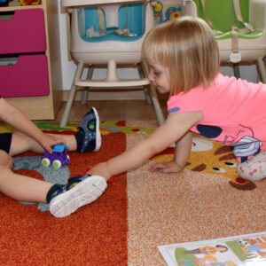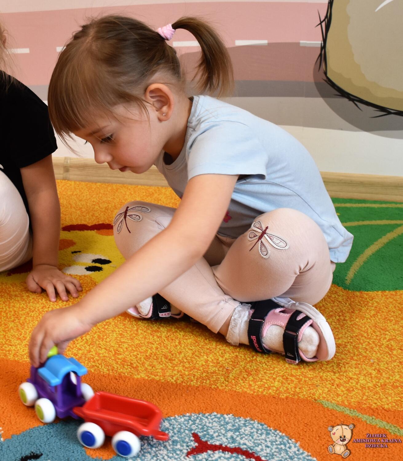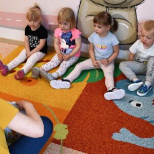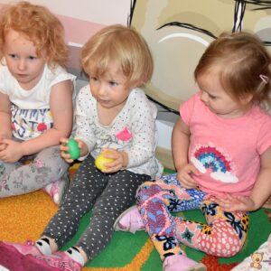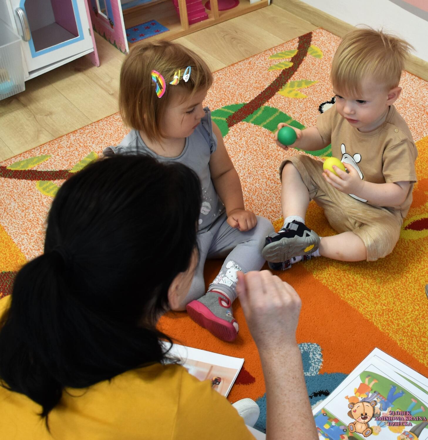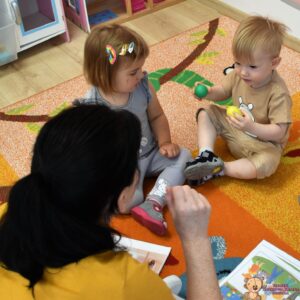 Niebawem niektóre z naszych Amisiaków staną się przedszkolakami. Dlatego dziś poznały historię p.t. „Pierwszy dzień Kamilka w przedszkolu”. Dowiadujemy się z niego, że przedszkole to miejsce radosne, pełne zabawek, nowych kolegów i koleżanek. Kamilek mimo obaw, czy mu się spodoba, czy da radę wytrwać cały dzień bez mamy, świetnie sobie poradził. Miła pani i piękna lokomotywa, którą bawił się z nowym kolegą Karolkiem, sprawiły że dzień był wyjątkowo udany. Nasze Amisiaki wiedzą, że w przedszkolu tak jak w żłobku czas mija na dobrej zabawie. Na koniec dzieci próbowały na podstawie ilustracji opowiedzieć co robią dzieci w przedszkolu oraz naśladowały dźwięki z opowiadania: jazdę lokomotywy i muzykę z zajęć rytmicznych.