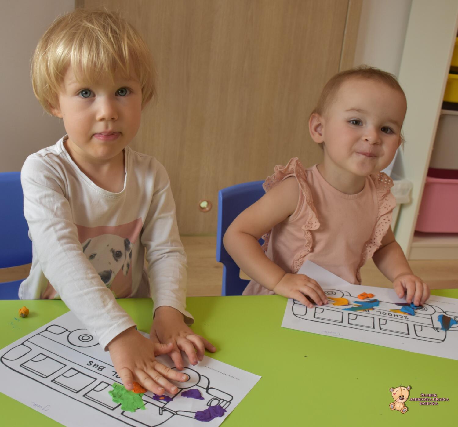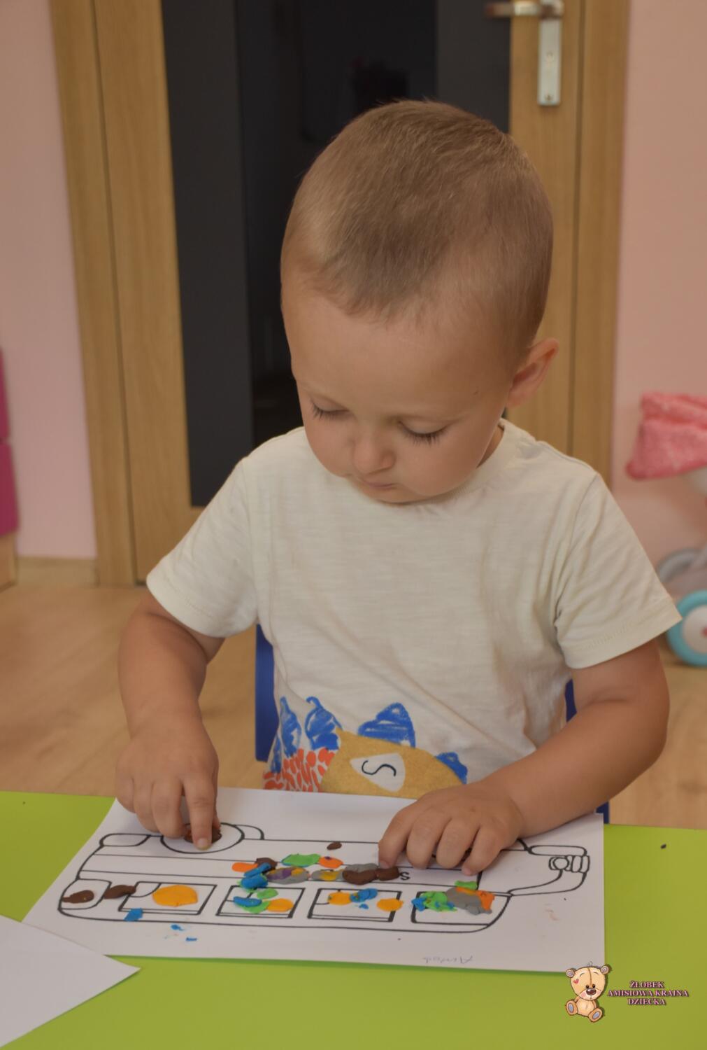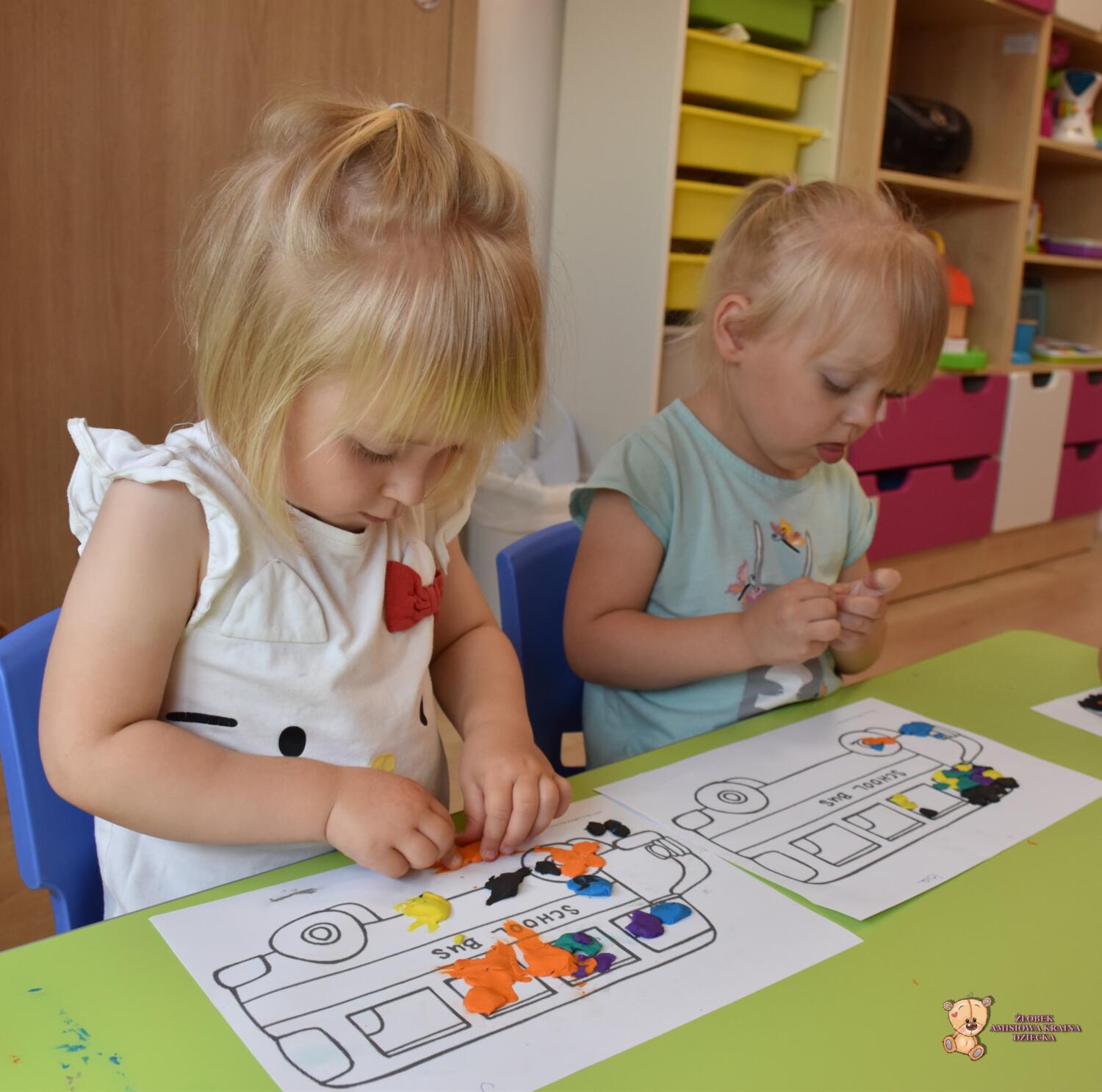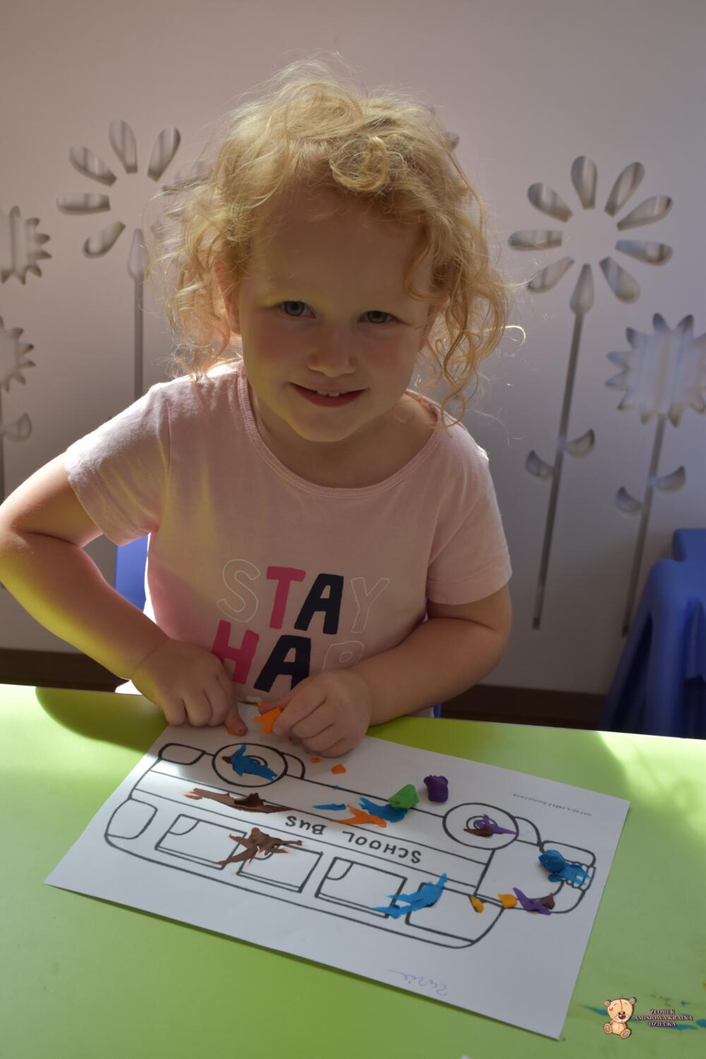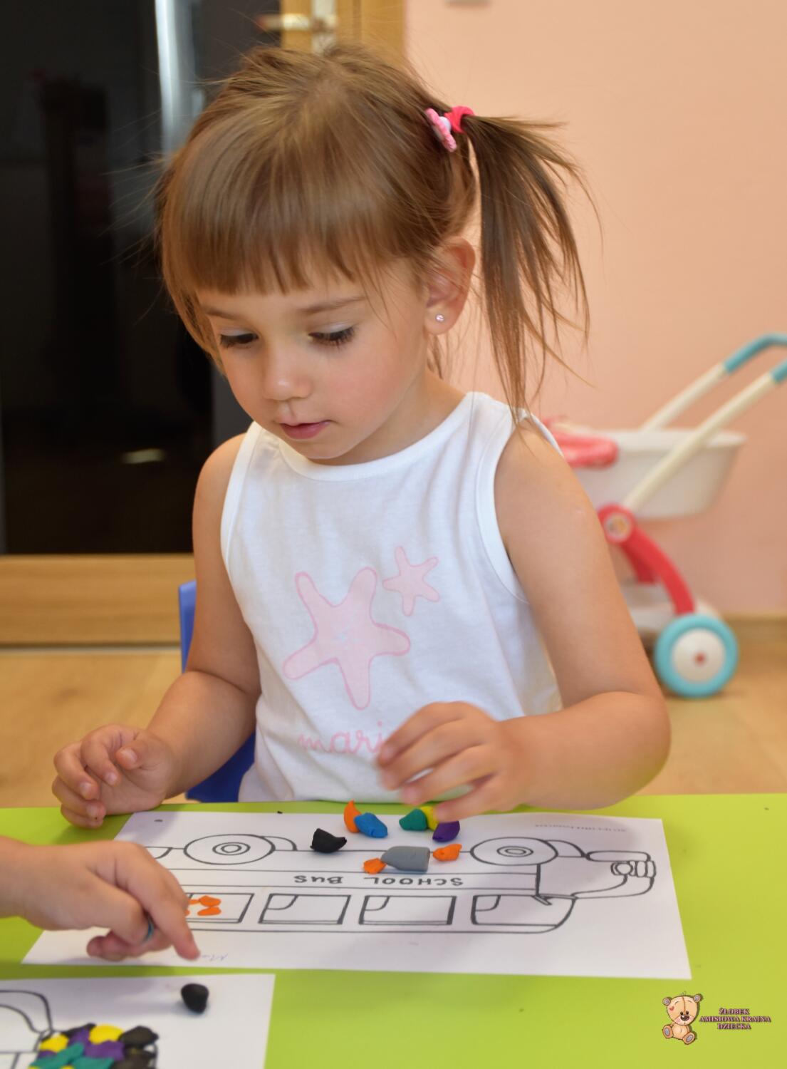 Podczas zajęć plastycznych dzieci wyklejały plasteliną autobus szkolny ćwicząc przy tym motorykę małą wzmacniając mięsnie palców. Wykorzystując kolorową plastelinę, dzieci utrwalały nazwy kolorów.