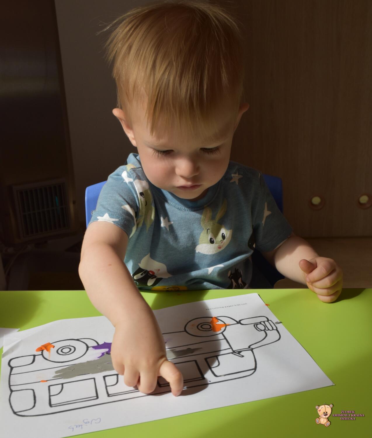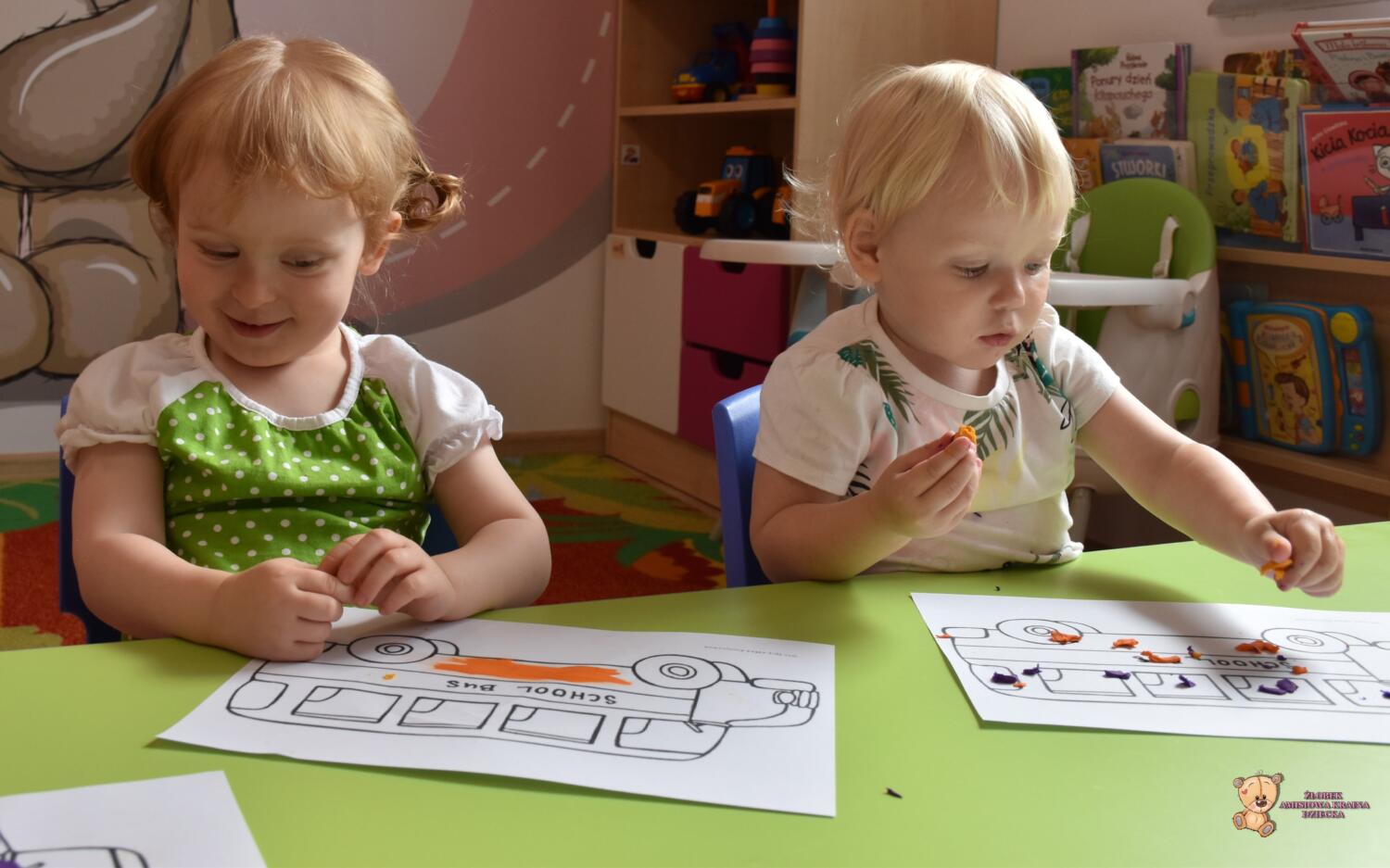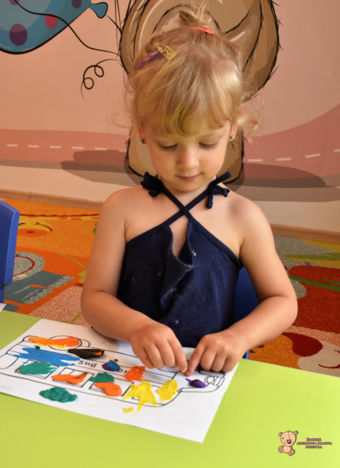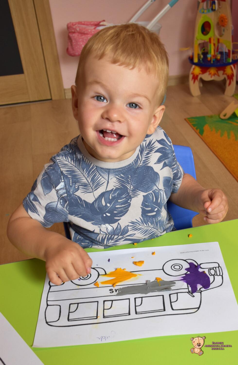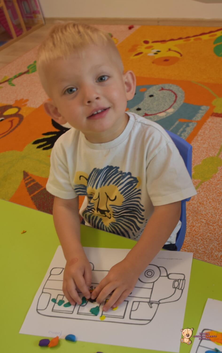 Podczas zajęć plastycznych dzieci wyklejały plasteliną autobus szkolny ćwicząc przy tym motorykę małą wzmacniając mięsnie palców. Wykorzystując kolorową plastelinę, dzieci utrwalały nazwy kolorów.
