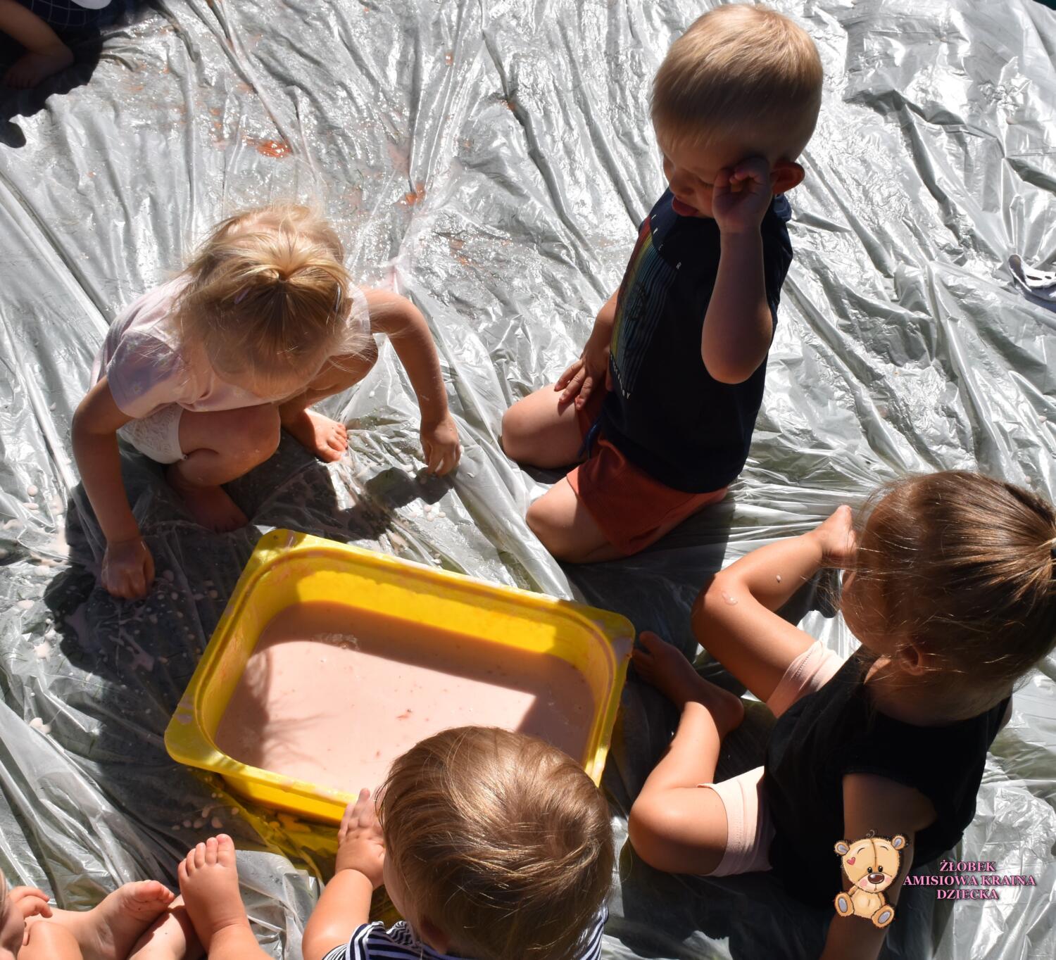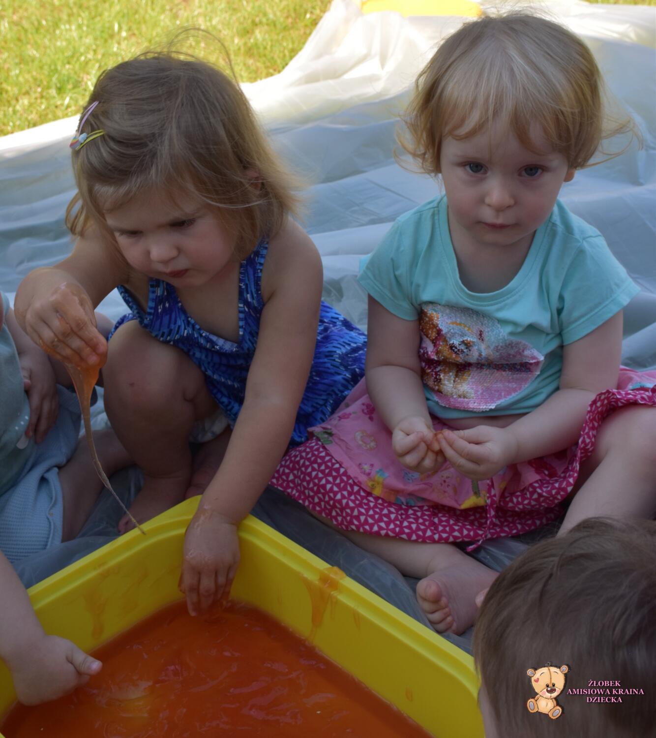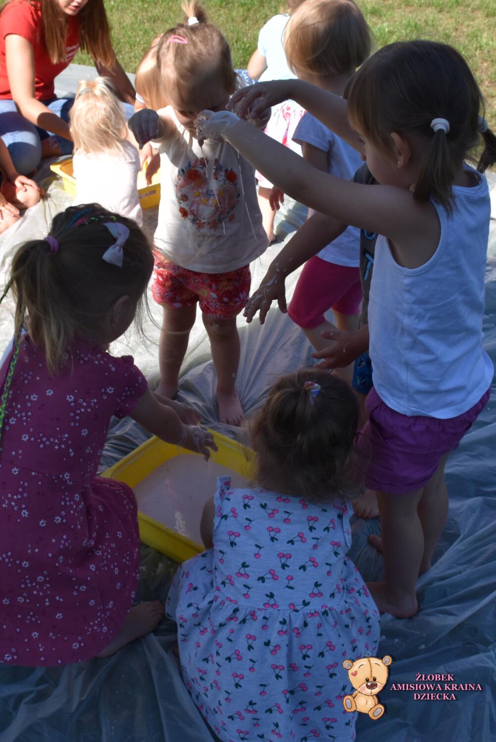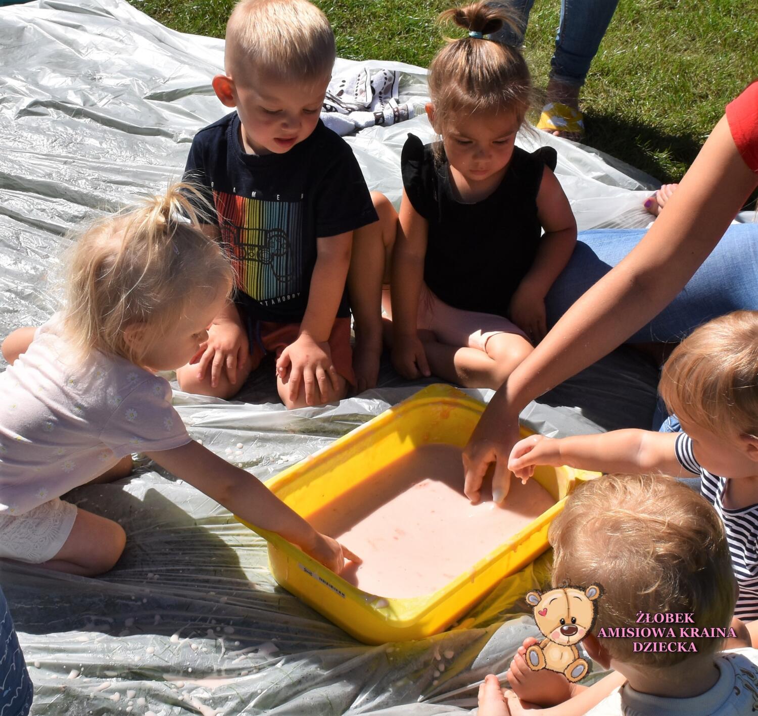 Dziś Amisiaki wykorzystały piękna pogodę i bawiły się na zajęciach na dworze. Nasze maluchy bawiły się w miękkim, pachnącym kiślu. Zaś starszaki i średniaki