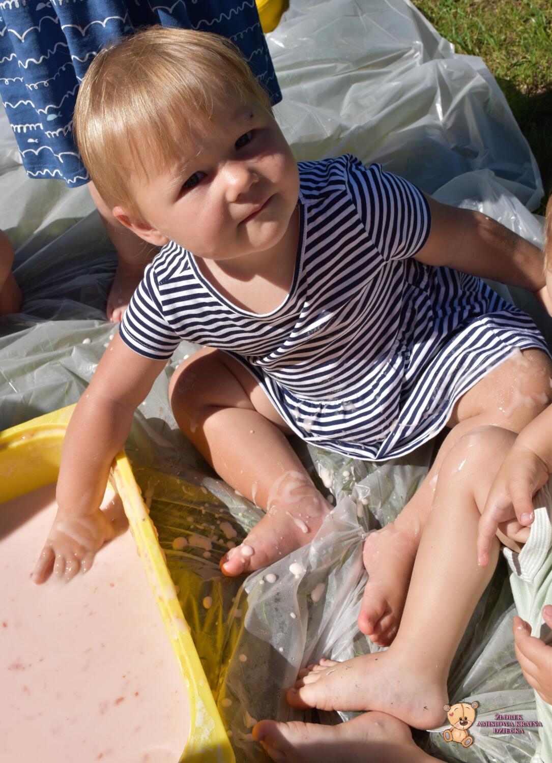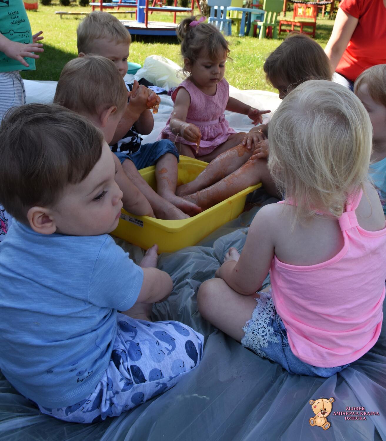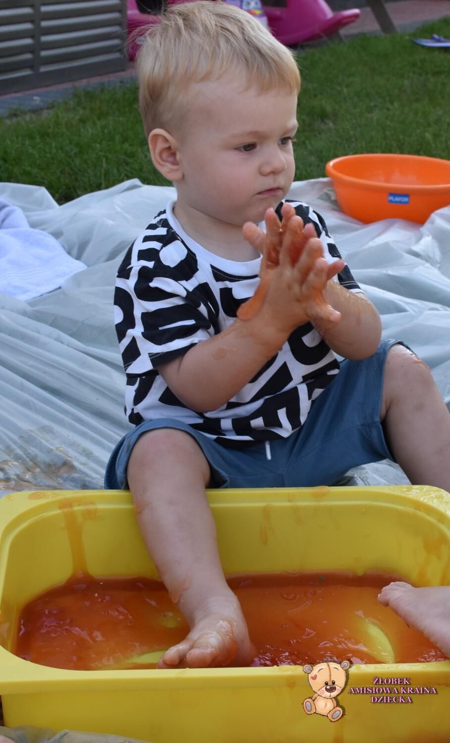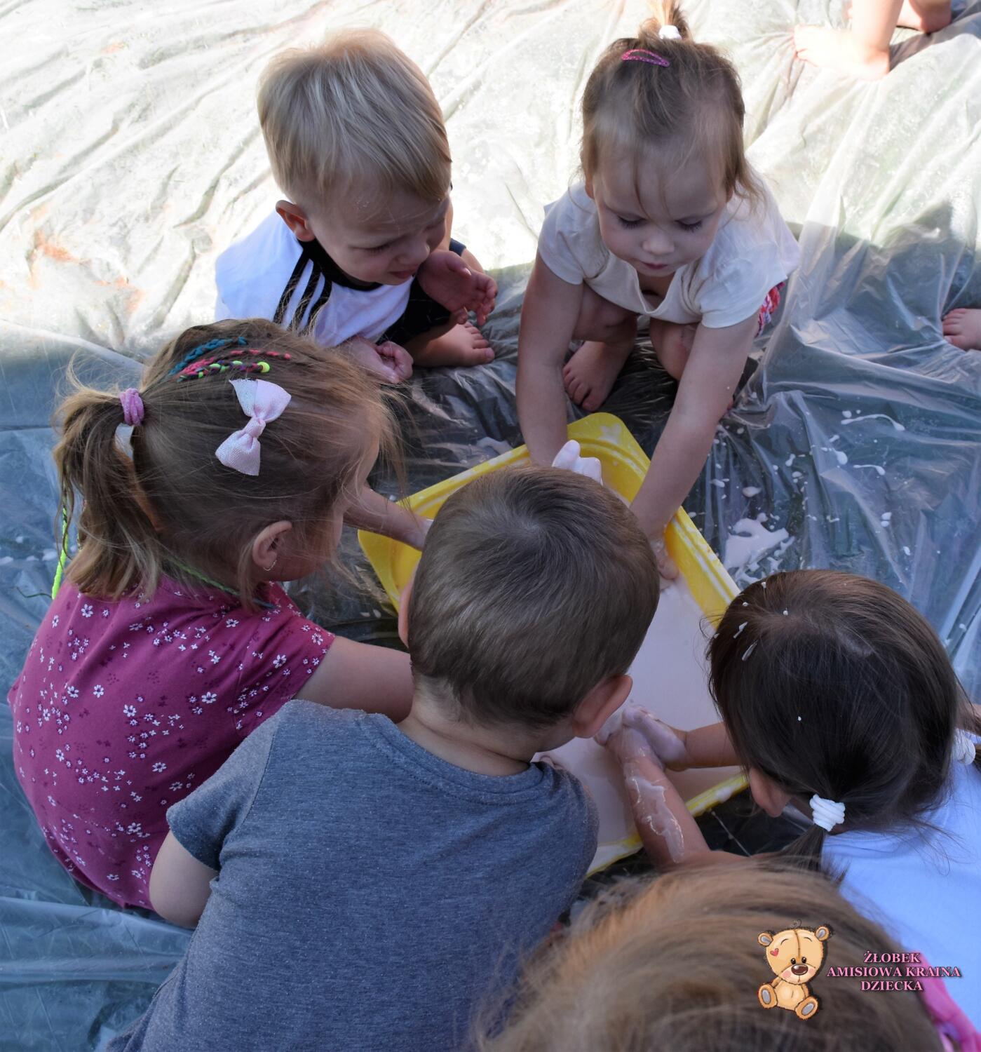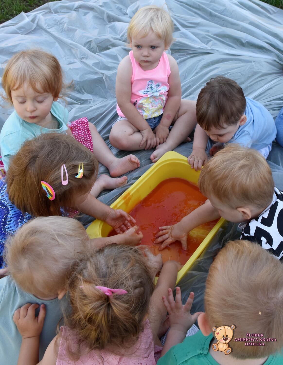 Dziś Amisiaki wykorzystały piękna pogodę i bawiły się na zajęciach na dworze. Nasze maluchy bawiły się w miękkim, pachnącym kiślu. Zaś starszaki i średniaki