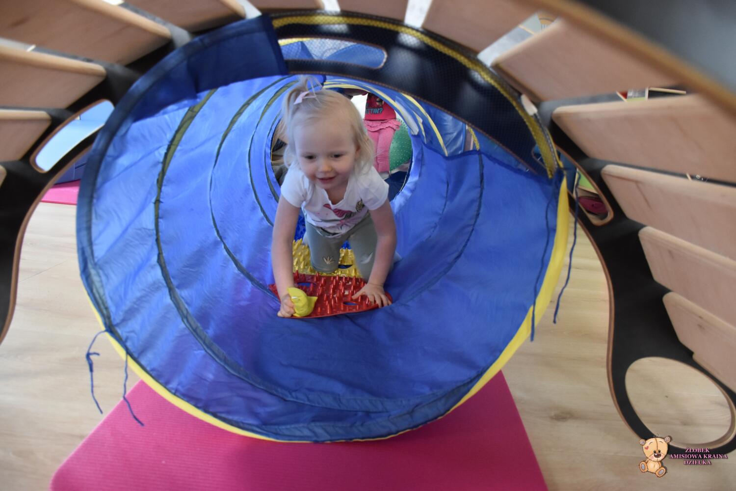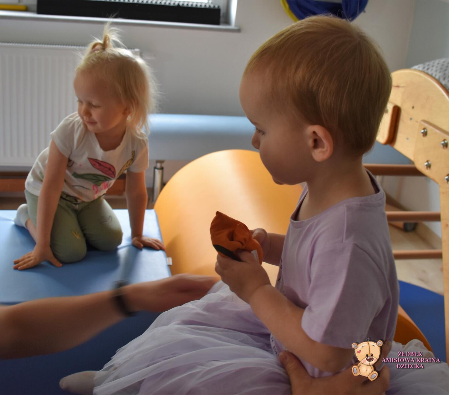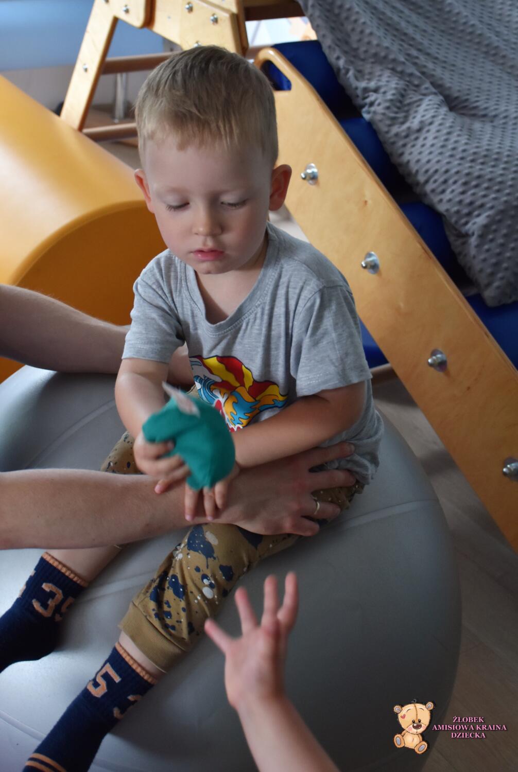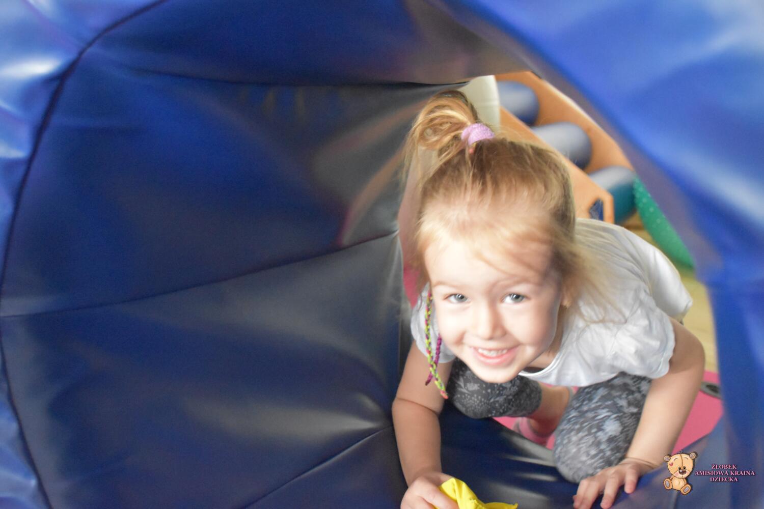 Dzieci dziś miały do przejścia tor przeszkód, dzięki czemu rozwijały swoje reakcje równoważne, orientację w przestrzeni, koordynację ruchową, umiejętność współdziałania, a także stymulowały zmysł dotyku. Podczas pokonywania toru przeszkód musiały wspinać się po piankowych kształtach, utrzymywały równowagę siedziąc na piłce, podawały sobie nawzajem woreczki w trudnych pozycjach i przechodziły przez tunel, w którym była rozłożona mata sensoryczna. Po pokonaniu toru przeszkód, każde z dzieci miało okazję pobawić się chwilę zabawkami z różnych faktur, tak aby stymulować swój zmysł dotyku 🙂