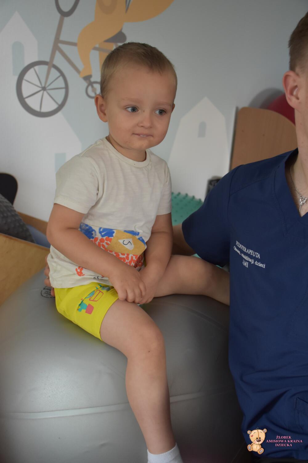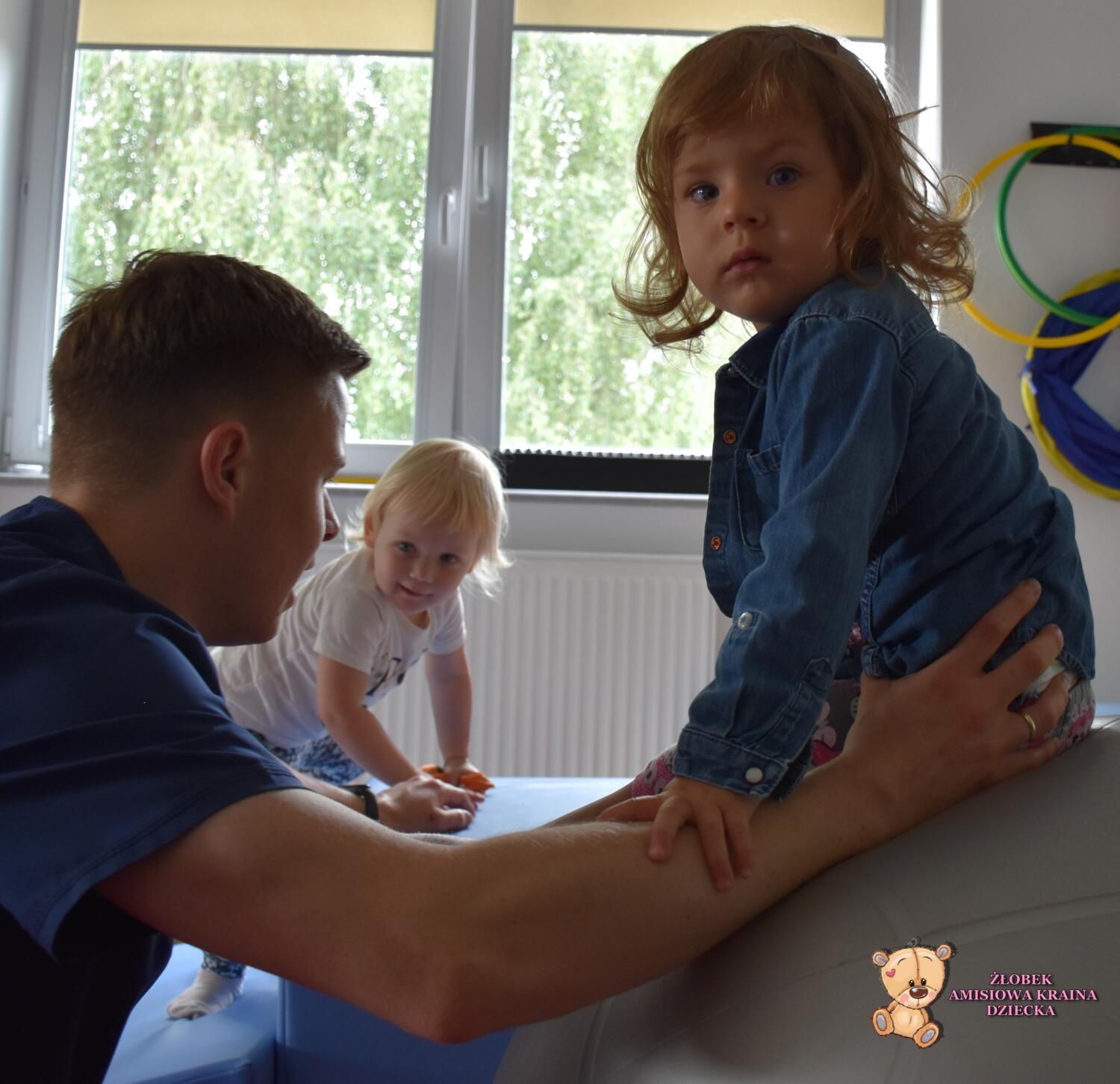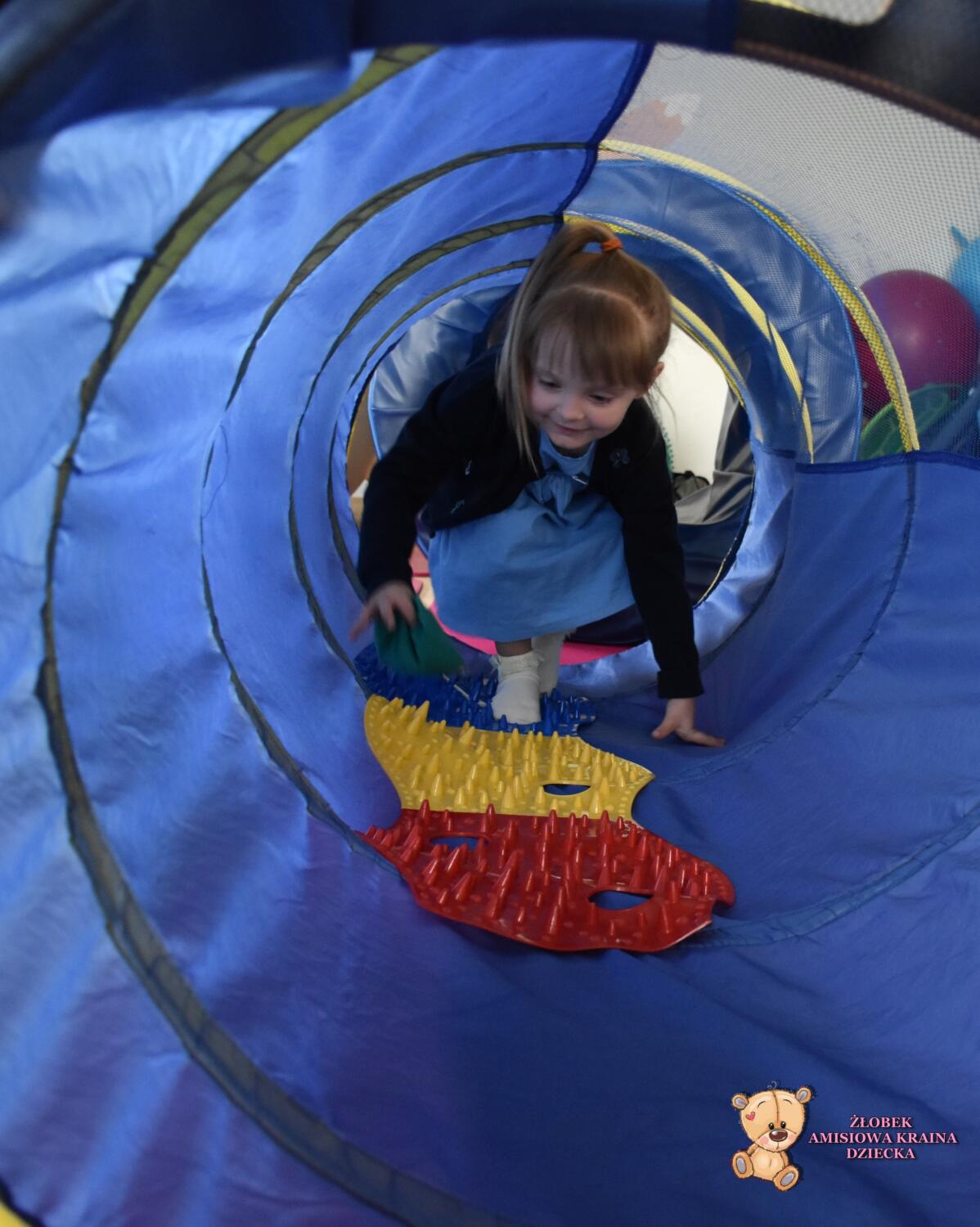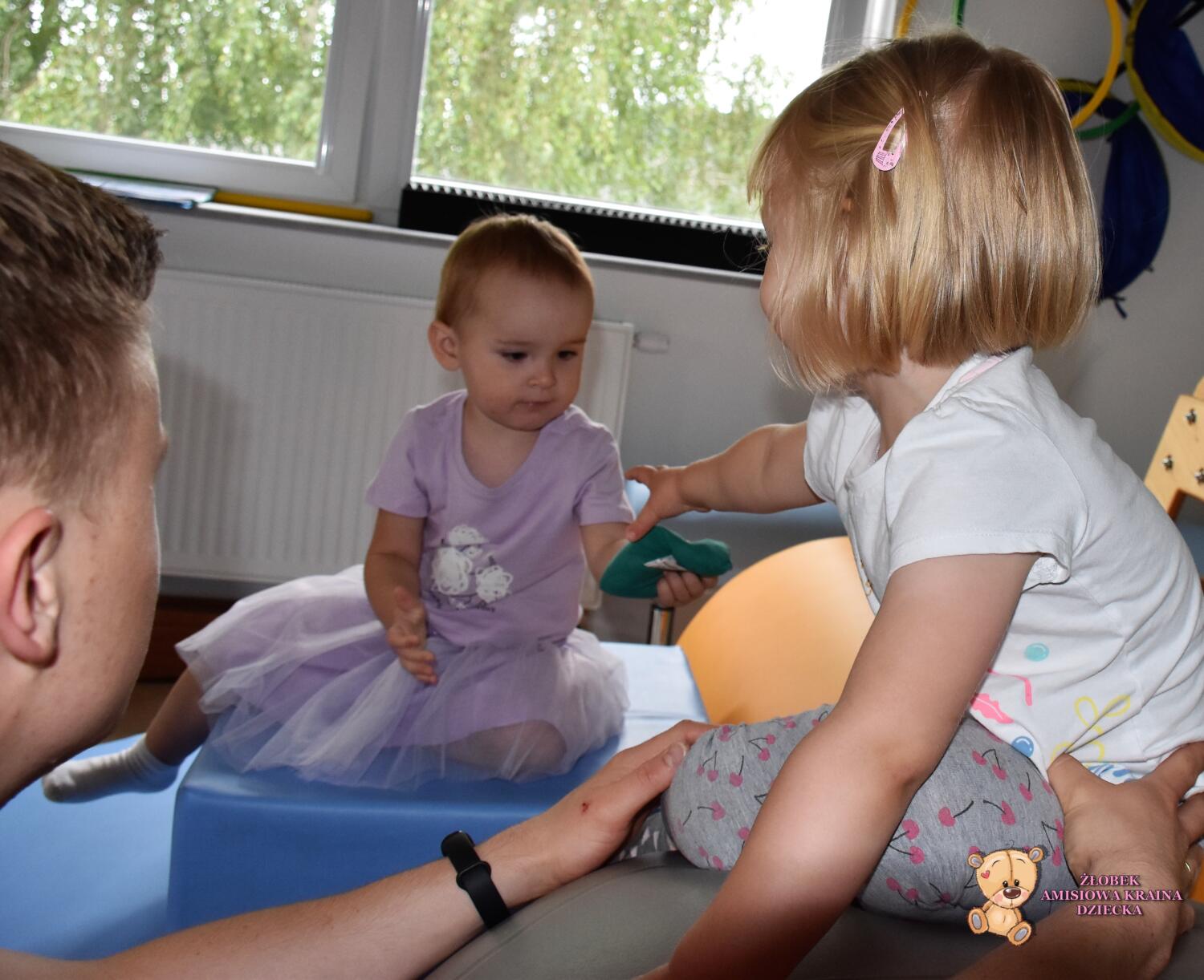 Dzieci dziś miały do przejścia tor przeszkód, dzięki czemu rozwijały swoje reakcje równoważne, orientację w przestrzeni, koordynację ruchową, umiejętność współdziałania, a także stymulowały zmysł dotyku. Podczas pokonywania toru przeszkód musiały wspinać się po piankowych kształtach, utrzymywały równowagę siedziąc na piłce, podawały sobie nawzajem woreczki w trudnych pozycjach i przechodziły przez tunel, w którym była rozłożona mata sensoryczna. Po pokonaniu toru przeszkód, każde z dzieci miało okazję pobawić się chwilę zabawkami z różnych faktur, tak aby stymulować swój zmysł dotyku 🙂