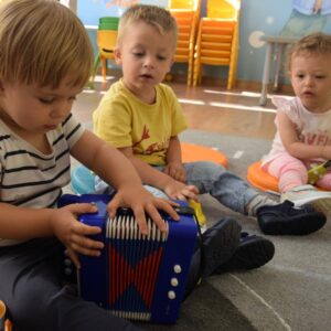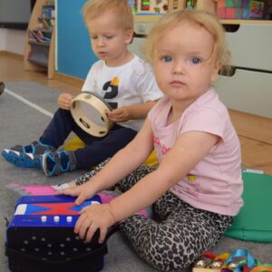 Dzisiejszy dzień adaptacji w grupie Zajączków był dniem niezwykle głośnym i radosnym. Ciocie pokazały maluszkom mnóstwo kolorowych instrumentów, na których AMIsie ochoczo zagrały. Każdy miał możliwość wyboru i zagrania na instrumencie, który najbardziej przypadł mu do gustu.