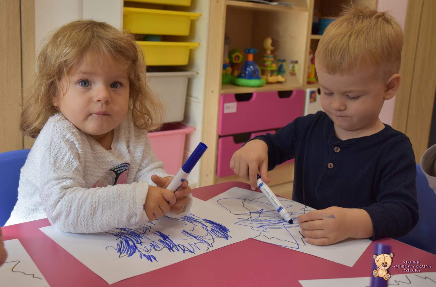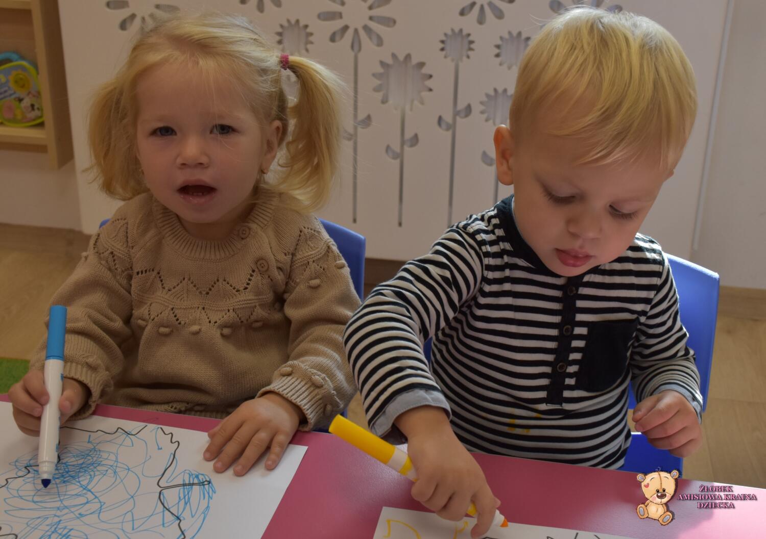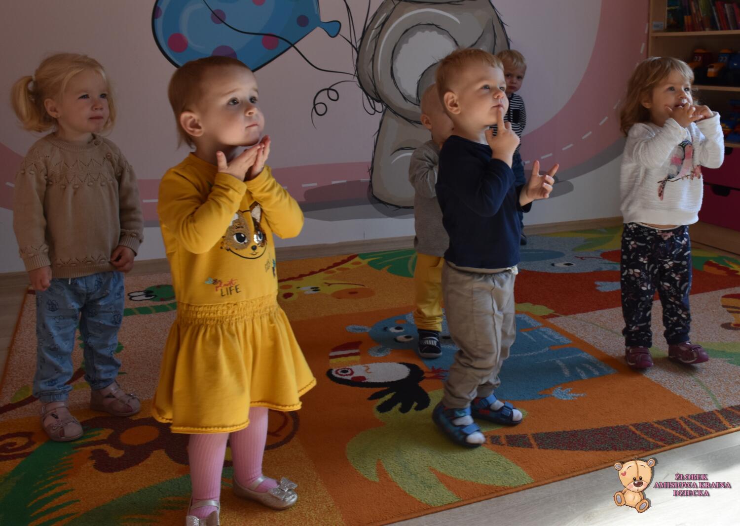 Dzisiejsze zajęcia z rytmiki rozpoczęły się od powtórzeń z poprzednich zajęć. Pokazywaliśmy gdzie mamy nosek, oczy, ząbki oraz gdzie znajdują się poszczególne rzeczy w naszej Sali. W kolejnej części zajęć dzieci zapoznały się z nowym instrumentem – grzechotką ( inaczej marakasy), osłuchiwały się z nową piosenką pt „Jesień” https://www.youtube.com/watch?v=m3X_xds8Enk ,oraz pomalowały jesiennego liścia.