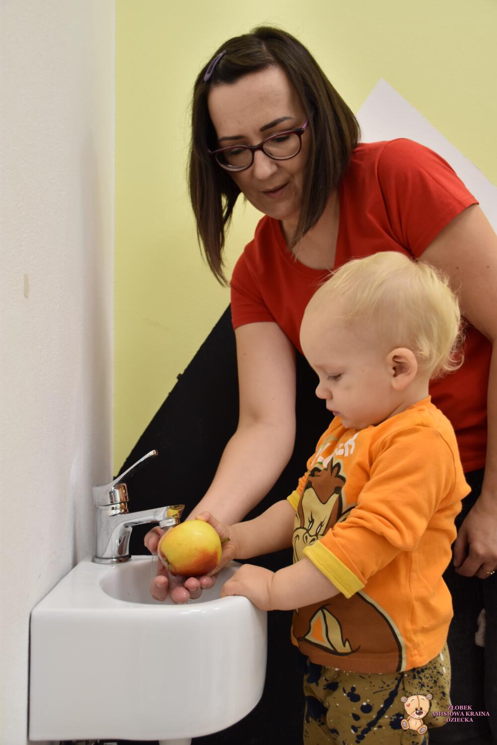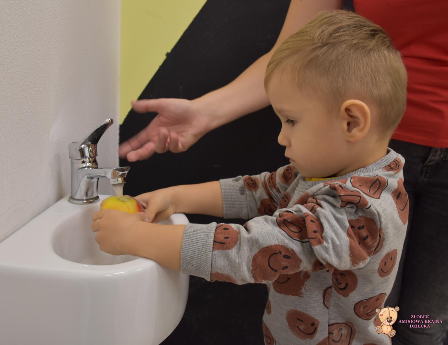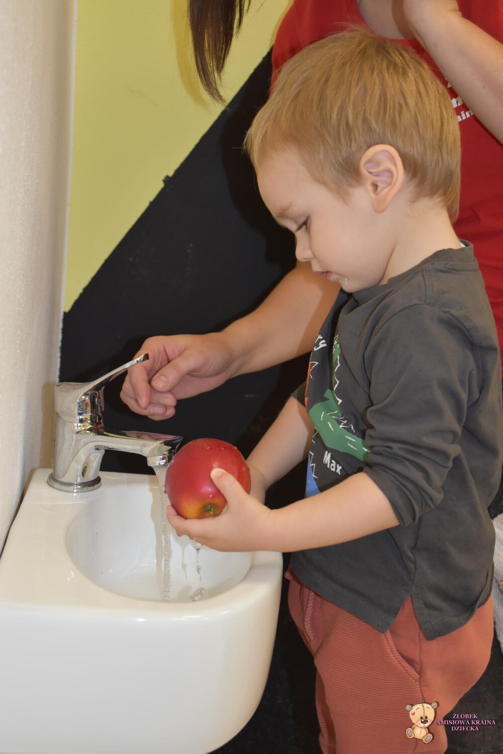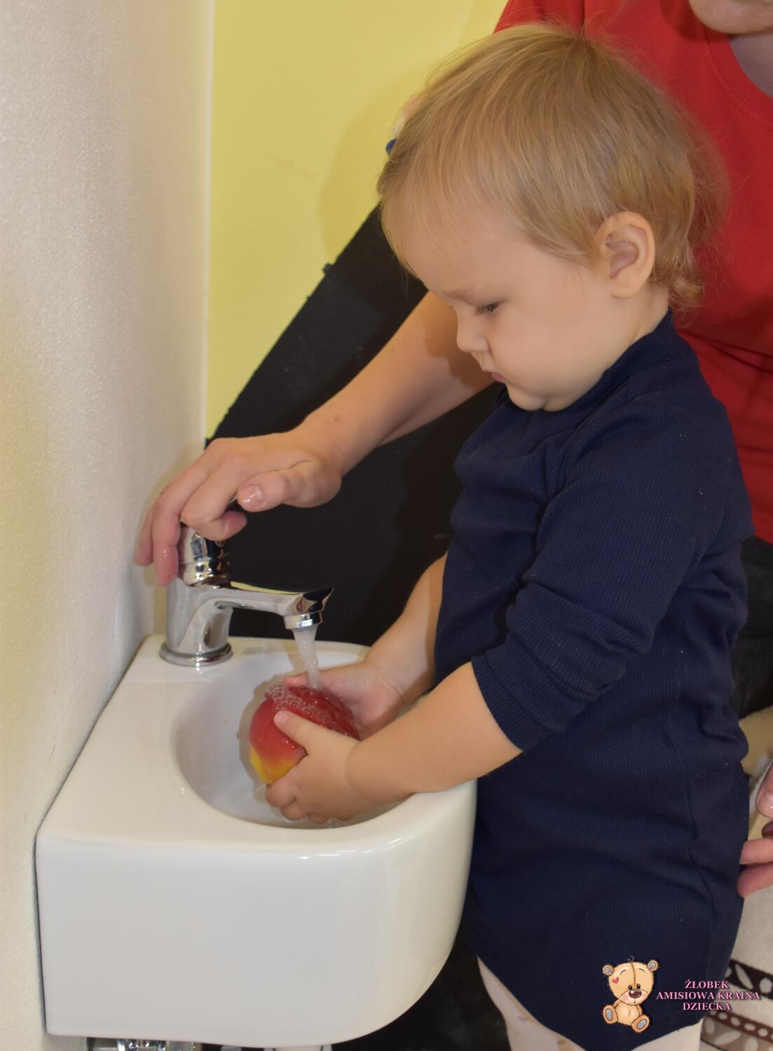 Jest to świetne ćwiczenie z koordynacji ręką – oko. Maluszki były skupione i uważne. Dodatkowo samodzielnie myły owoce ![]()