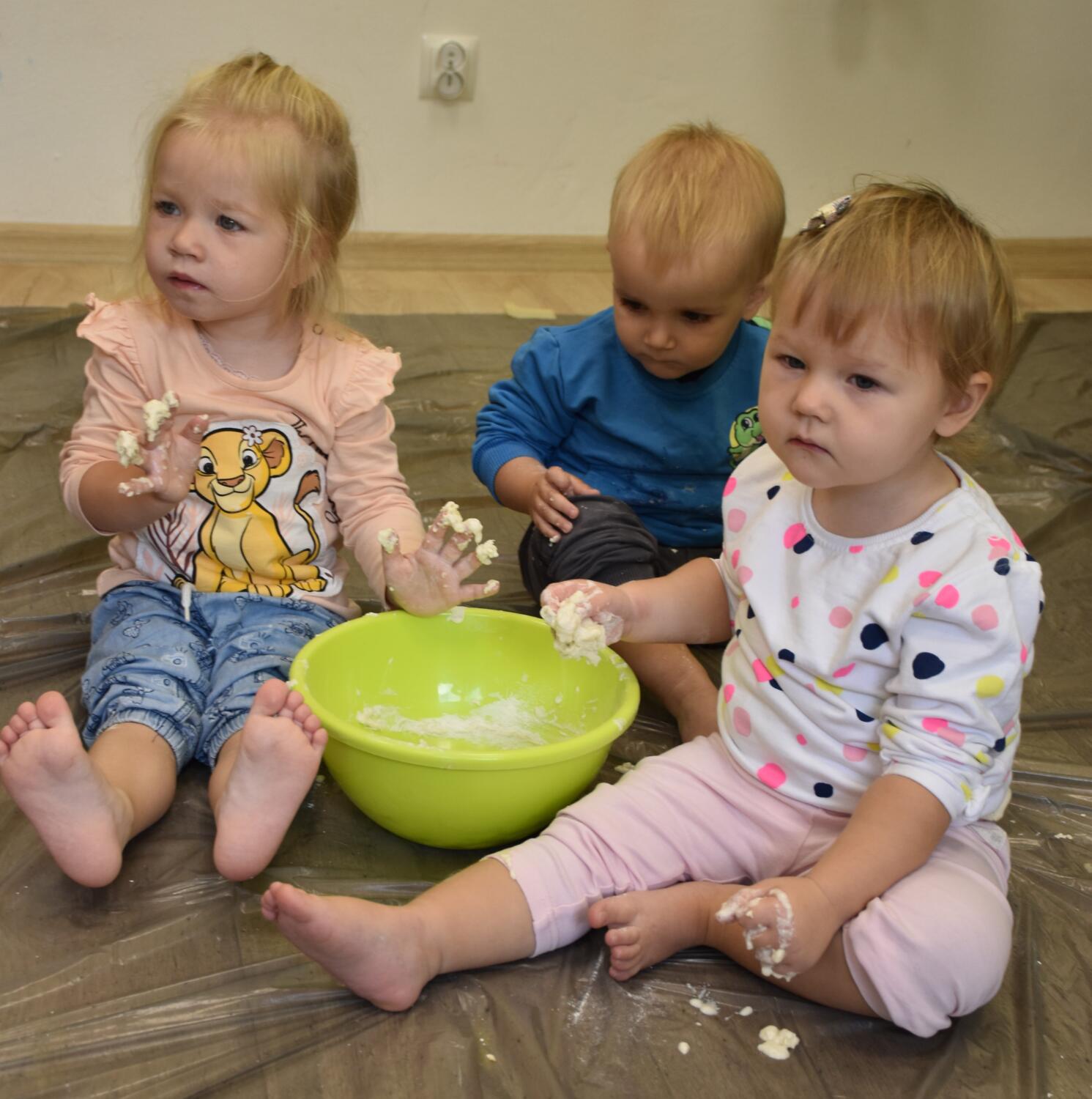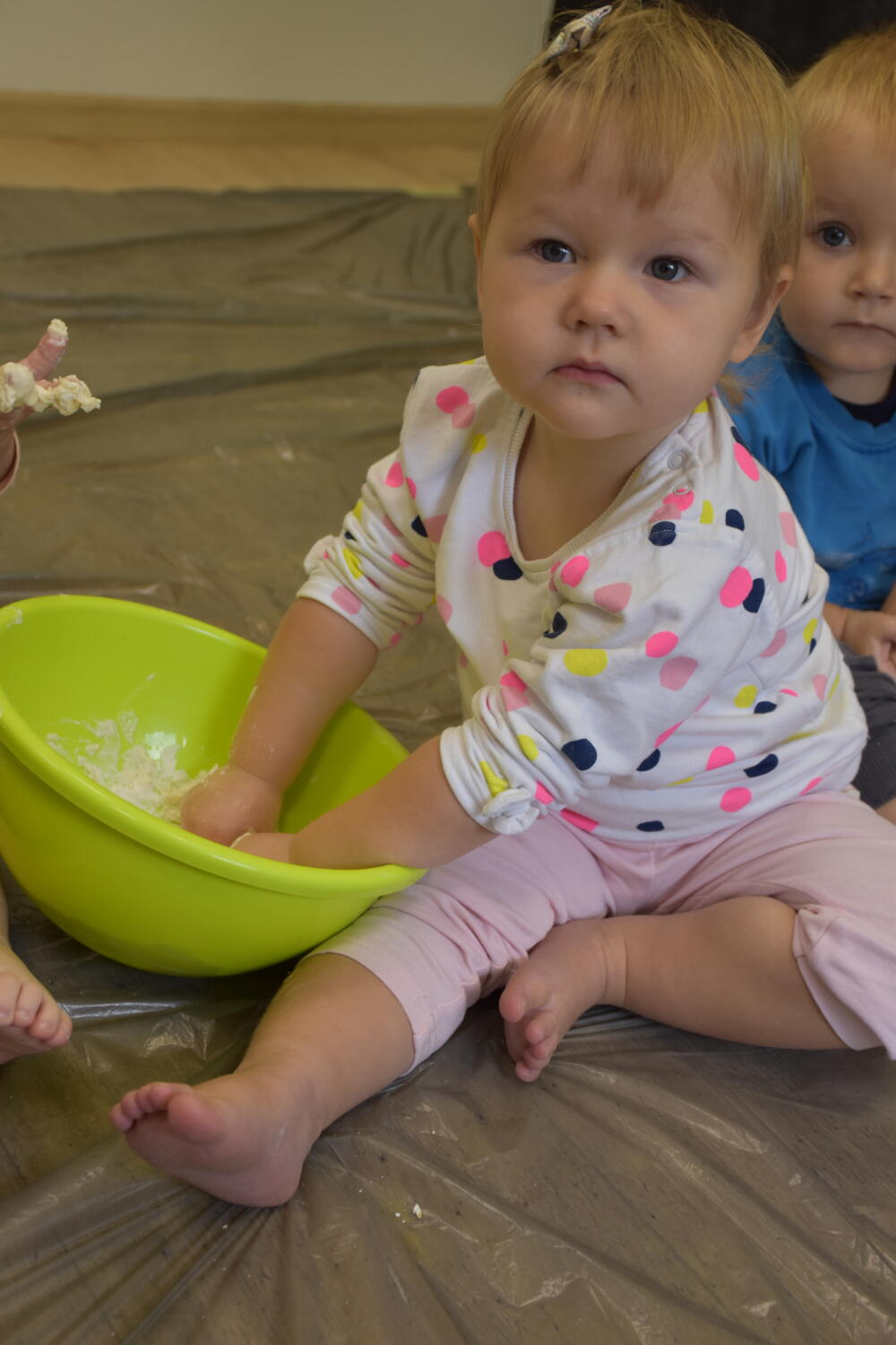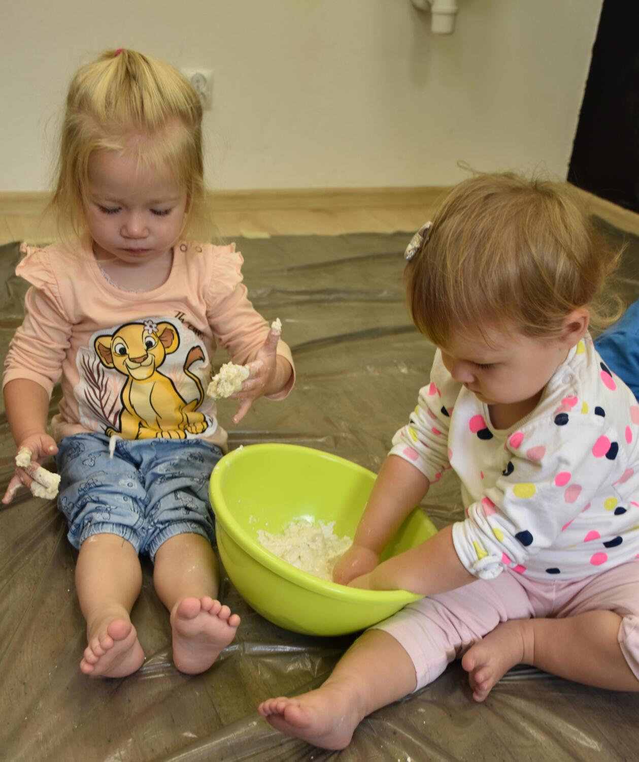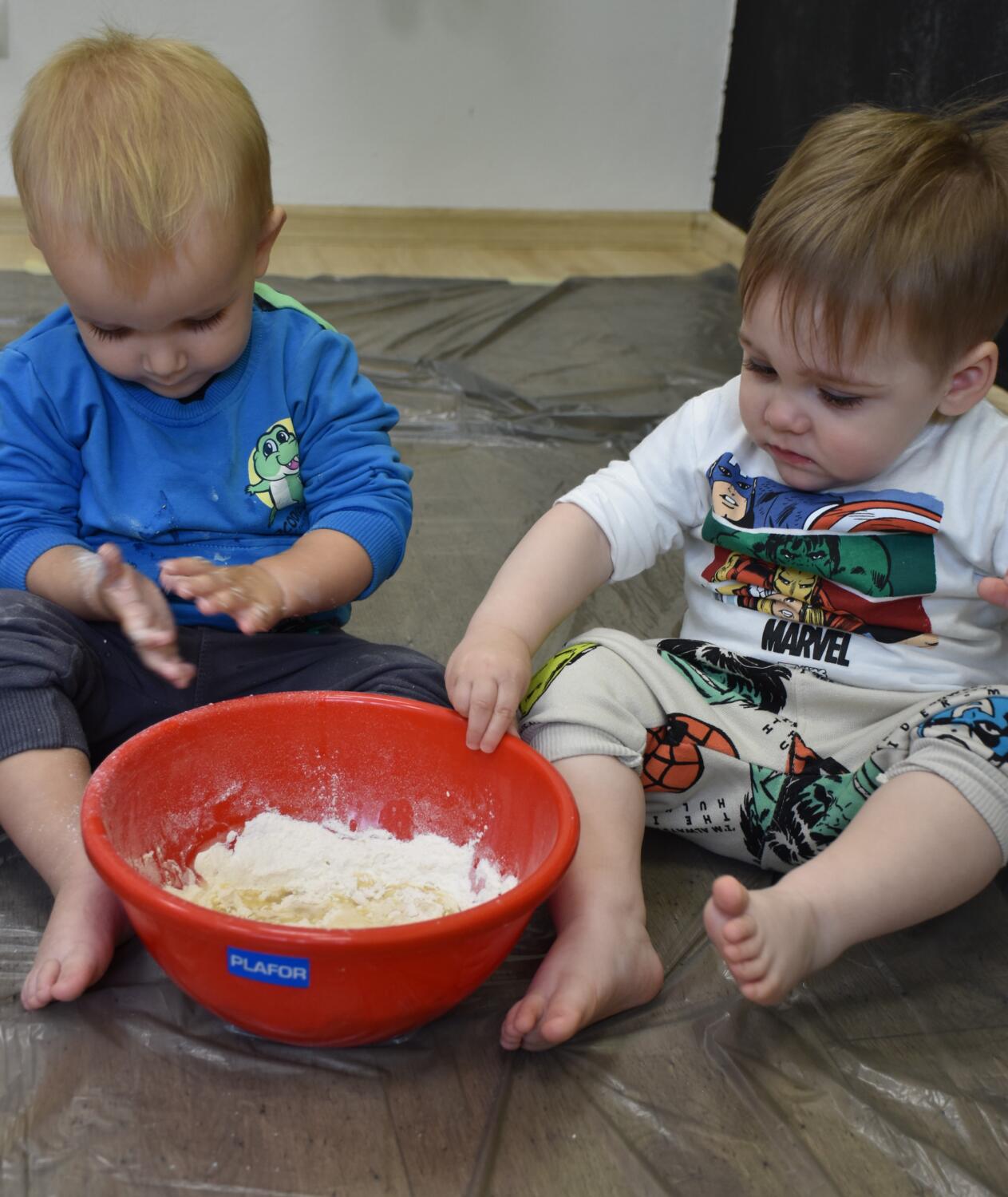 Dziś na zajęciach sensoplastyki z ciocią Klaudią maluchy wykonały masę krówkowa, dosypując do masy kajmakowej cukier puder. Średniaki i starszaki wykonały ciastolinę. W parach wsypywały do misek mąke, dolewały olej i dodawały wody. To była super zabawa.