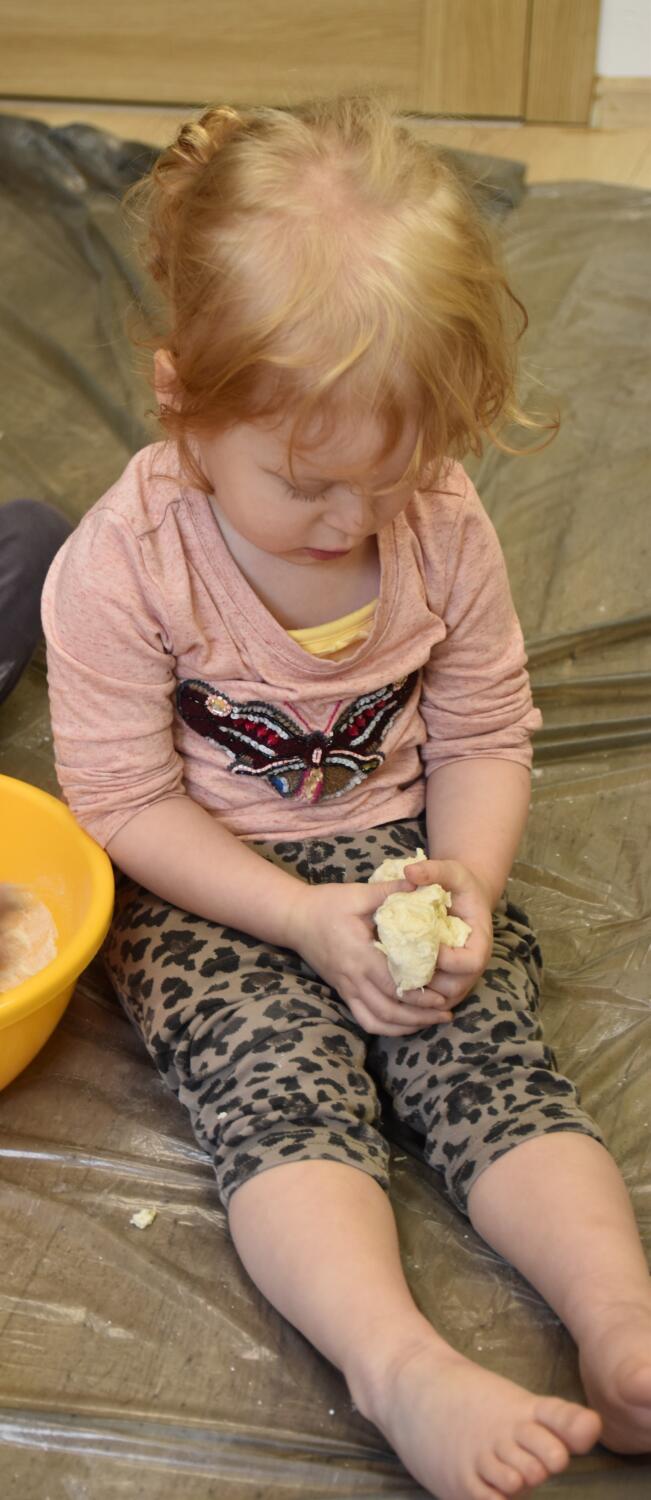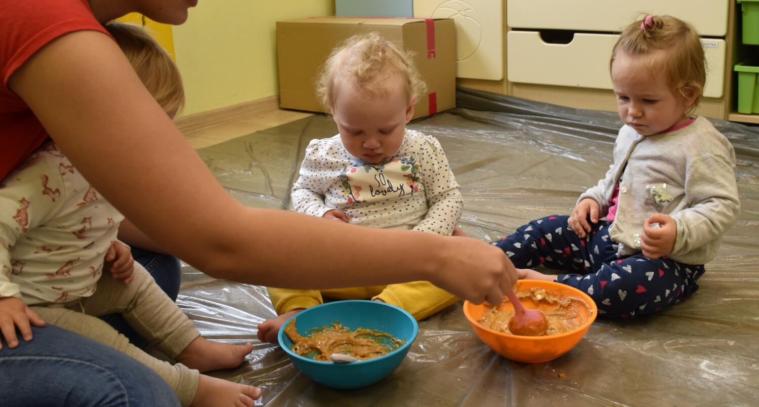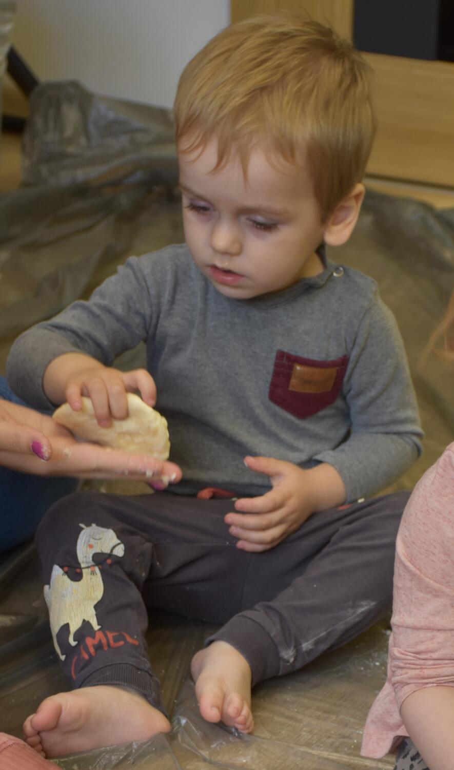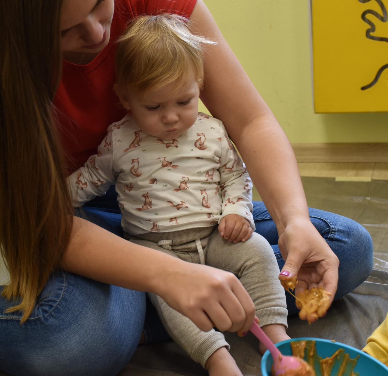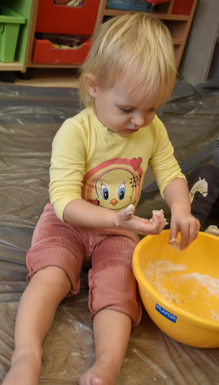 Dziś na zajęciach sensoplastyki z ciocią Klaudią maluchy wykonały masę krówkowa, dosypując do masy kajmakowej cukier puder. Średniaki i starszaki wykonały ciastolinę. W parach wsypywały do misek mąke, dolewały olej i dodawały wody. To była super zabawa.