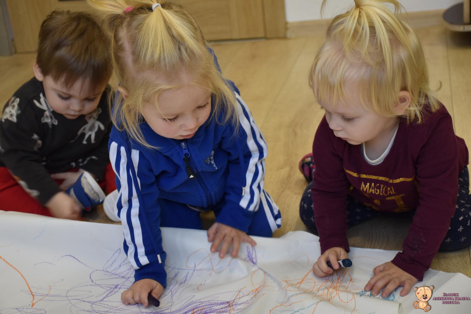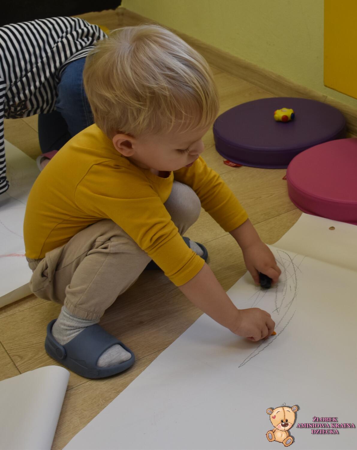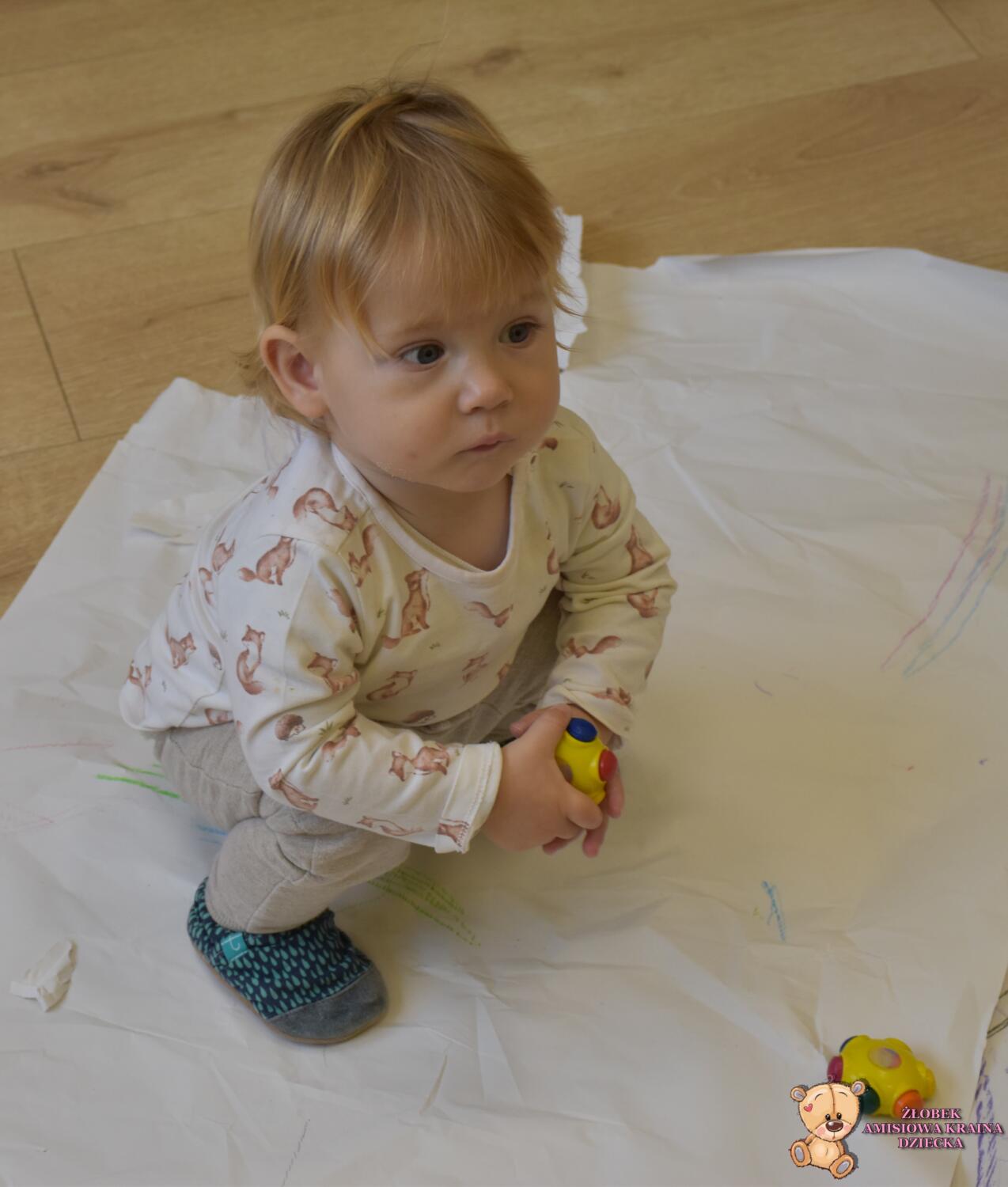 Dziś na zajęciach Montessori Amisie rysowały na dużym formacie. Ćwiczenie to usprawnia motorykę małą i grafomotorykę oraz koordynację ręką oko. Starszaczki próbowały rysować oburącz co jest nielada wyzwaniem ![]()