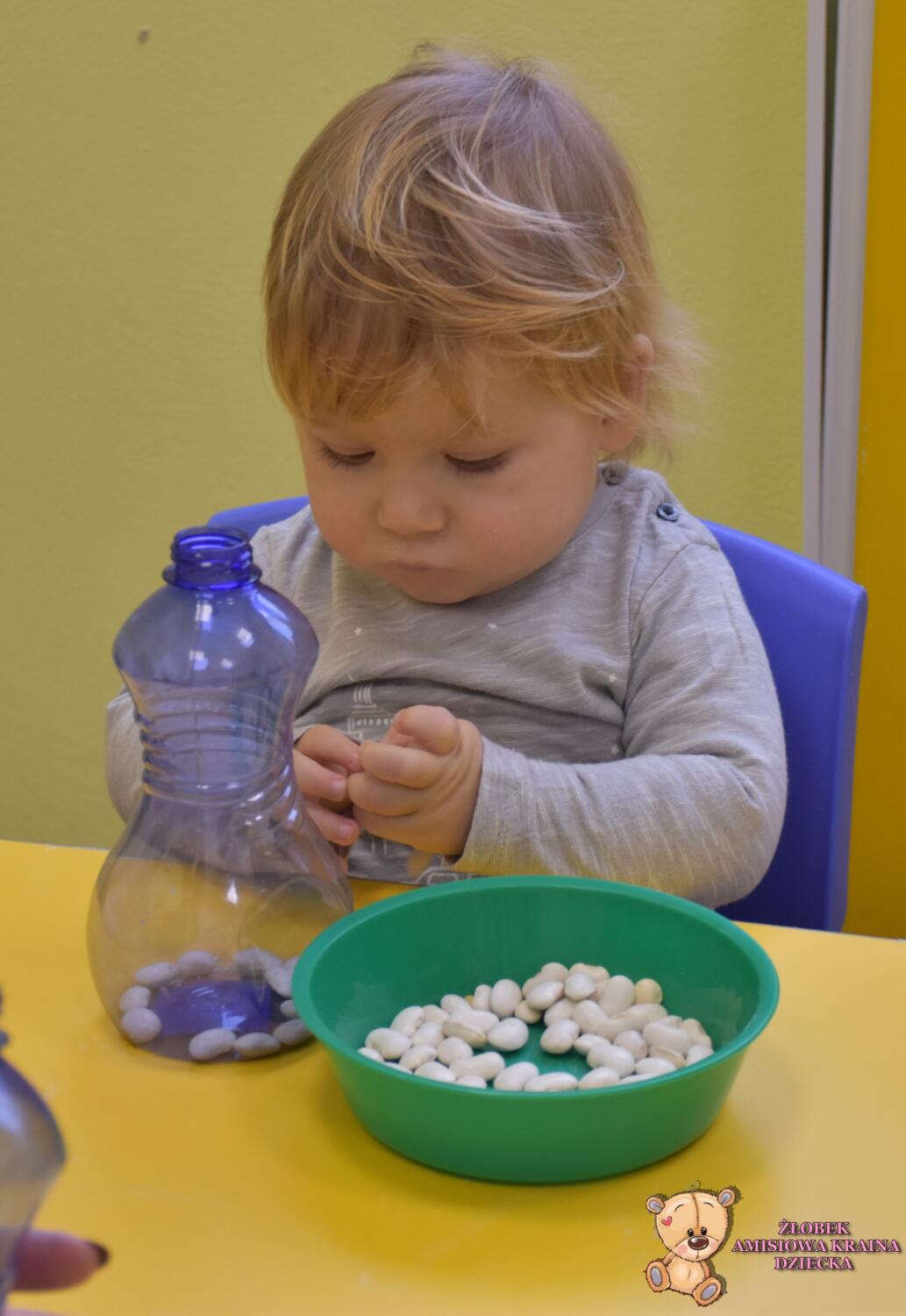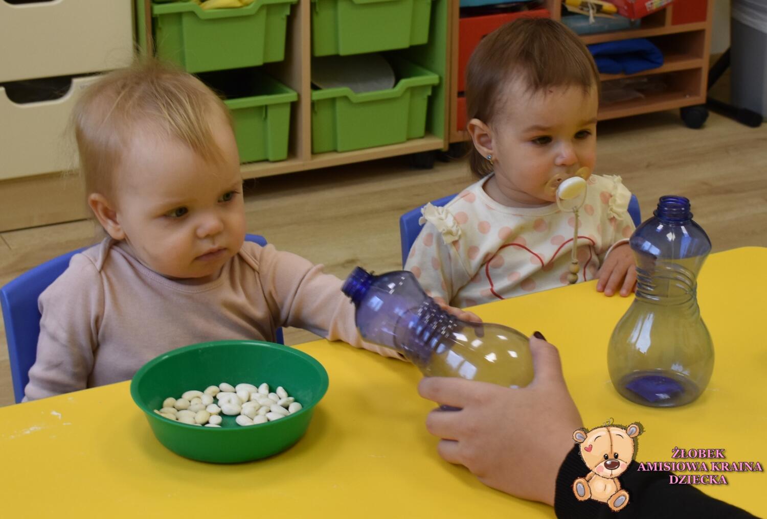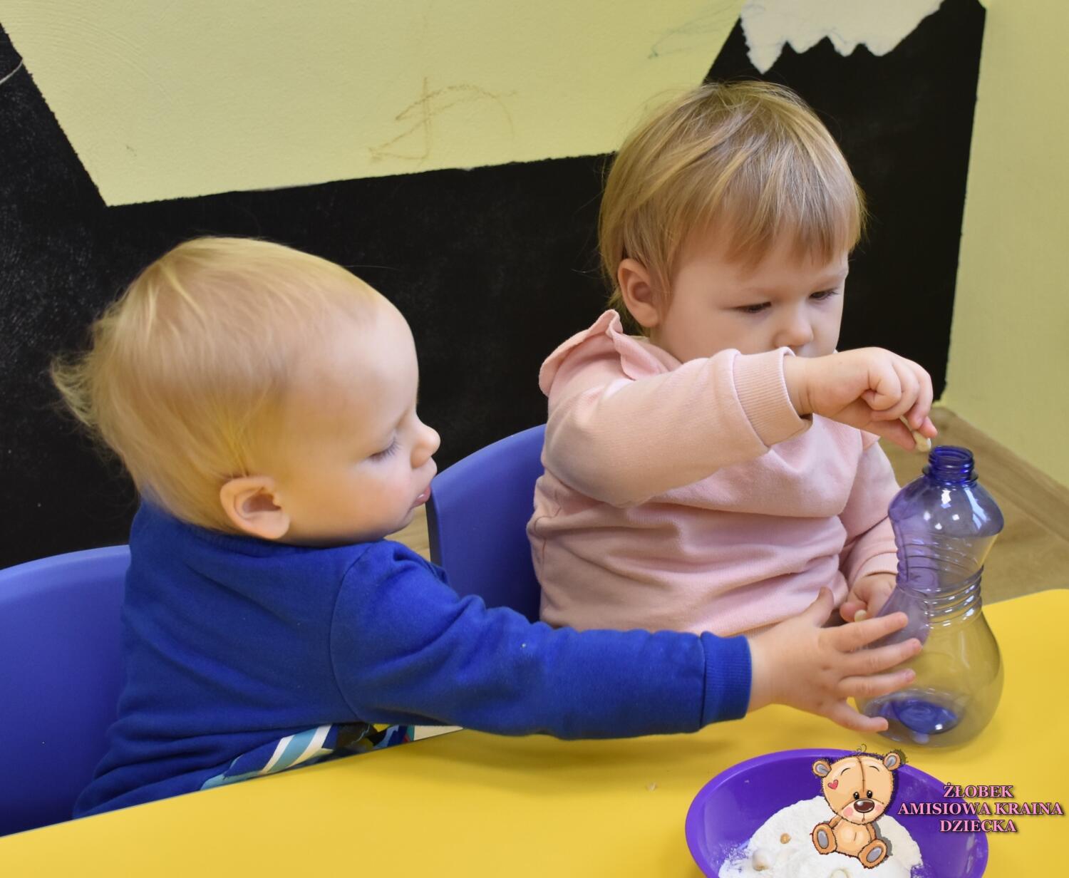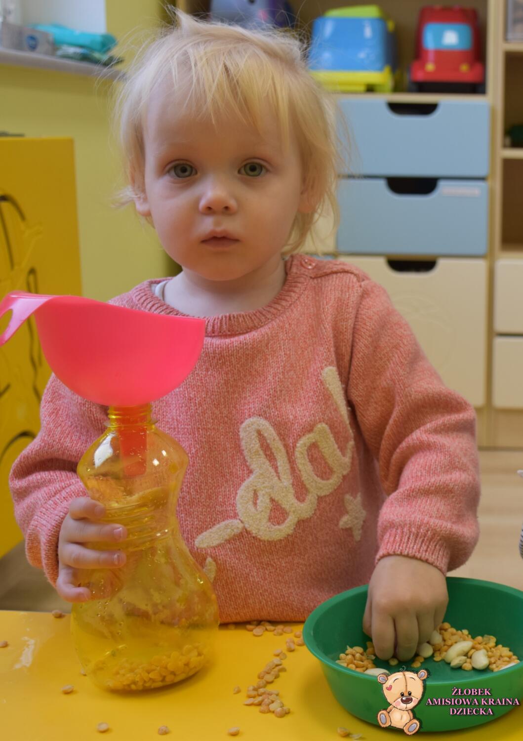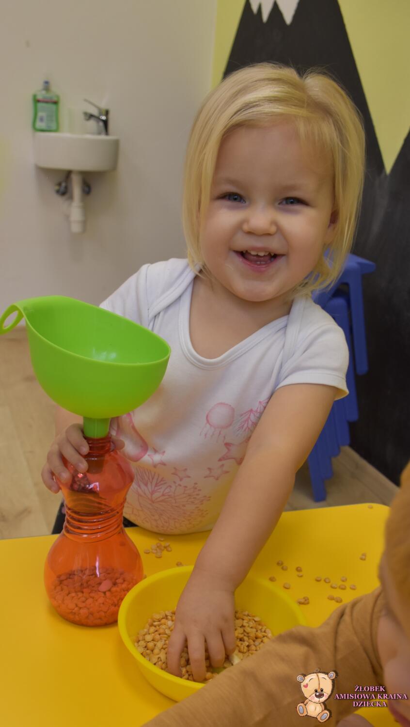 W ramach dzisiejszych zajęć z sensoplastyki dzieci miały okazję stworzyć własnoręcznie sensoryczne gniotki. Do przygotowanych kolorowych butelek, dzieci przesypywały suche produkty spożywcze: groch, fasolę i z pomocą cioci mąkę. Następnie na butelki nakładaliśmy nadmuchane z pomocą cioci balony, by przesypać do nich zawartość butelek. Tak wypełnione balony, po zawiązaniu, zamieniły się w kolorowe gniotki. Dzieci podczas zajęć ćwiczyły motorykę małą, pobudzały swoją wyobraźnię i relaksowały się gniotąc w rączkach samodzielnie stworzone zabawki. 🙂