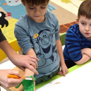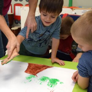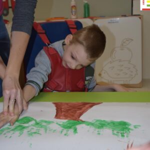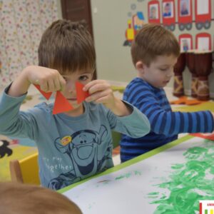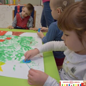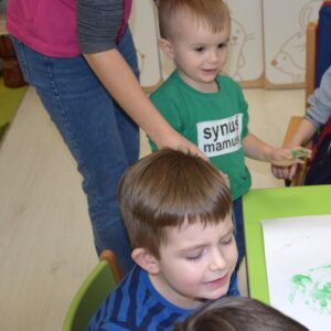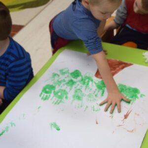 Coraz bliżej święta, coraz bliżej święta, dlatego nasze przedszkolaki chcąc stworzyć świąteczną atmosferę wykonywały dziś „choinkę”. Używały do tego własnych dłoni, pomalowanych farbką. Następnie ozdabiały drzewko, utrwalając sobie nazwy prostych figur geometrycznych.