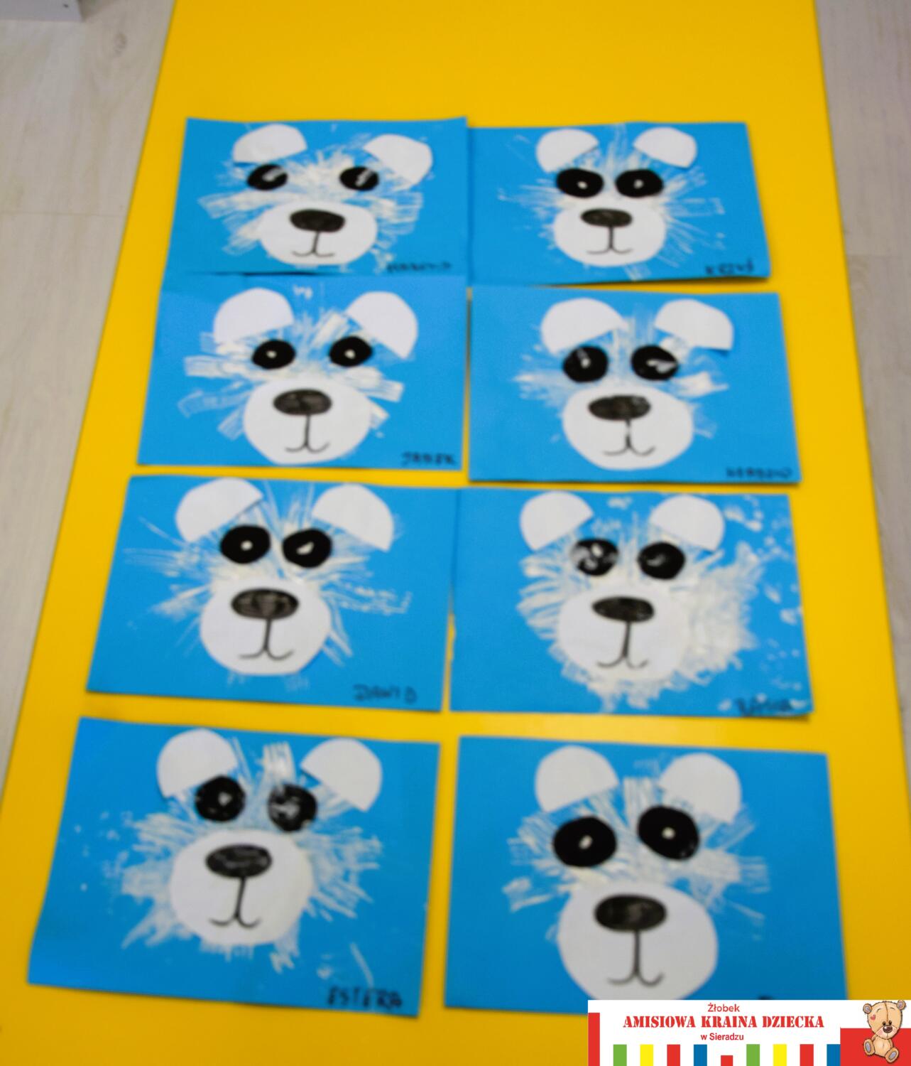 Dziś grupa zajączków wykonała Misie Polarne. Dzieciaczki miały bardzo dużo zabawy, ponieważ praca była wykonana za pomocą białej farby i plastikowego widelca.