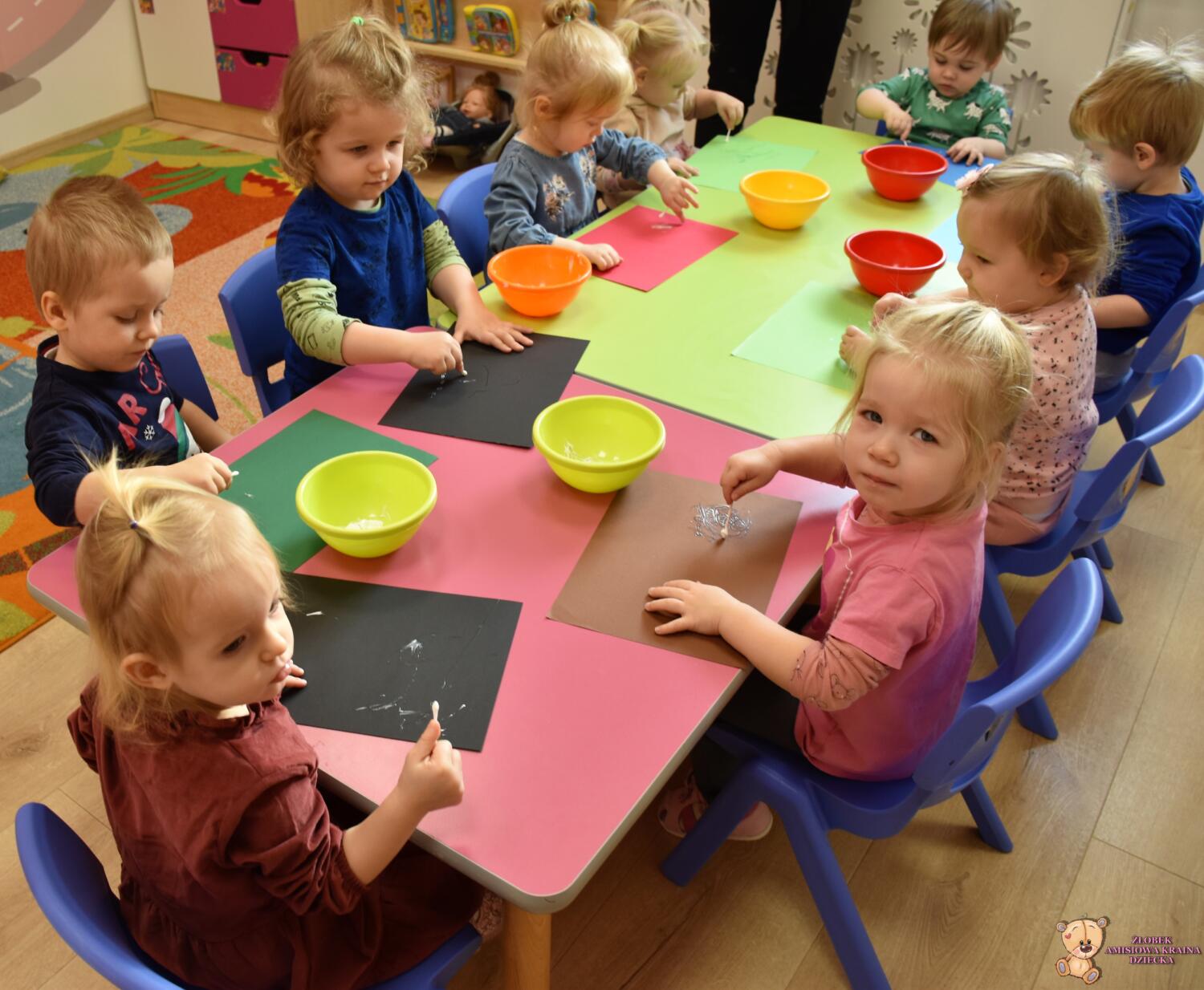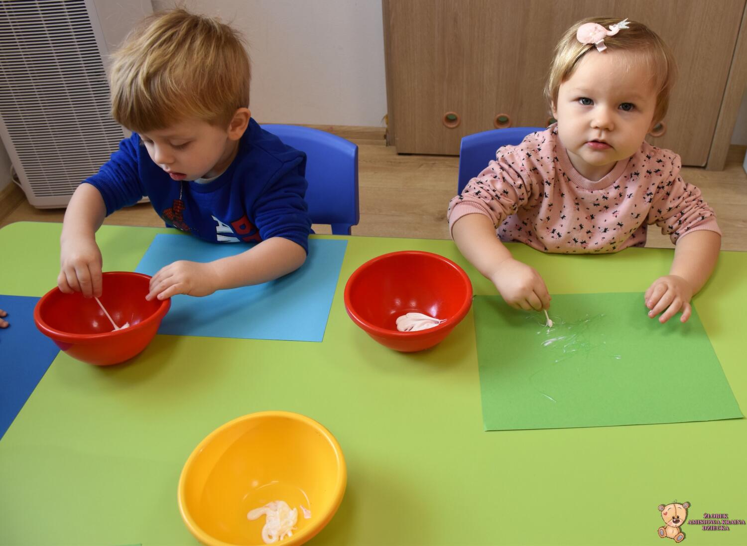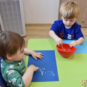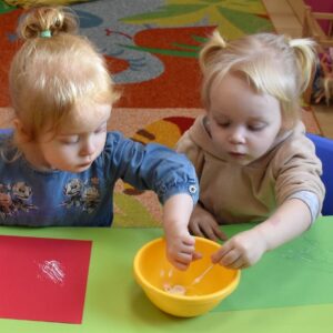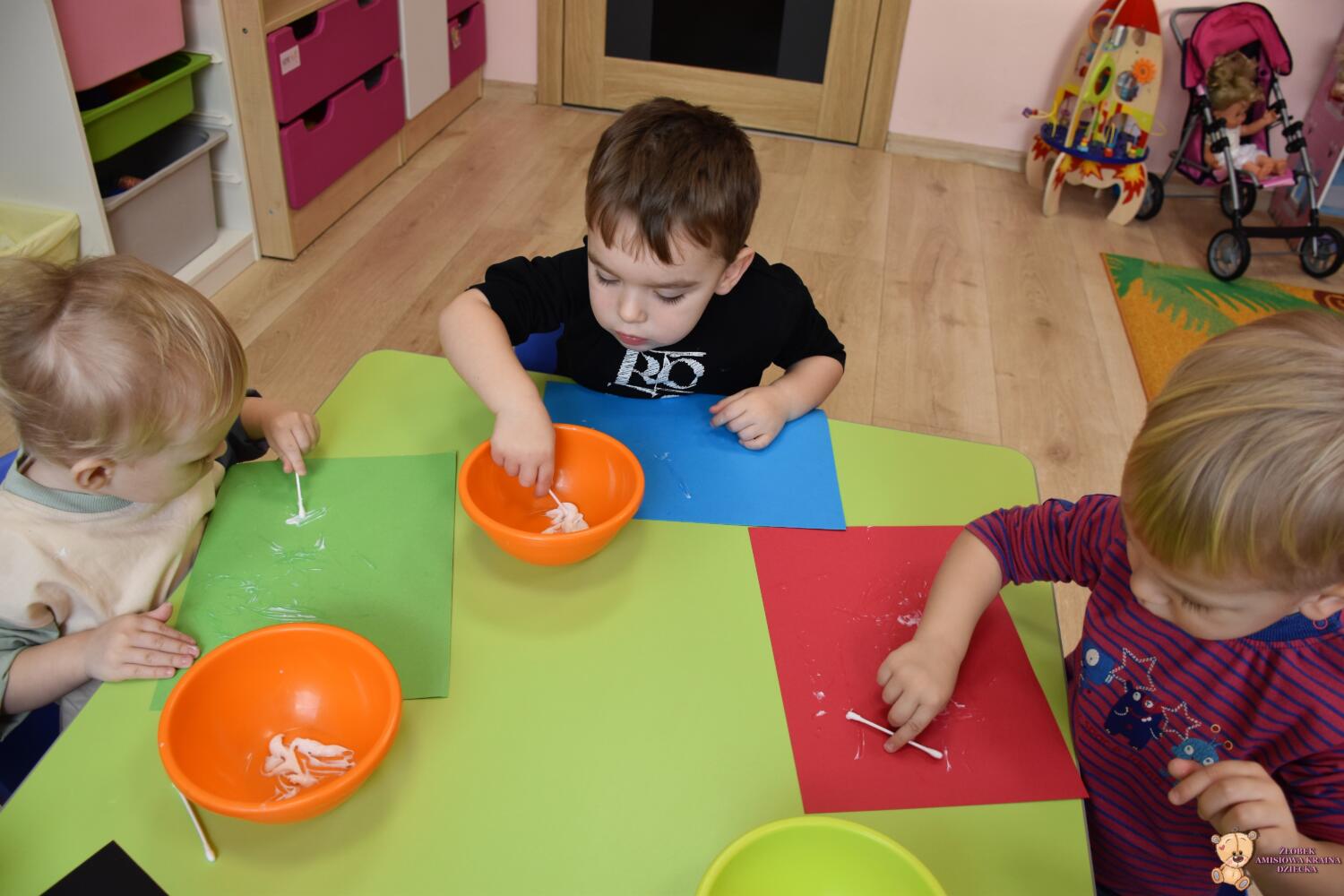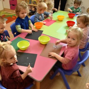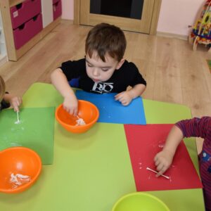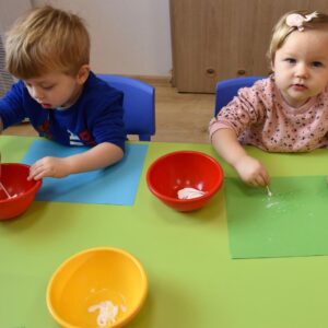 Dziś na zajęciach Montessori Amisie tworzyły prace plastyczne z użyciem pasty do zębów 🙂 Przy okazji utrwaliły naukę koloru białego. Nasze kochane Maluszki tworzyły swoje dzieła słuchając Wolfganga Amadeusa Mozarta. Dzisiejsze zajęcia przebiegły w ciszy a Maluszki stworzyły piękne prace 🙂