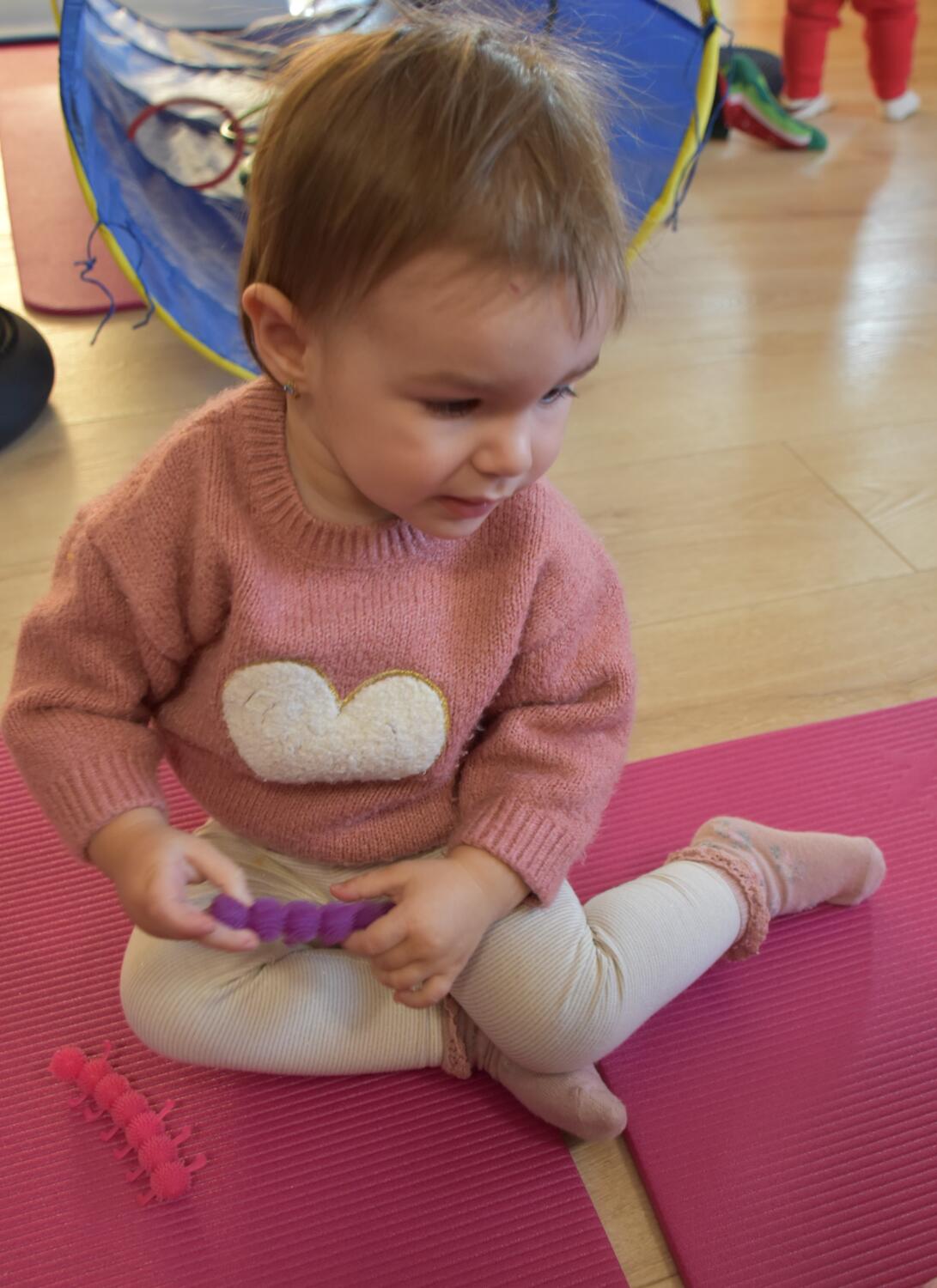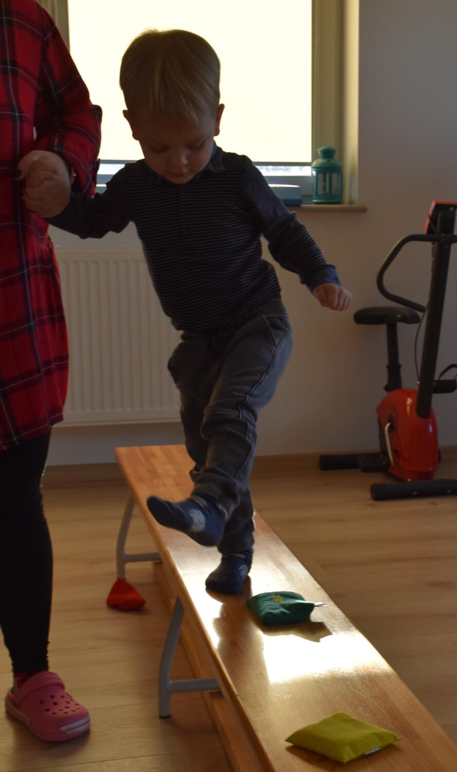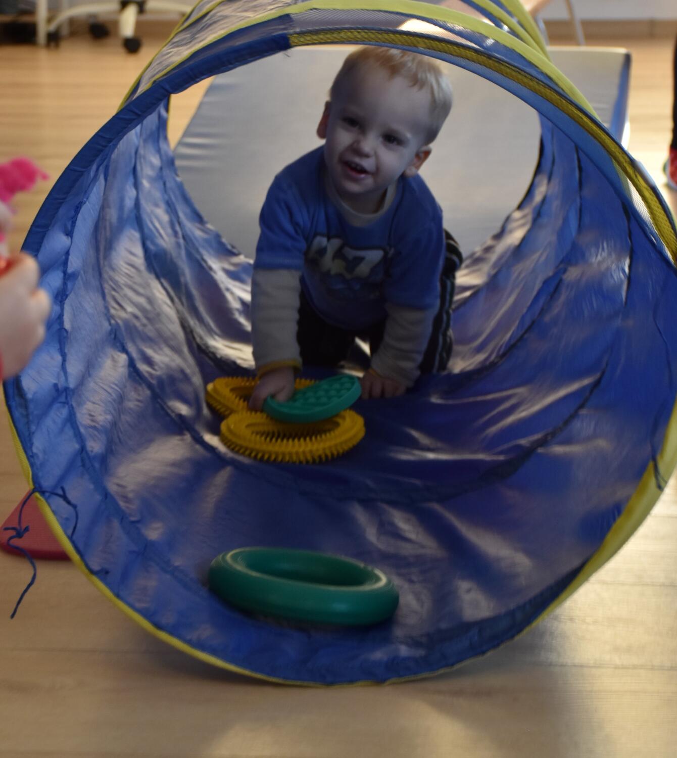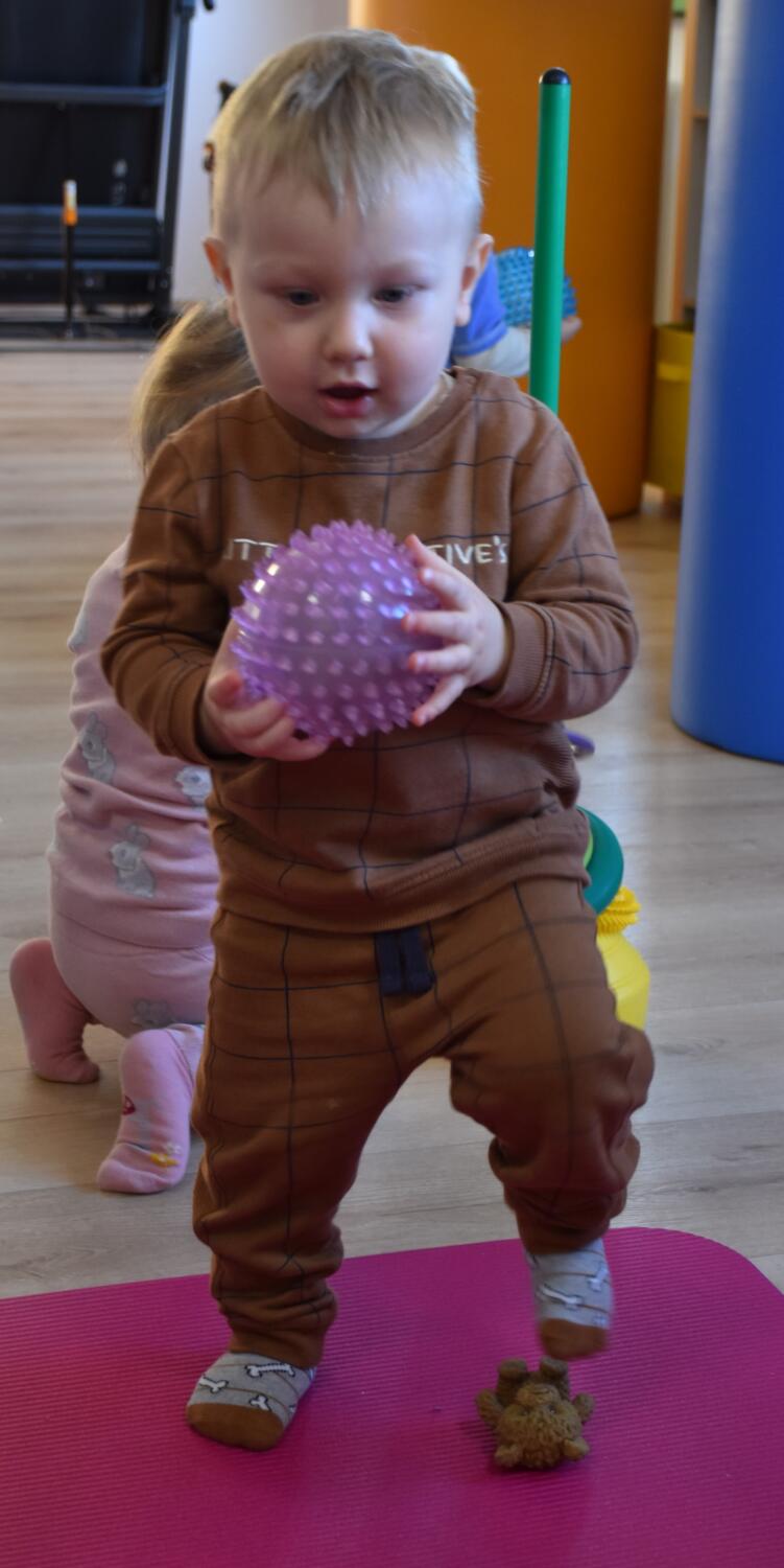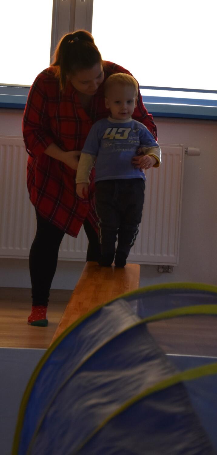 Podczas dzisiejszych zajęć SI duuużo się działo. Amisiaki chodziły po ławeczce i zrzucały stopą woreczki. To było trudne zadanie, było wysoko, musieliśmy utrzymać równowagę. Następnie zejście w dół po miękkim podłożu i przejście przez tunel pełen różnych obręczy. Amisiaki nakładały je na pachołki. Ciocia naszykowała również hamak i kołyskę oraz klamerki. Mogliśmy się huśtać, bujać i ćwiczyć rączki. Amisiaki rosną, rozwijają się, widać postępy. Brawo!