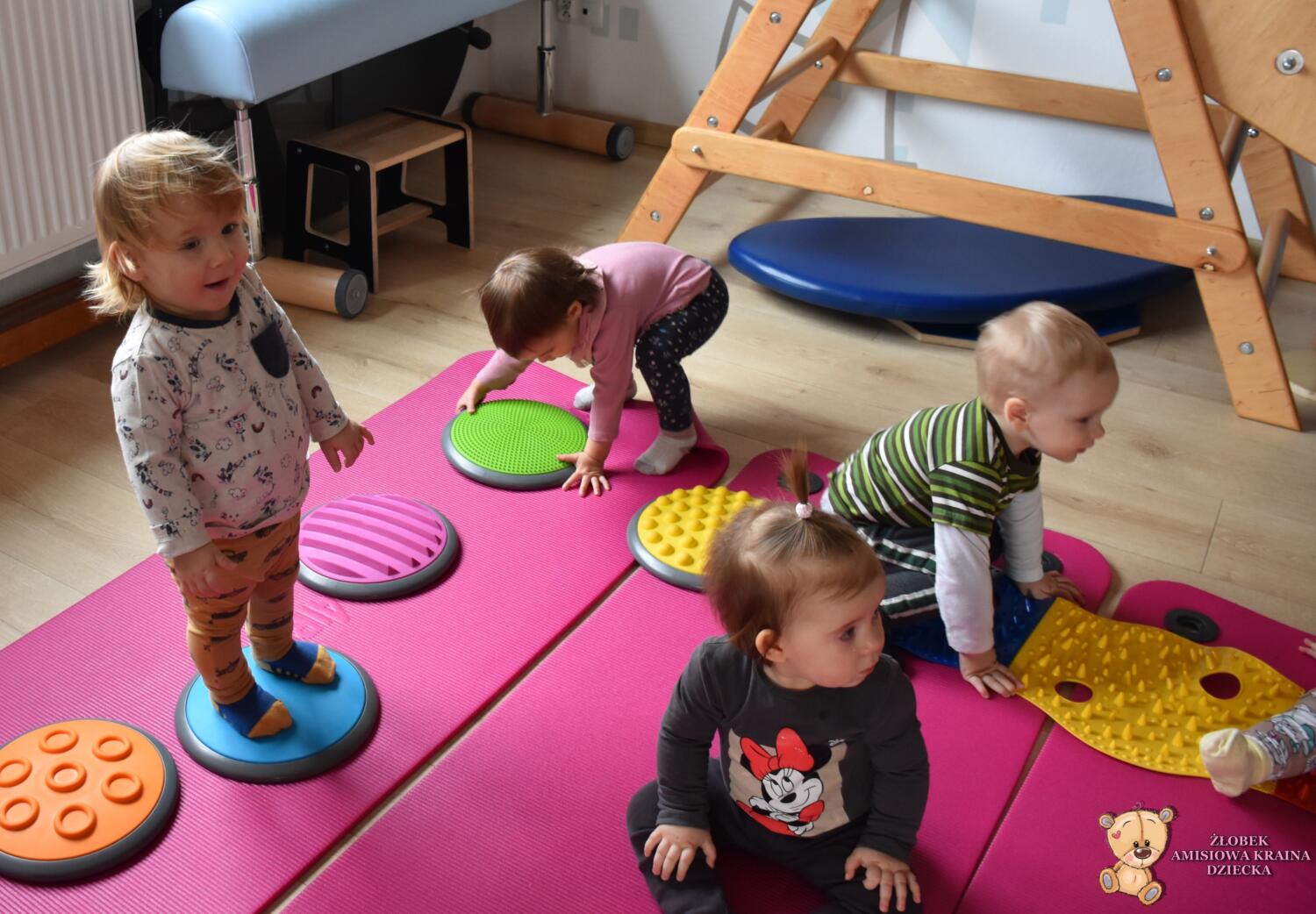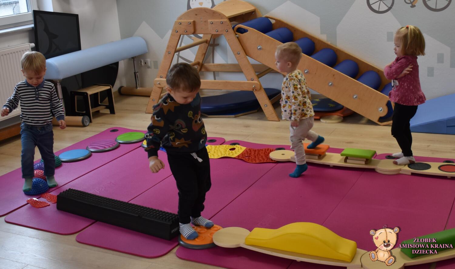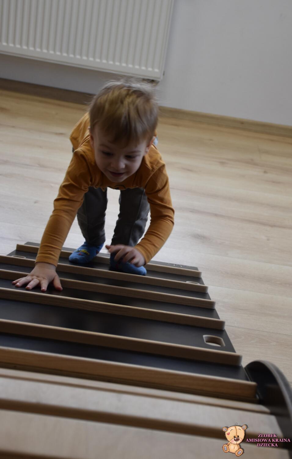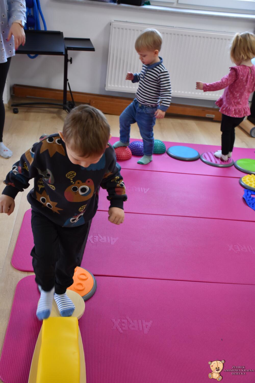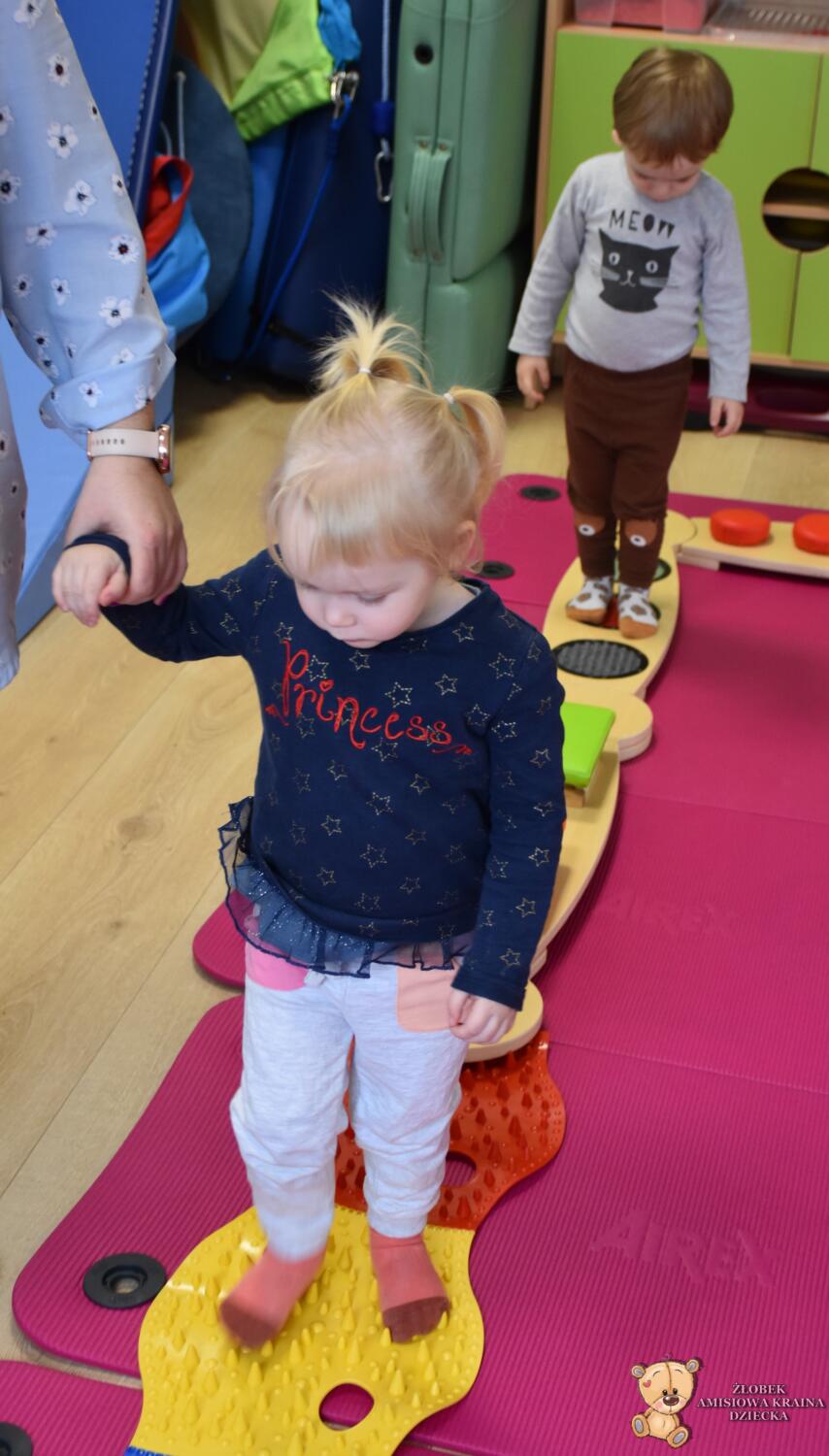 Na zajęciach Integracji Sensorycznej Amisiaki ćwiczyły równowagę, stymulowały dotyk, czucie powierzchniowe i głębokie oraz pobudzały układ przedsionkowy. Na rozgrzewkę była ścieżka sensoryczna. Można było dotykać rączkami jej różnorodne struktury a także chodzić po niej. Amisiaki starały się utrzymać równowagę, chodziły nóżka za nóżką. Zauważyć można było zaangażowanie i skupienie. Ten kto przeszedł przez ścieżkę sensoryczną wspinał się na szczyt zjeżdżalni i zjeżdżał w dół na brzuchu, w siadzie, na plecach. Amisiaki świetnie ćwiczyły, Ciocia jest z Was dumna.Brawo!