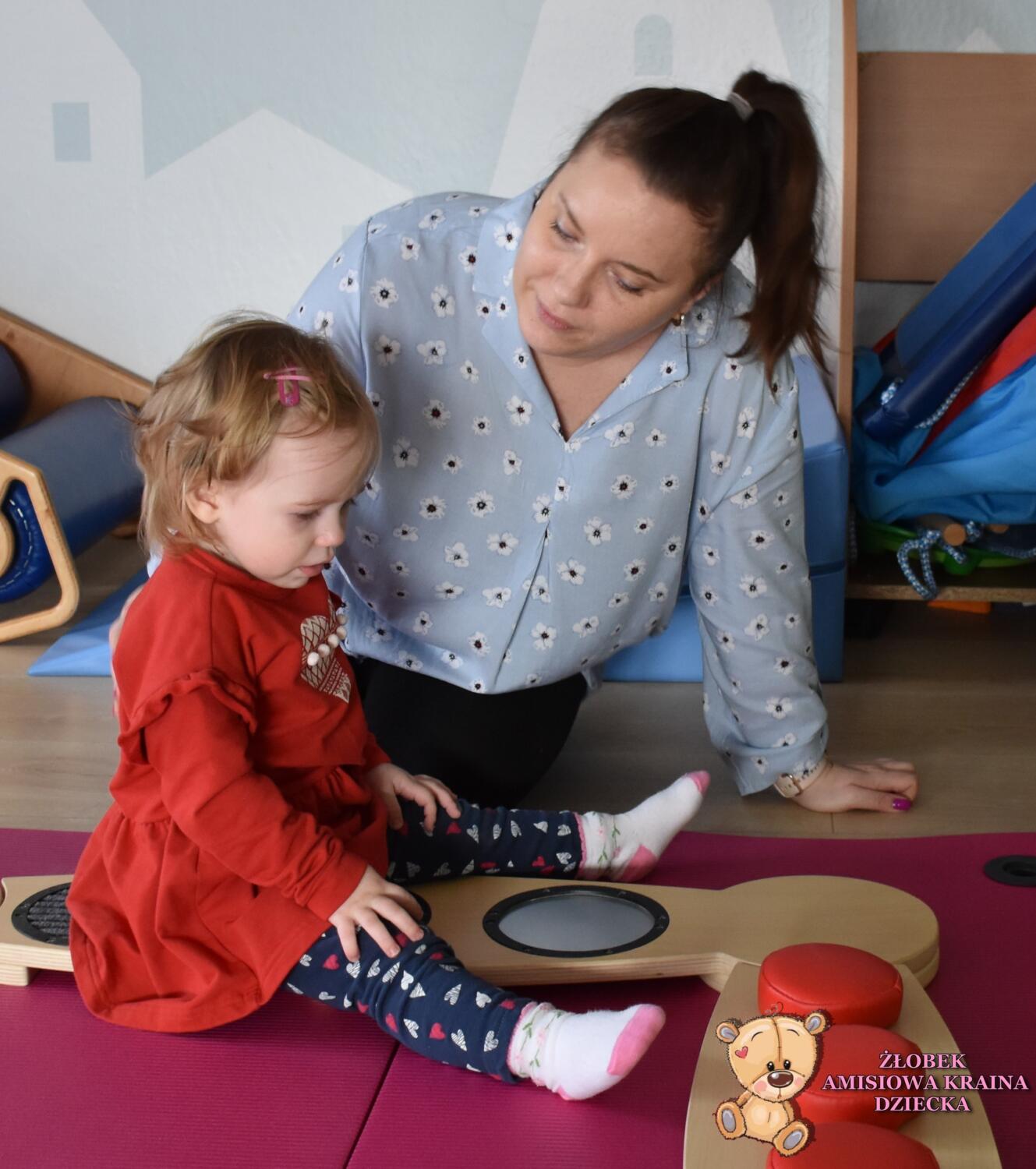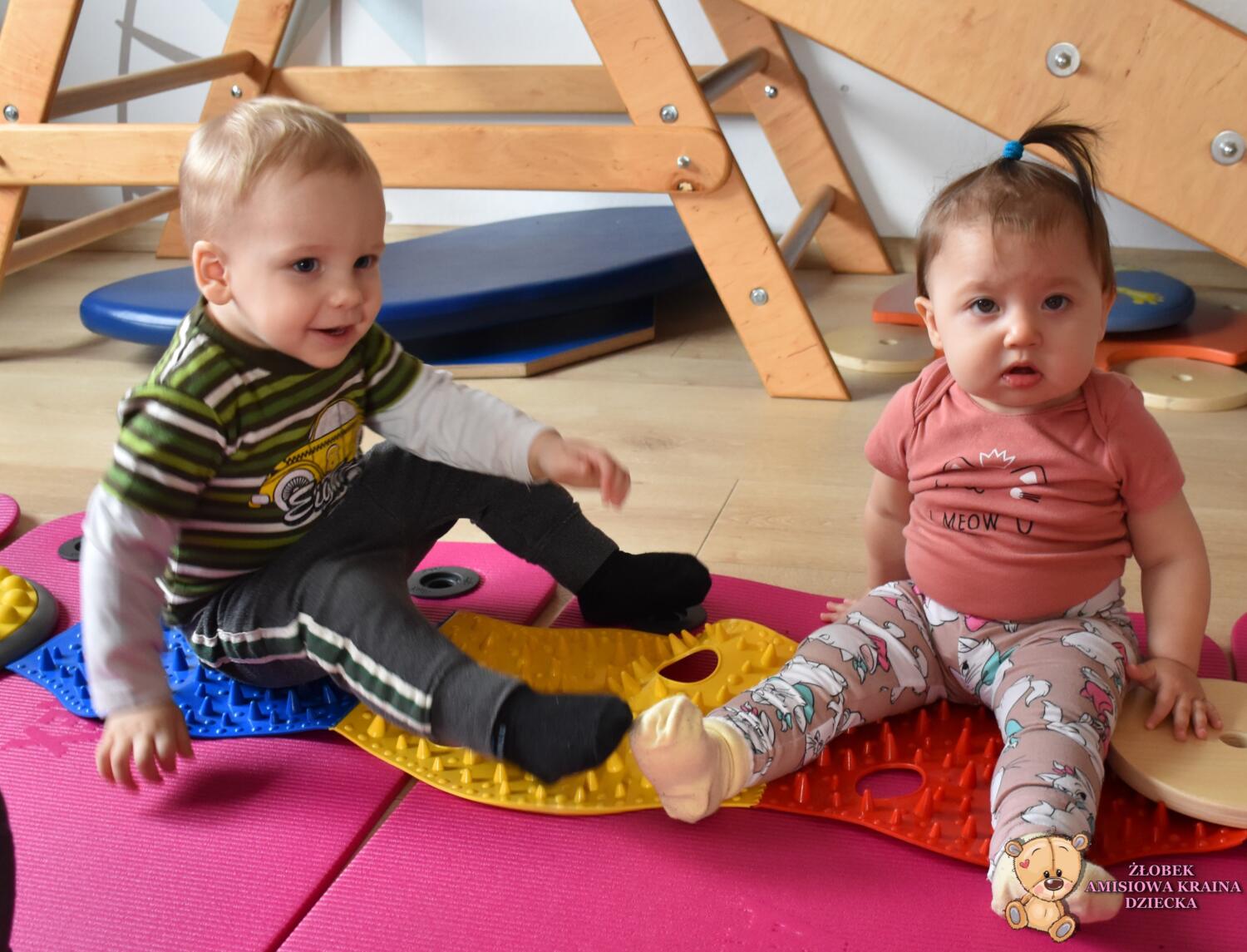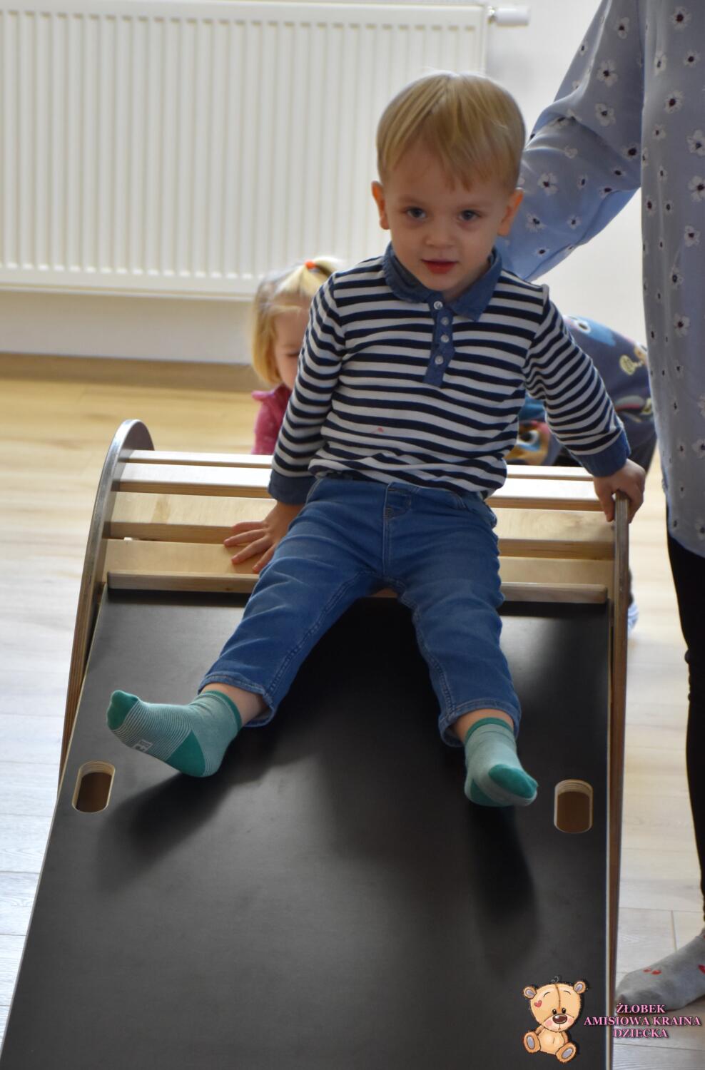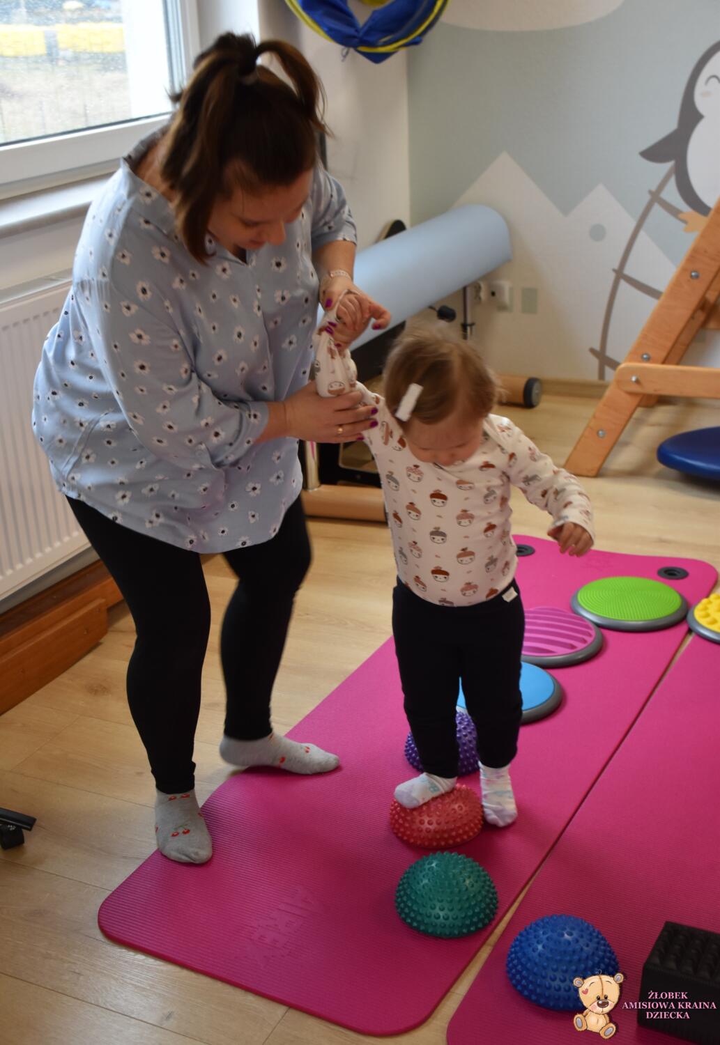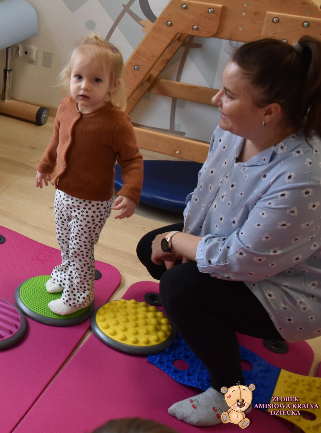 Na zajęciach Integracji Sensorycznej Amisiaki ćwiczyły równowagę, stymulowały dotyk, czucie powierzchniowe i głębokie oraz pobudzały układ przedsionkowy. Na rozgrzewkę była ścieżka sensoryczna. Można było dotykać rączkami jej różnorodne struktury a także chodzić po niej. Amisiaki starały się utrzymać równowagę, chodziły nóżka za nóżką. Zauważyć można było zaangażowanie i skupienie. Ten kto przeszedł przez ścieżkę sensoryczną wspinał się na szczyt zjeżdżalni i zjeżdżał w dół na brzuchu, w siadzie, na plecach. Amisiaki świetnie ćwiczyły, Ciocia jest z Was dumna.Brawo!