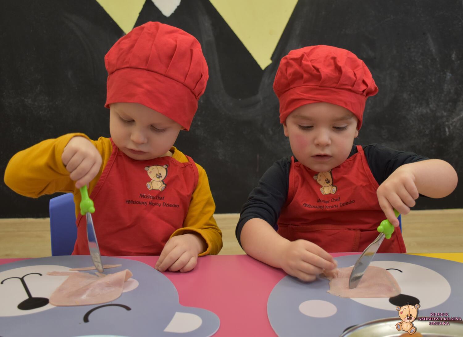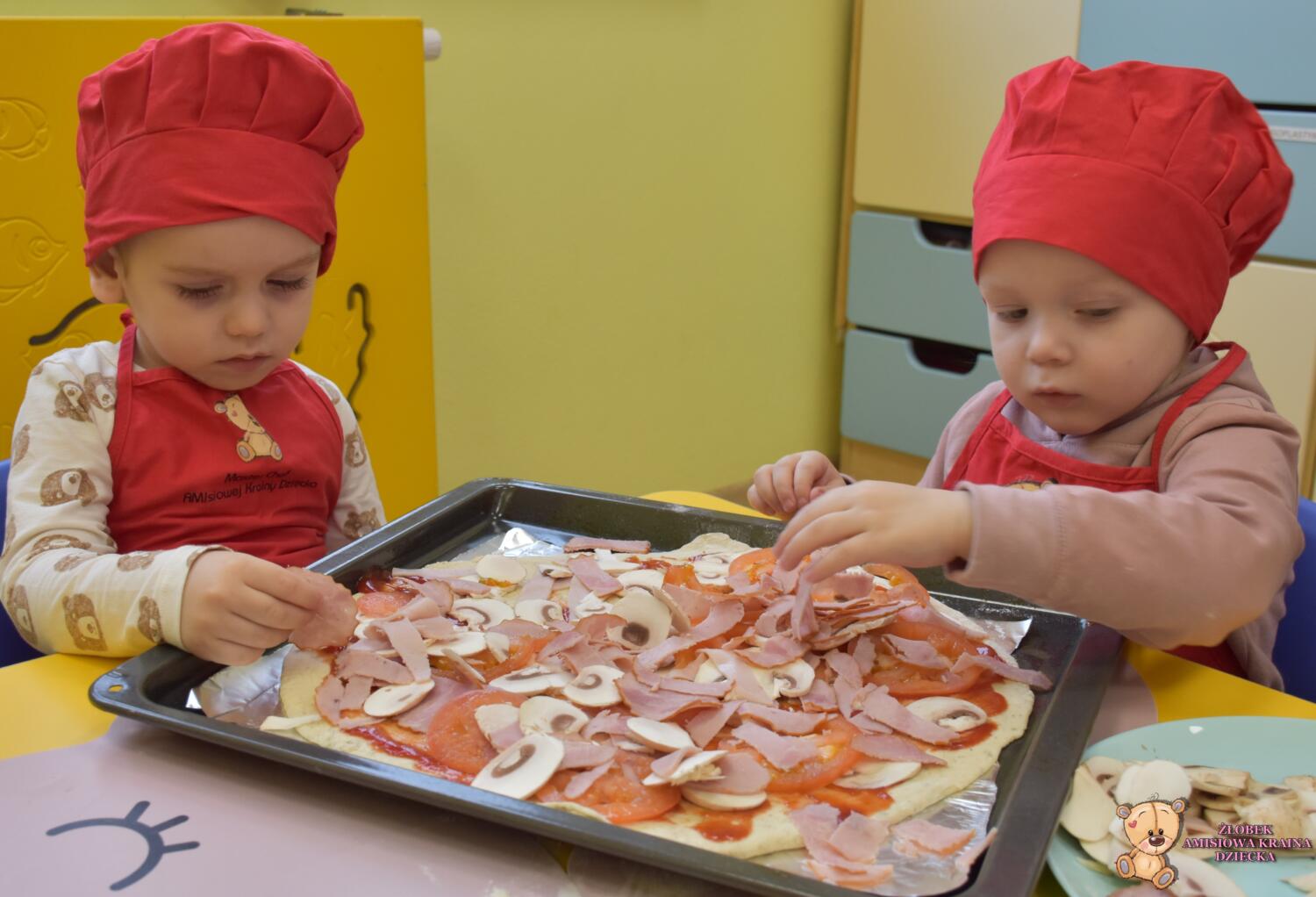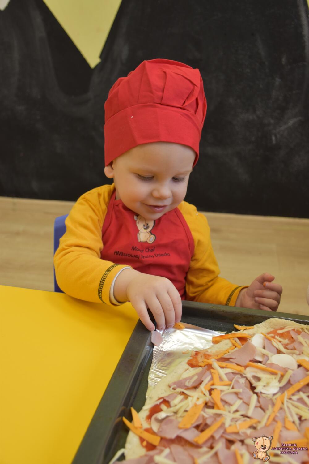Dzieci zagniatały ciasto, wałkowały je, następnie smarowały sosem, układały pyszne składniki i posypywały pizze serem.![]()