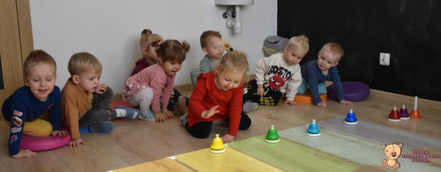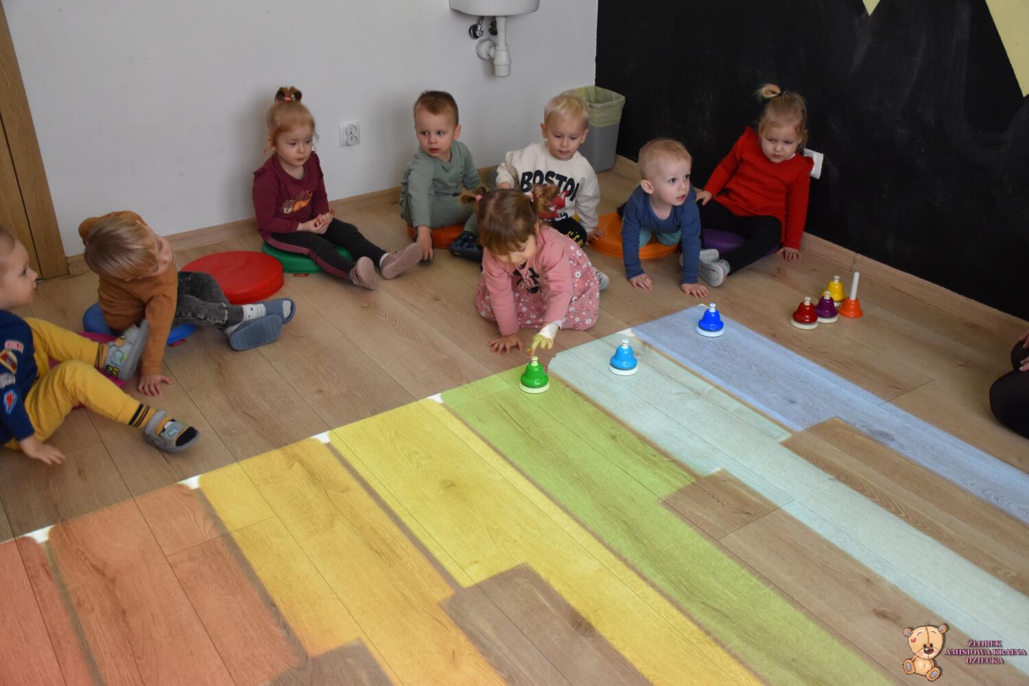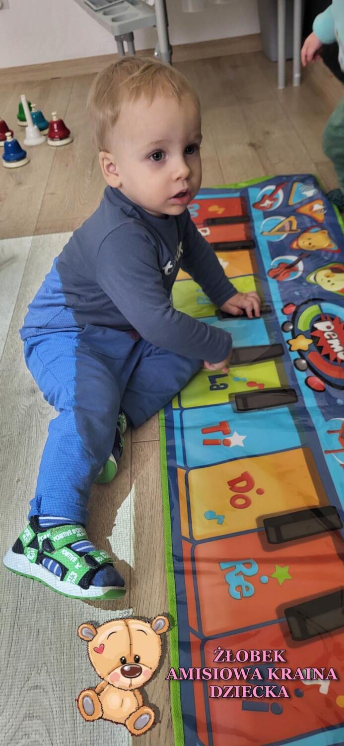 Na zajęciach rytmiki było kolorowo. Poznaliśmy dźwięki pianina, a może fortepianu…. A jaka jest różnica? Otóż na pianinie się ćwiczy, a na fortepianie występuje. Mają też inną budowę- trochę skomplikowaną. Ćwiczyliśmy naciskanie dźwięków na macie, oraz na dzwonkach, które są łatwiejsze dla naszych rączek. Ciocia opowiedziała nam ,że nie musimy znać nutek by grać, wystarczy znajomość kolorów, które utrwalaliśmy. Na koniec biegaliśmy w rytm dźwięków magicznego dywanu.