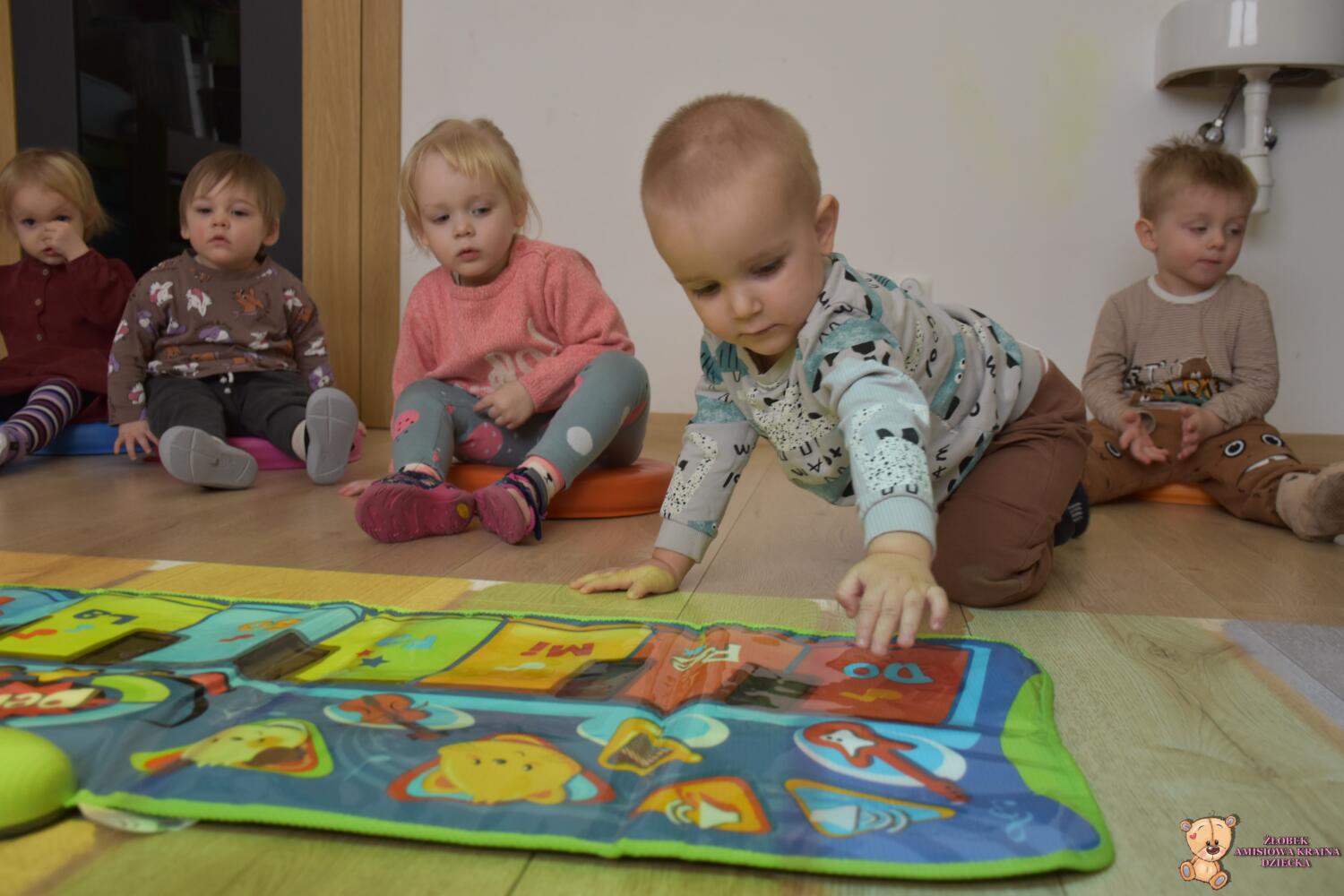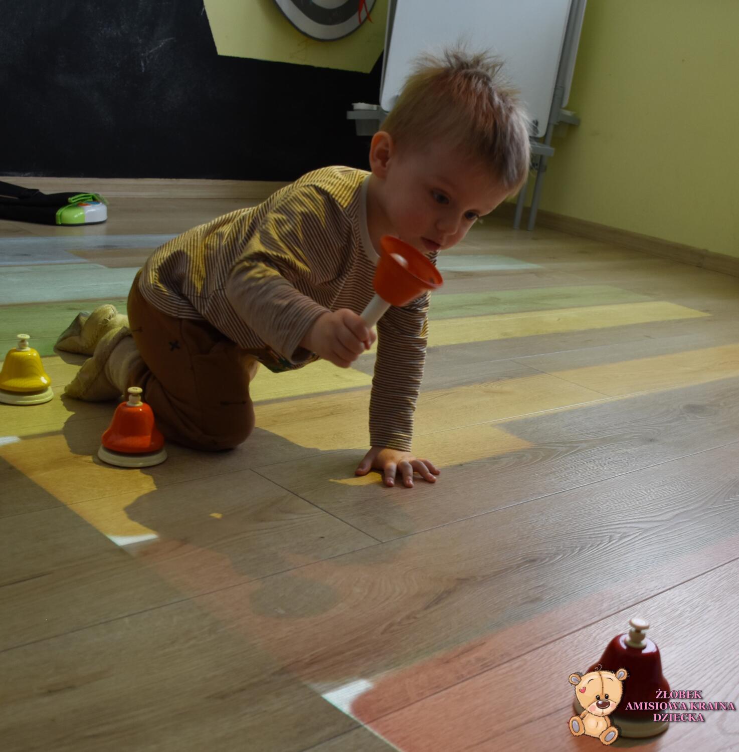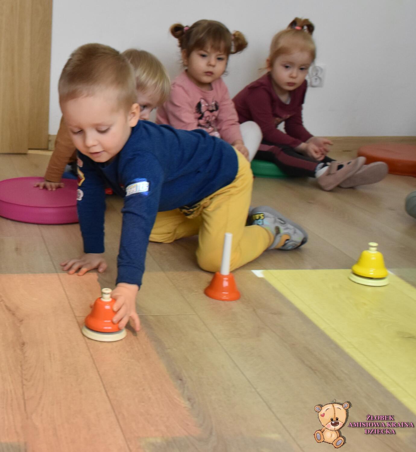 Na zajęciach rytmiki było kolorowo. Poznaliśmy dźwięki pianina, a może fortepianu…. A jaka jest różnica? Otóż na pianinie się ćwiczy, a na fortepianie występuje. Mają też inną budowę- trochę skomplikowaną. Ćwiczyliśmy naciskanie dźwięków na macie, oraz na dzwonkach, które są łatwiejsze dla naszych rączek. Ciocia opowiedziała nam ,że nie musimy znać nutek by grać, wystarczy znajomość kolorów, które utrwalaliśmy. Na koniec biegaliśmy w rytm dźwięków magicznego dywanu.