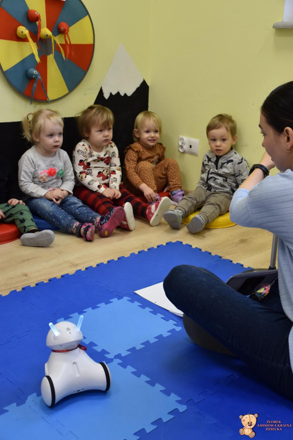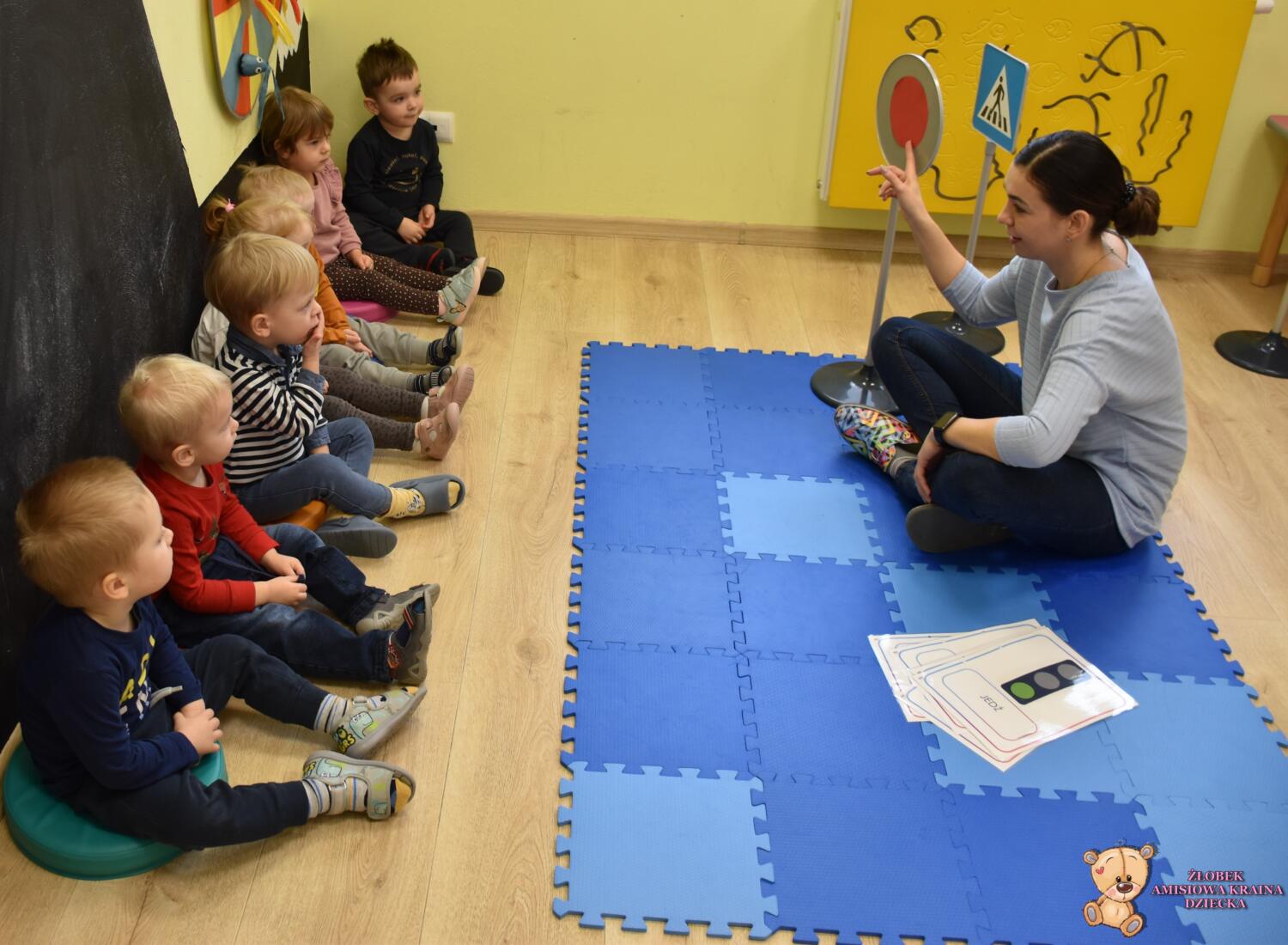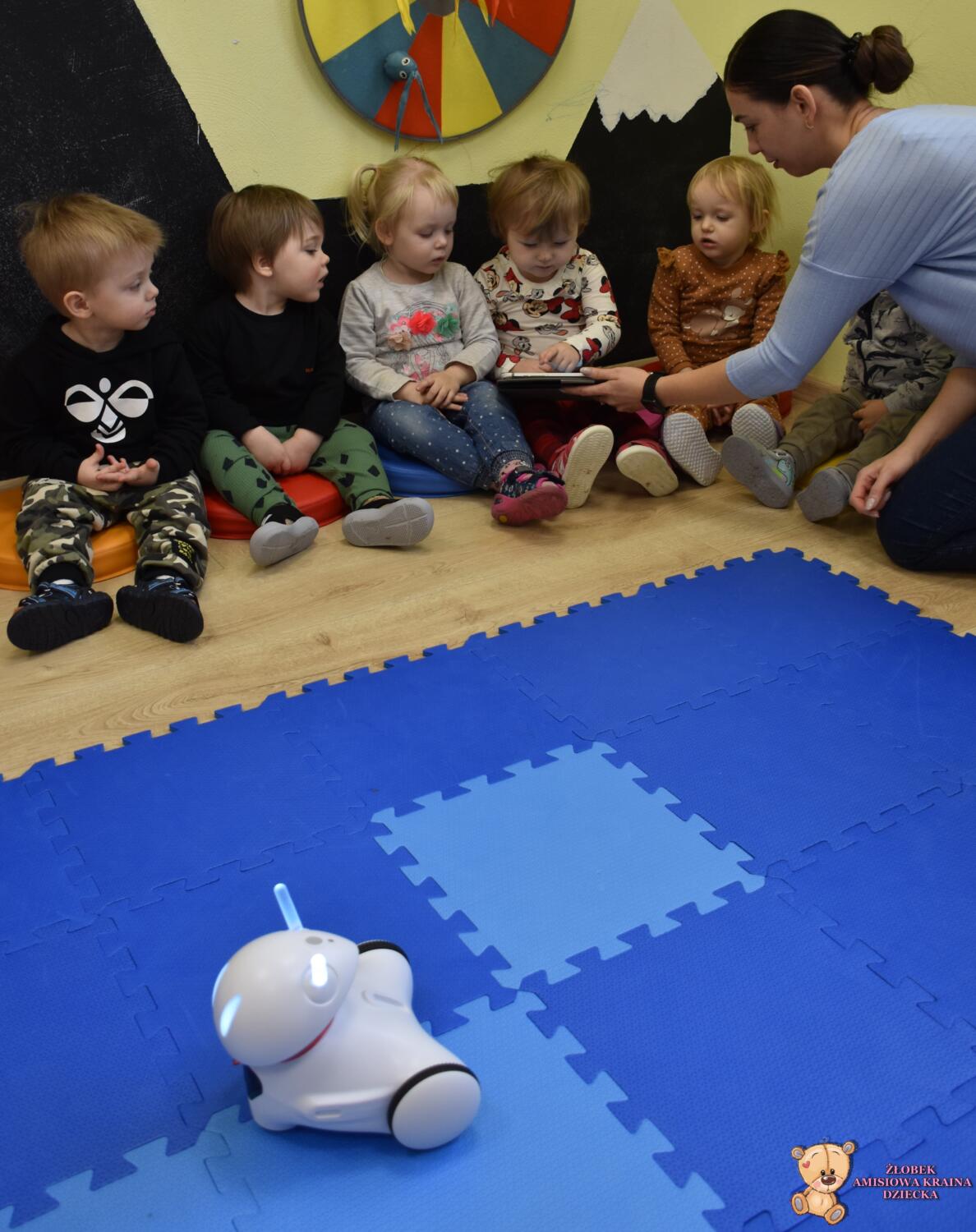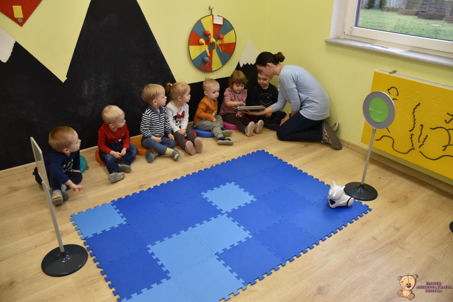 Dzieci wspólnie z robotem i panią Magdą oglądały sygnalizację świetlną
