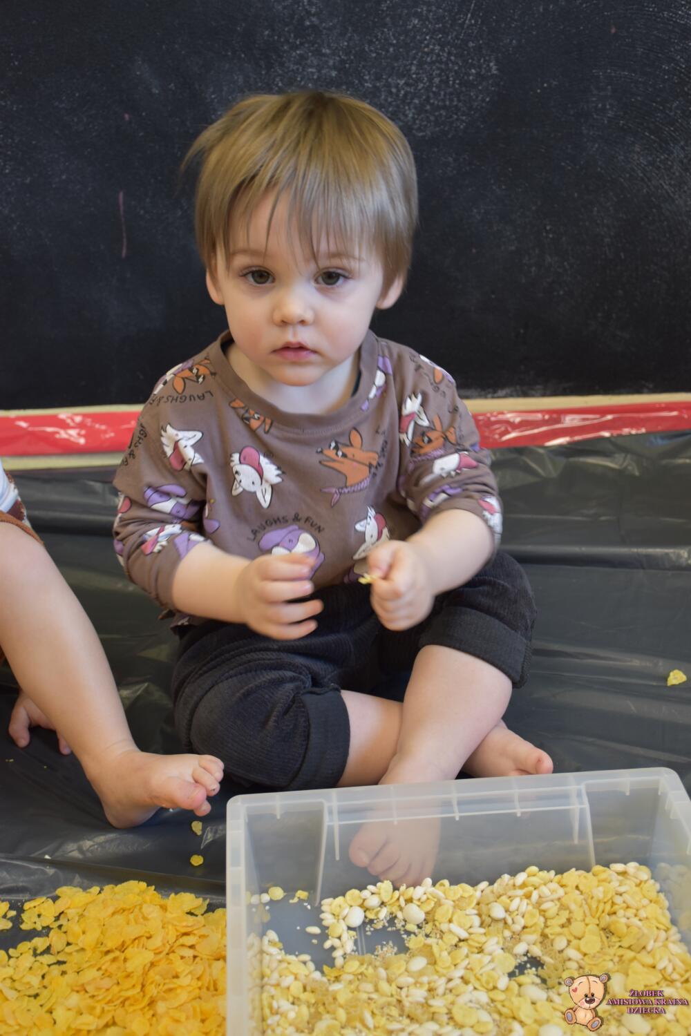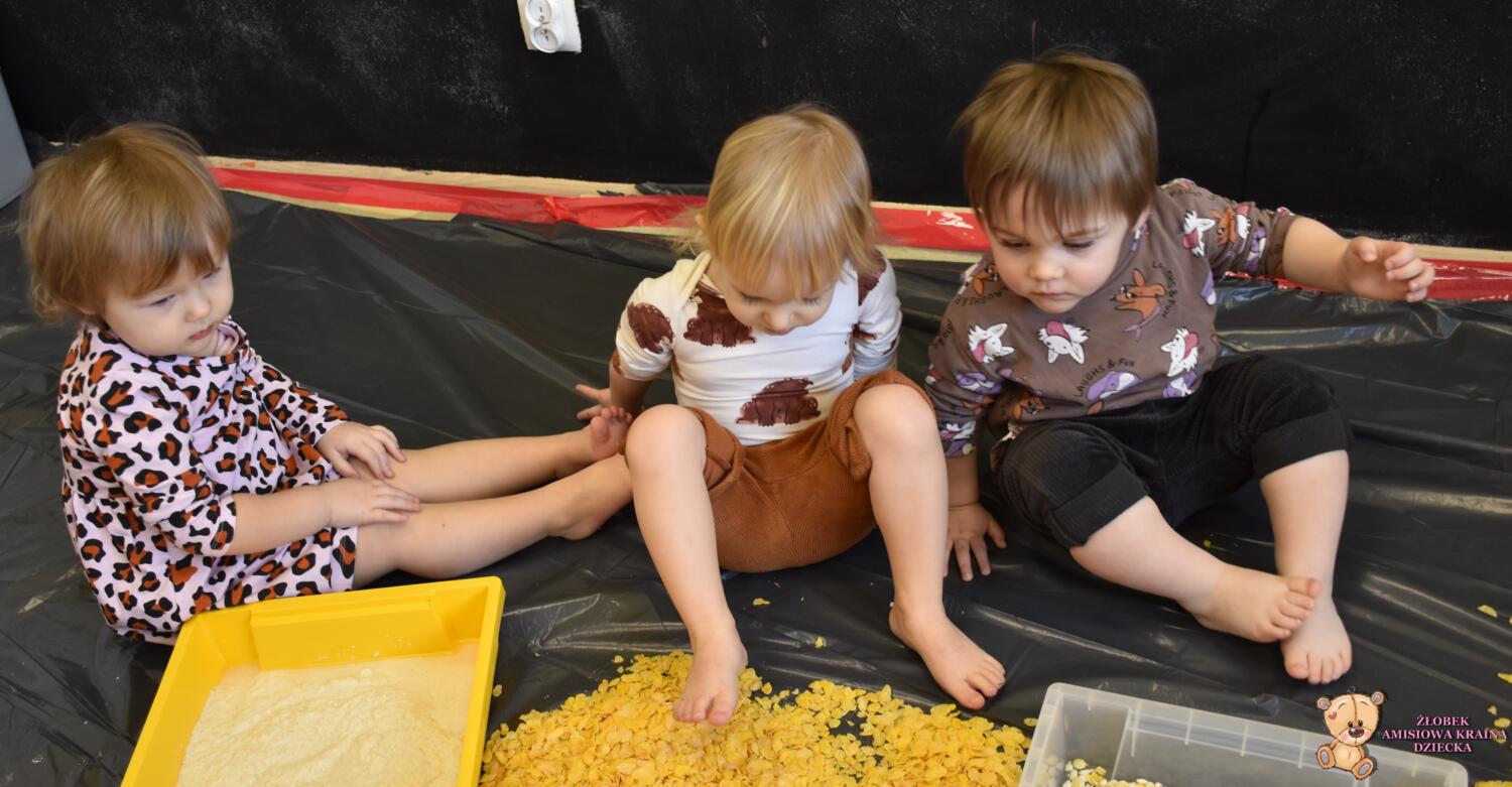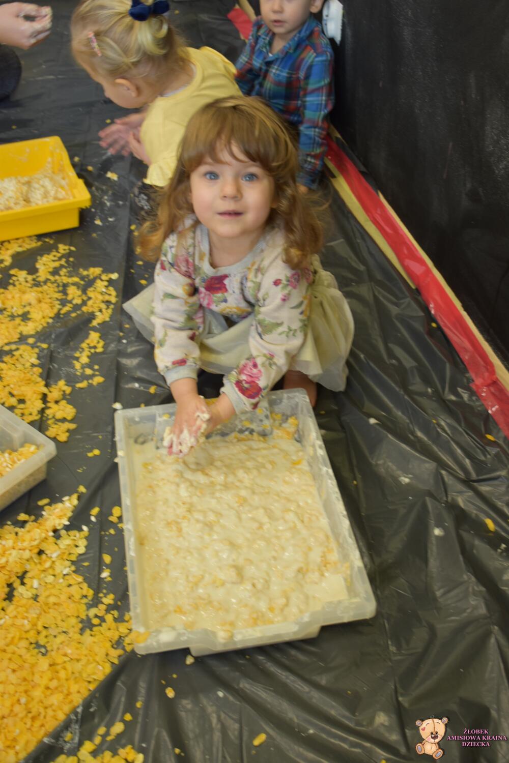 Dziś na zajęciach sensoplastyki tematem przewodnim były chrupki kukurydziane. Dzieci deptały ![]()