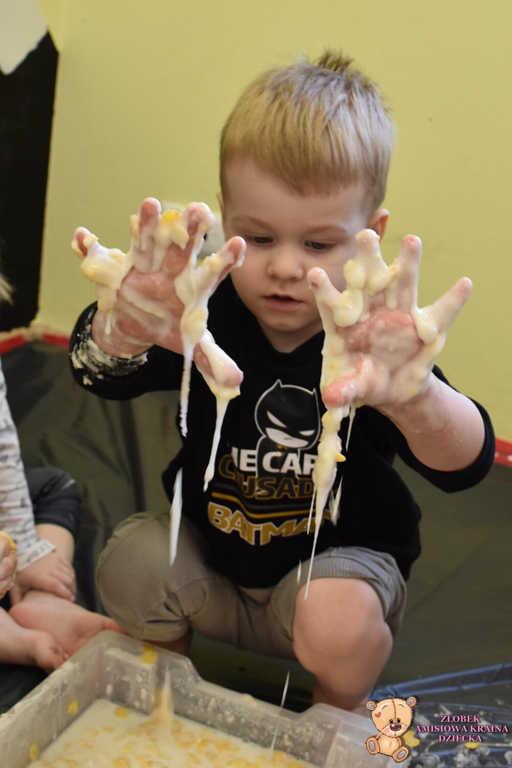 Dla tych którzy lubią się brudzić ciocia przygotowała kasze mannę oraz ciecz nieniutonowską. Dzieci wrzucały do nich chrupki tworząc nowe masy plastyczne. To była super zabawa! ![]()