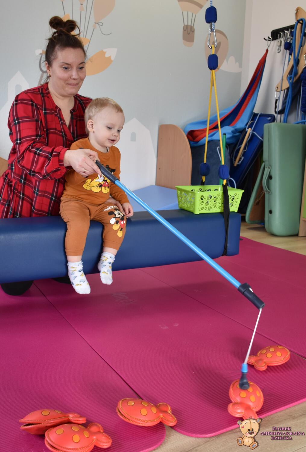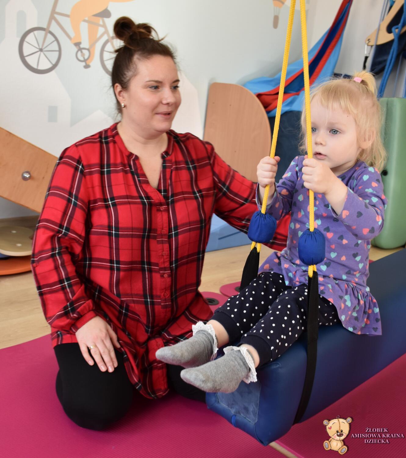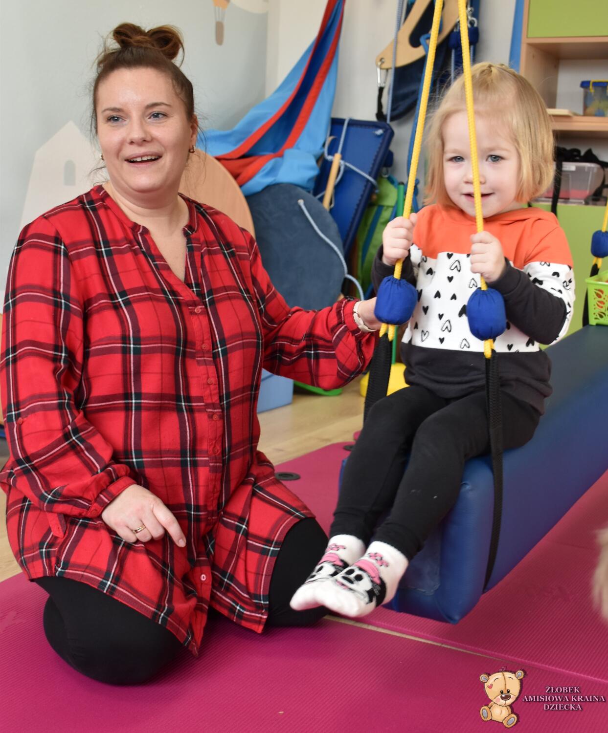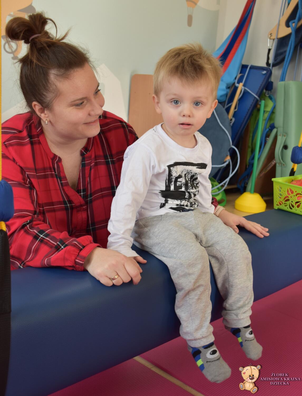 Dzisiaj na Integracji Sensorycznej Amisiaki stymulowały układ przedsionkowy na huśtawce typu konik.Ciocia łagodnie wprowadzała konik w ruch. Amisiaki huśtały się na brzuchu, w placach i w siadzie. Dzięki temu rozwijały świadomość własnego ciała oraz jego położenie w przestrzeni a także ćwiczyły równowagę. Niektóre odważne Amisiaki również podczas bujania rozwijały koordynację wzrokowo – ruchową, wskazywały różne przedmioty w sali. Ciocia jest z Was dumna. Wspaniale!